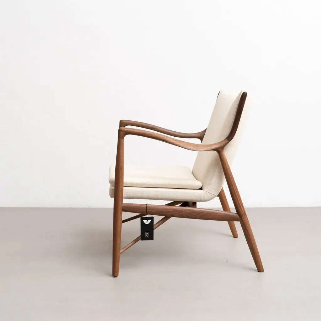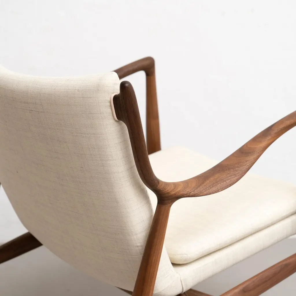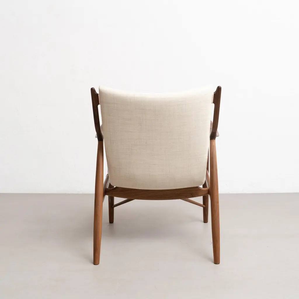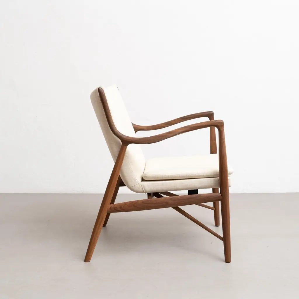Chair designed by Finn Juhl in 1945, relaunched in 2003.Manufactured by House of Finn Juhl in Denmark.In the Autumn of 1945, Finn Juhl presented the 45 Chair at the annual Cabinetmakers’ Guild Exhibition. Today, the chair is widely regarded as one of the most revolutionizing and iconic pieces within Danish furniture design. Finn Juhl dreamt of studying art history and his deep understanding of international contemporary art is abundantly clear in the bold 45 Chair. With its curved backrest and organic shape this chair cemented Finn Juhl as one of the leading designers of the 20th century. In a review on Finn Juhl's stand at the exhibition in 1945, the architect Erik Herløw wrote; “Most interesting about the exhibition is probably Finn Juhl's work. After many years of experiments, we now see a clarified result. Finn Juhl does not design on a refinement of traditions but has instead logically solved functions and therefrom shaped furniture on his terms. In the early years, Finn Juhl’s attempts seemed exaggerated, but now it is so much more interesting to observe the result he has achieved by going his own ways. Most beautiful is an armchair, where the frame is organically shaped as a bone, able to support the muscles of an arm and the weight of a body. The expression of the chair is reminiscent of a weapon, sharpened by human hands.”The 45 Chair is a true masterpiece and has become an icon of Finn Juhl’s universe of furniture. With this chair, Finn Juhl managed to create an, at the time, unseen design by separating the carried and the carrying elements. In reality, Finn Juhl had previously experimented with separating the upholstered parts from the wooden parts within his furniture, but with the sleek, strong and elegant 45 Chair this unique design characteristic manifested. On the 45 Chair the space between the frame and the seat creates a lightness, which combined with its organic shape and sublime detailing, ensures unique beauty and floating elegance. The chair appeals to all senses and pleases the eye and body alike. Furthermore, the 45 Chair has been called “the mother of all modern chairs” by the Japanese professor and design collector Mr. Noritsugu Oda. The groundbreaking 45 Chair became the prelude to the unfolding of Finn Juhl’s characteristic style of design that we know from the latter part of the 1940s. During this period, his designs are characterized exactly by liberating the seat and backrest as a single unit carried by the frame. This approach became a defining moment in establishing Finn Juhl’s status as a pioneer within furniture design.Dimensions:W: 66.5 cmD: 73 cmH: 88 cmSeat height: 42 cmImportant information regarding images of products:Please note that some of the images show other colors and variations of the model, these images are only to present interior design proposals. The item that is selling is on the first image. Important information regarding color(s) of products:Actual colors may vary. This is due to the fact that every computer monitor, laptop, tablet and phone screen has a different capability to display colors and that everyone sees these colors differently. We try to edit our photos to show all of our products as life-like as possible, but please understand the actual color may vary slightly from your monitorAbout the designer:Finn Juhl was born on January 30, 1912 in Copenhagen. He wished to study art history, however, his father would not allow it. Instead, Finn Juhl began studying architecture at the Royal Academy of Arts in Copenhagen. Here, he studied under some of the most influential functionalists of his time. Among these was the great architect Vilhelm Lauritzen who hired Finn Juhl at his own studio in 1934 before Finn Juhl had even graduated. Eventually, the work took up all of his time and Finn Juhl never finished his studies. Later in life he always described himself as a self-taught furniture designer. One of the international highlights of Finn Juhl’s career was designing the complete interior of the Trusteeship Council Chamber at the UN headquarters in New York between 1951 and 1952. His sculptural furniture is widely appreciated all-over the world. Today, Finn Juhl is still considered the father of Danish Modern, the design movement from Denmark, that arose during the 1950s in the United States. At the time of his death in 1989, Finn Juhl had become an award-winning and highly respected international furniture artist. Finn Juhl was greatly inspired by both modernism in art and functionalism in architecture. His genius was cross-pollinating these two fields, thus creating a completely new artistic idiom. Like sculptures, Finn Juhl’s designs are created to stand freely in a room. At the same time, they are developed with a playful insight into the practical function of every detail. About the manufacturer:In 2001 House of Finn Juhl trusted with the exclusive rights to manufacture and relaunch Finn Juhl’s sculptural and iconic furniture by Finn Juhl’s widow Hanne Wilhelm Hansen. Today the unique Finn Juhl collection consists of more than 40 Classic masterpieces, all of which they manufacture with the utmost respect for the original heritage and strict demands for quality.