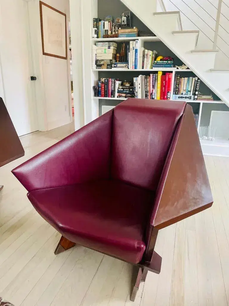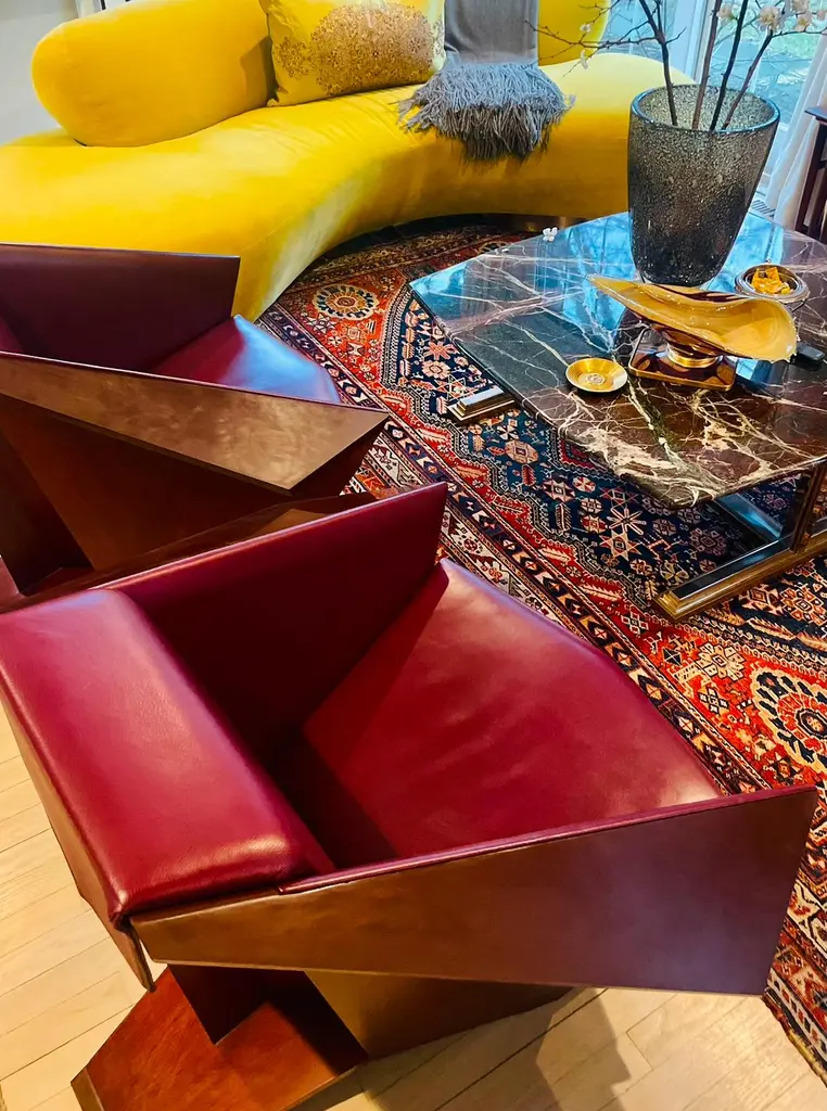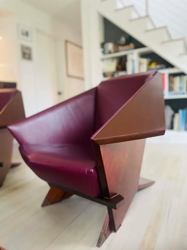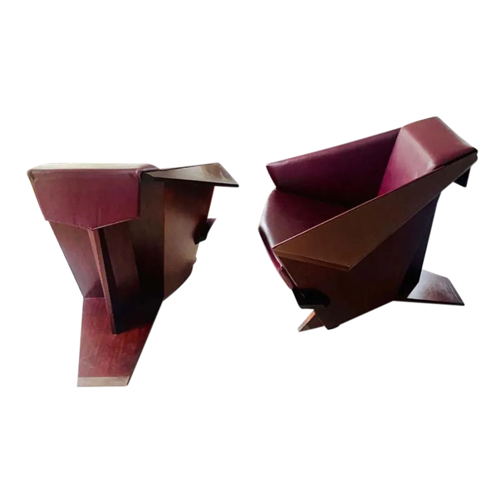 Stunning first edition pair of Taliesin Chairs by Frank Loyd First Edition Cassina, Numbered and Signed, in Oxblood Leather Seat and Cushion and made out of a single piece of folded plywood with brass details on the feet and back. Of note, hese chairs were re-issued recently in a very limited production (they were in fabric, considerably lighter and without the brass details) and the entire series was sold off almost immediately. In 1949, Frank Lloyd Wright designed the Taliesin 1 armchair, also known as the origami chair, for the Garden Room in Talesin West, his home-studio in Scottsdale. Constructed from a single piece of folded plywood, it is frequently called ‘Origami’ because of the way it recalls this Japanese art. The first reedition of the Taliesin 1 armchair was produced by Cassina between 1986 and 1990 - our pair was made in year 1986 and features the numbers 263 and 256 - under the guidance of Professor Filippo Alison, who studied the original drawings and conducted significant research in order to construct the perfect re-edition. In the beginning of his career Wright created furniture featuring classic forms and balanced proportions while he later on began to explore more sophisticated solutions in furniture design and experimenting with far more complex designs - the Taliesin 1 has a complex geometrical structure that ensures the stability of the chair.