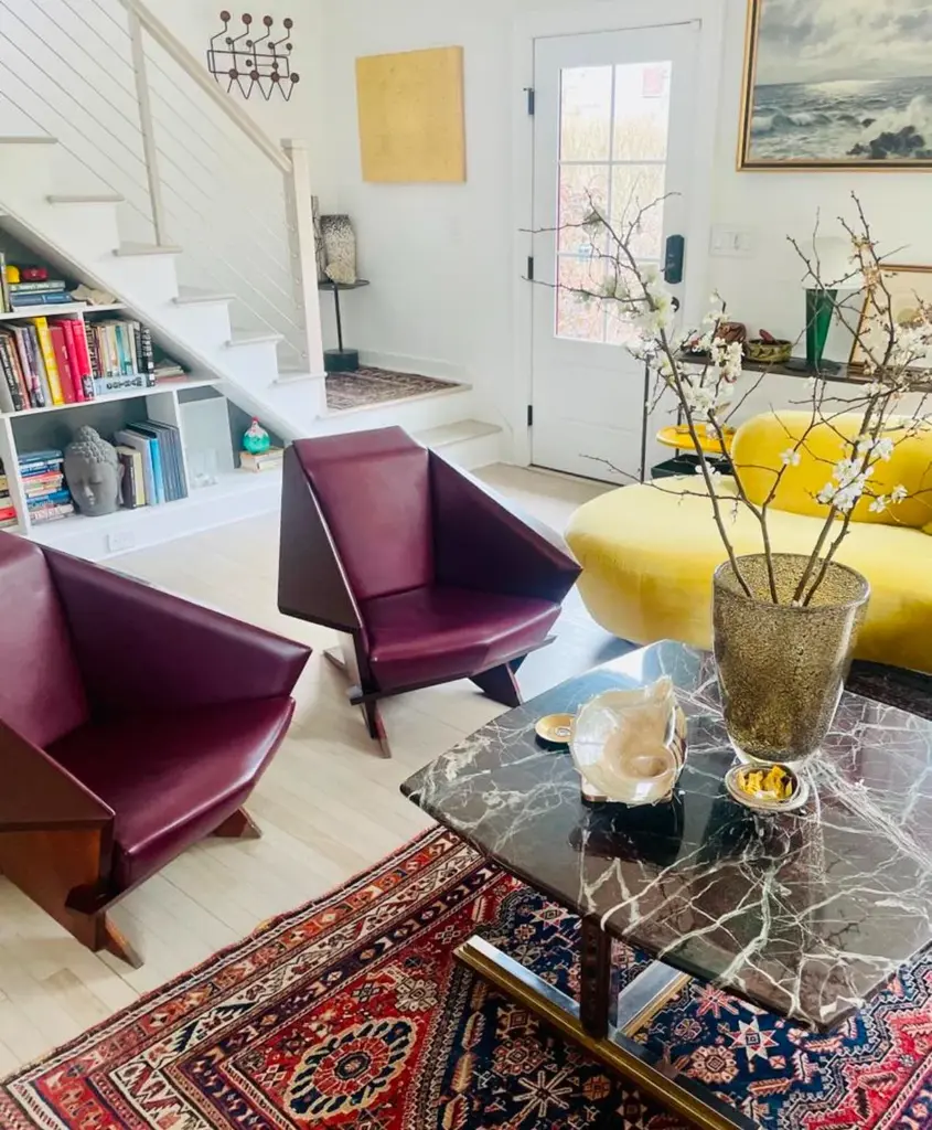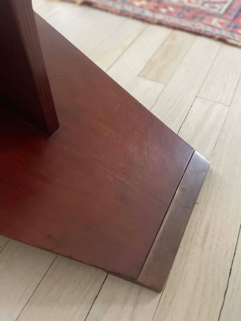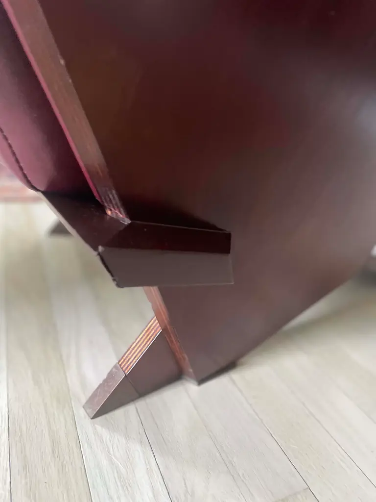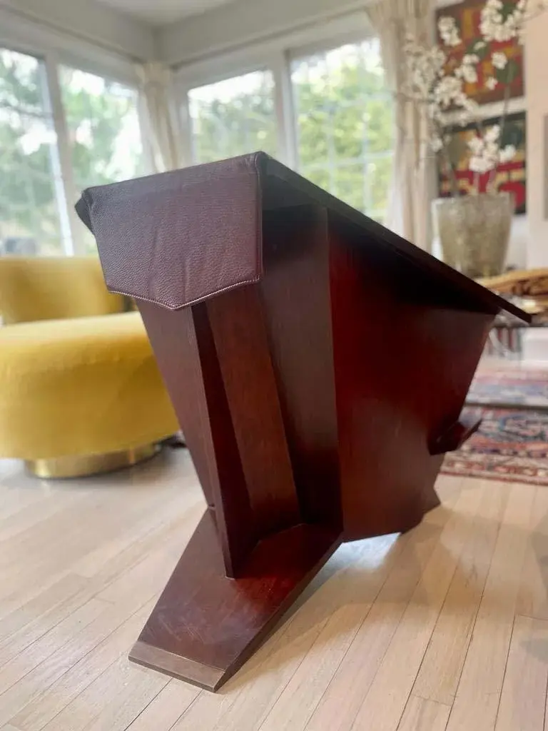 Stunning first edition pair of Taliesin Chairs by Frank Loyd First Edition Cassina, Numbered and Signed, in Oxblood Leather Seat and Cushion and made out of a single piece of folded plywood with brass details on the feet and back. Of note, hese chairs were re-issued recently in a very limited production (they were in fabric, considerably lighter and without the brass details) and the entire series was sold off almost immediately. In 1949, Frank Lloyd Wright designed the Taliesin 1 armchair, also known as the origami chair, for the Garden Room in Talesin West, his home-studio in Scottsdale. Constructed from a single piece of folded plywood, it is frequently called ‘Origami’ because of the way it recalls this Japanese art. The first reedition of the Taliesin 1 armchair was produced by Cassina between 1986 and 1990 - our pair was made in year 1986 and features the numbers 263 and 256 - under the guidance of Professor Filippo Alison, who studied the original drawings and conducted significant research in order to construct the perfect re-edition. In the beginning of his career Wright created furniture featuring classic forms and balanced proportions while he later on began to explore more sophisticated solutions in furniture design and experimenting with far more complex designs - the Taliesin 1 has a complex geometrical structure that ensures the stability of the chair.