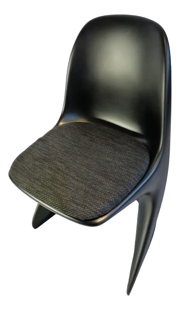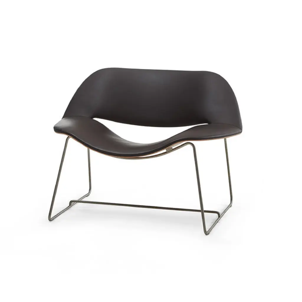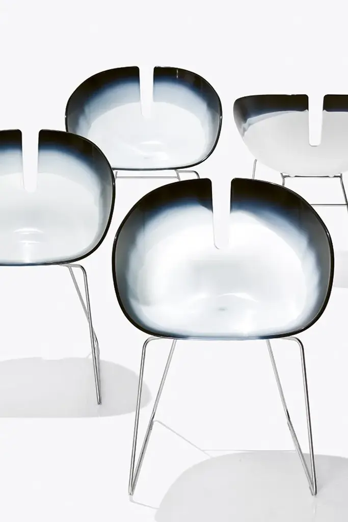 Fjord H is a sled chair. Shell is multilayer technopolymer; base is satin stainless steel.From a piece of seashell, which has been broken and smoothed by the waves, Patricia Urquiola has designed a collection of seats for both the home and public spaces. As the name suggests, there is a strong Scandinavian influence with references to Arne Jacobsen and the inlets of northern coastlines represented in the long cut-away. Like a natural cycle where the shell is reborn through the effects of time and water, the chair becomes armchair and then stool. Its broken form and abstract concept together become an object of design: smooth lines that support and envelop are picked out in decorative stitching in harmony with the essence of the chair’s structure.