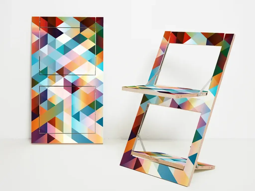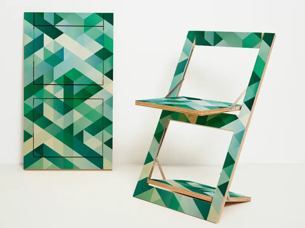 This folding chair doesn’t need to hide like most of his fellows. FLÄPPS is a mere 20 mm flat and his beautiful art-prints make him a fashionable decorative object even when folded. Easy to open and easy to close with a single snap. A chair to stow, print and adore. Due to its unique folding mechanism, FLÄPPS is always ready to use.Design: Malte GriebProduct development: Sebastian Feucht/eco3plan, Mason Juday, Stefan KnorrFläpps Folding Chair in birch plywood with clear varnish.Material: birch plywood, stainless steelDimensions: 840x470x20mmSeat height: 45 cmFinish: Lacquer