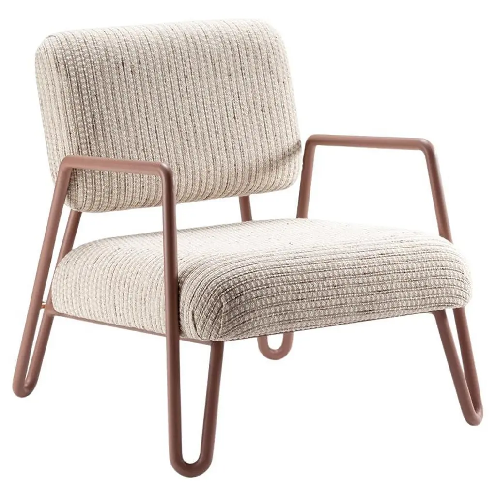 This elegant chair has a sand powder-coated steel frame. The steel frame shell is entirely moulded in polyurethane and upholstered with fabric Galaxy.