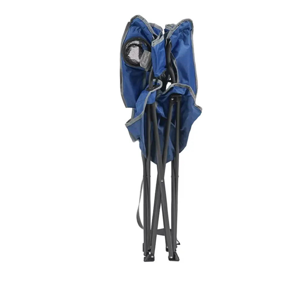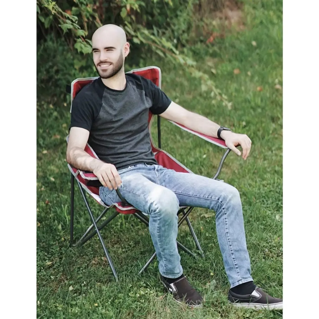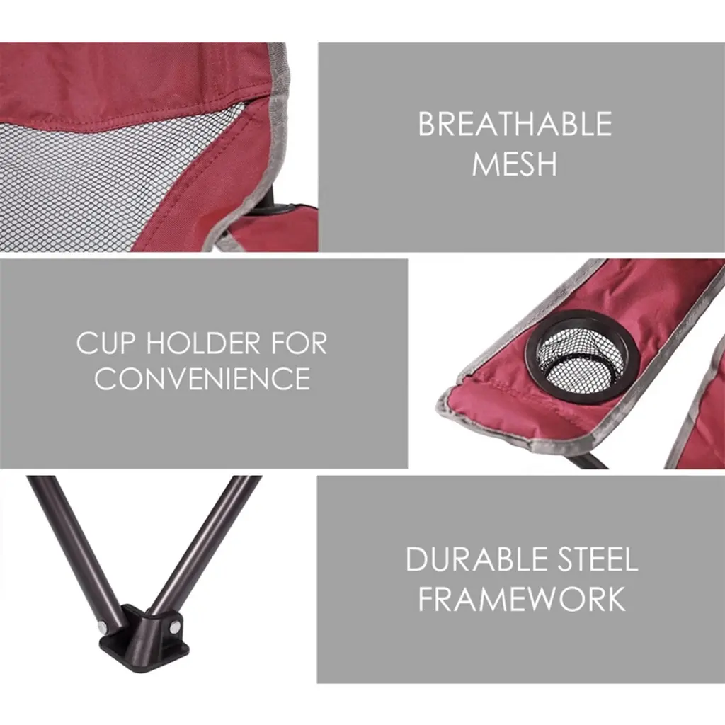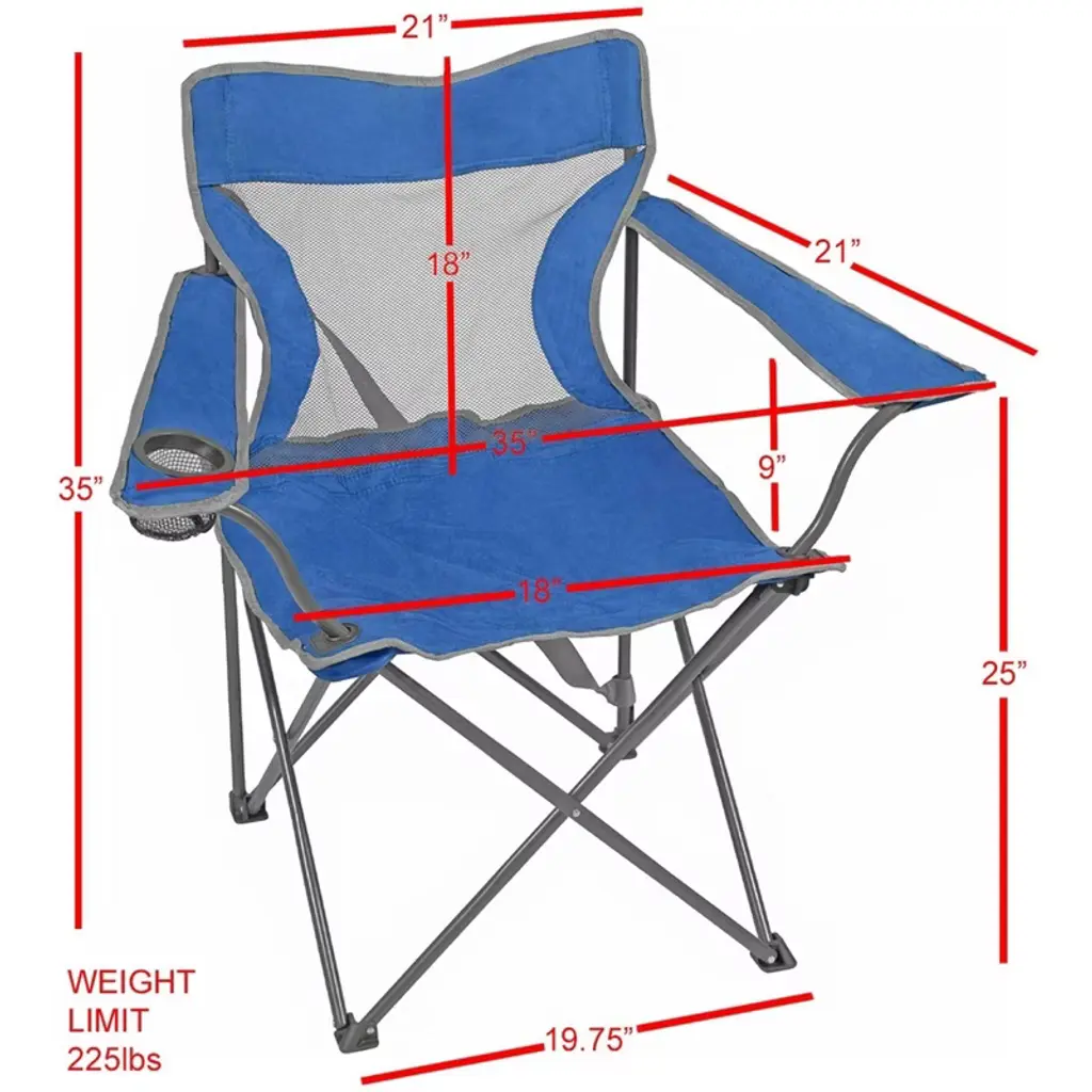 Designed for those who value relaxation on the go, these extra-large chairs offer unparalleled comfort and durability. Crafted with a sturdy steel powder coat frame, this chair is built to last. The self-enclosing feature securely closes with a convenient hook and loop strap, eliminating the need for a cumbersome carry bag. Simply fold it up and you're ready to hit the road. Constructed from premium-quality 600D polyester fabric, the camping chair boasts a mesh back and ventilated nylon mesh lumbar section, providing optimal airflow for maximum comfort. Measuring 22” x 37.75” x 35.25” inches, with a weight capacity of approximately 250 pounds. Additionally, the chair features a convenient cup holder, allowing you to keep your favorite beverage within arm's reach at all times. Lightweight at only 6.16 pounds, it's easy to carry and transport wherever your adventures take you.