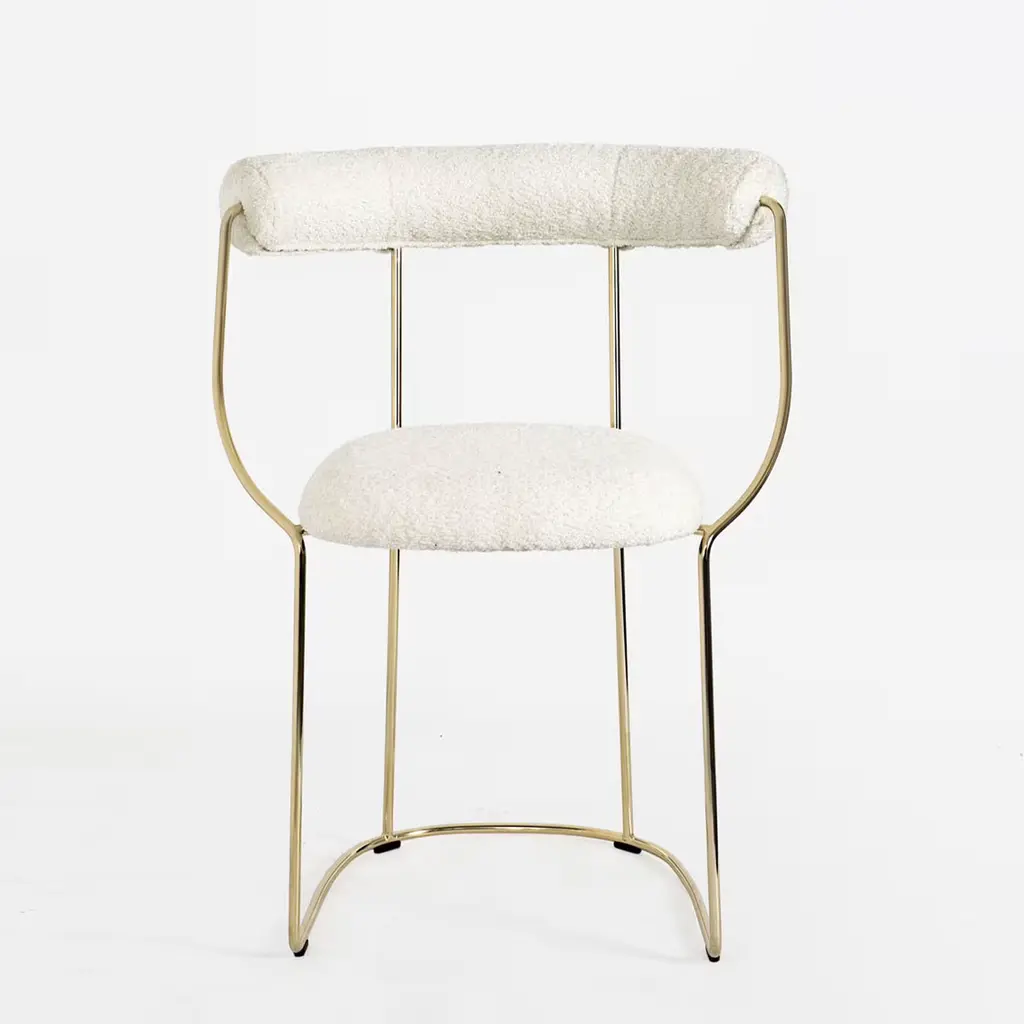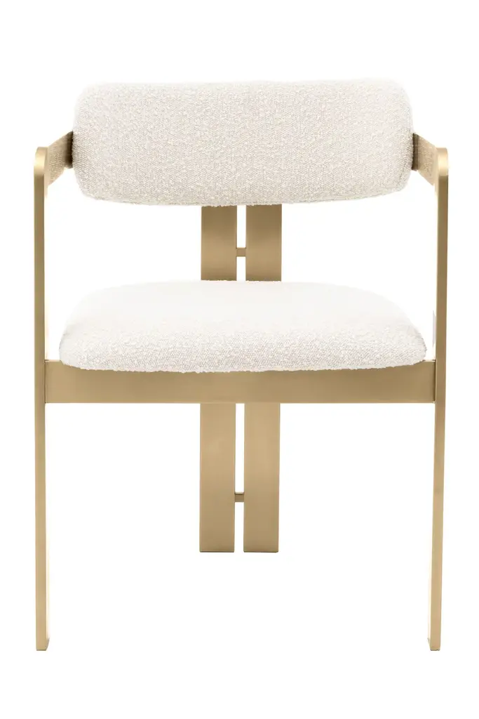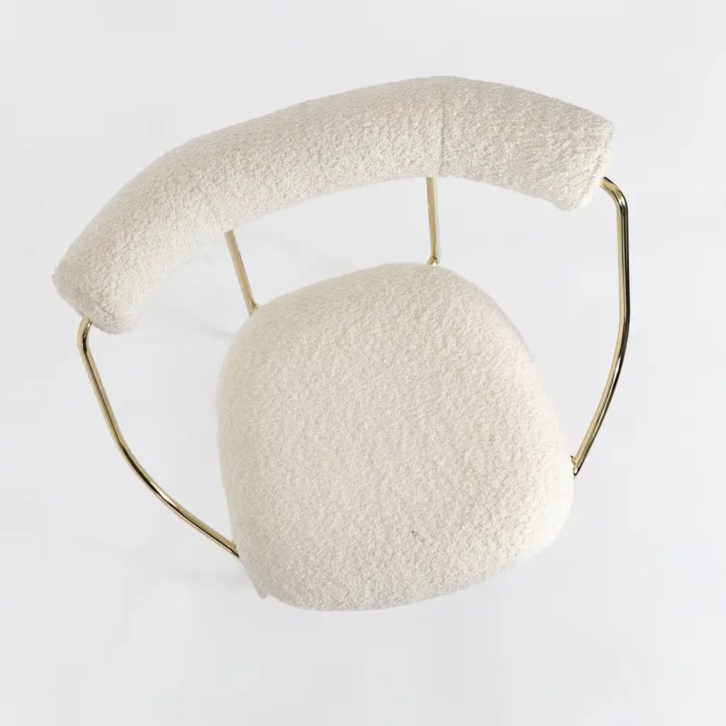 Merging ergonomic comfort and aesthetic allure in a sleek and seamless design, this chair is handmade of metal, finished in polished gold, combined with a softly padded seat and backrest upholstered in white bouclé fabric. Also available in ultra black or brushed brass, in velvet or other colors upon request, please contact the Concierge for further information.