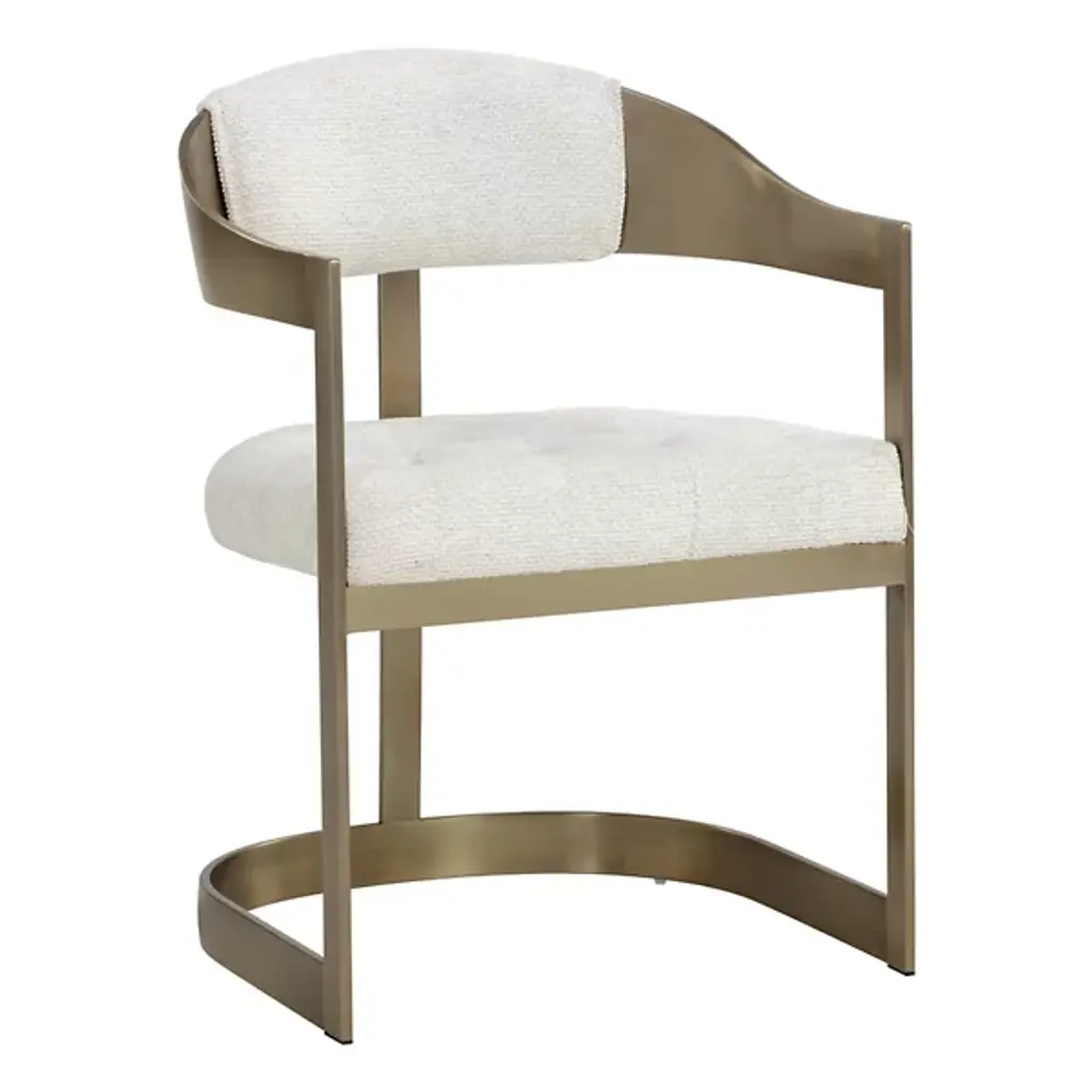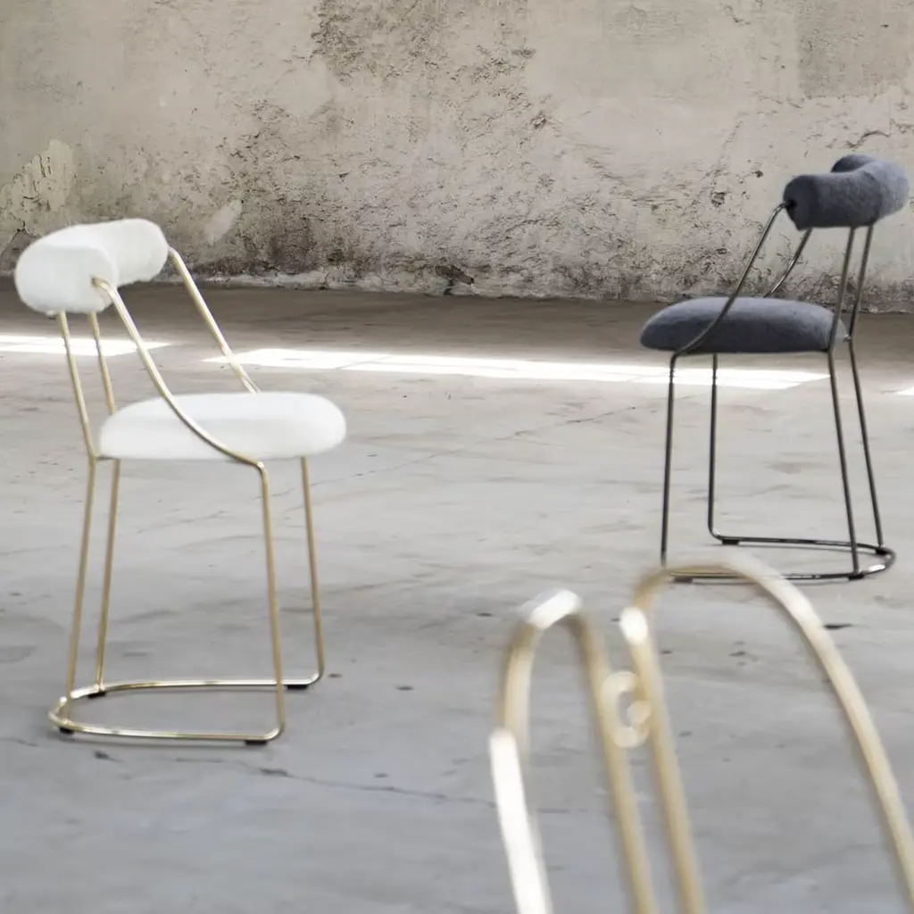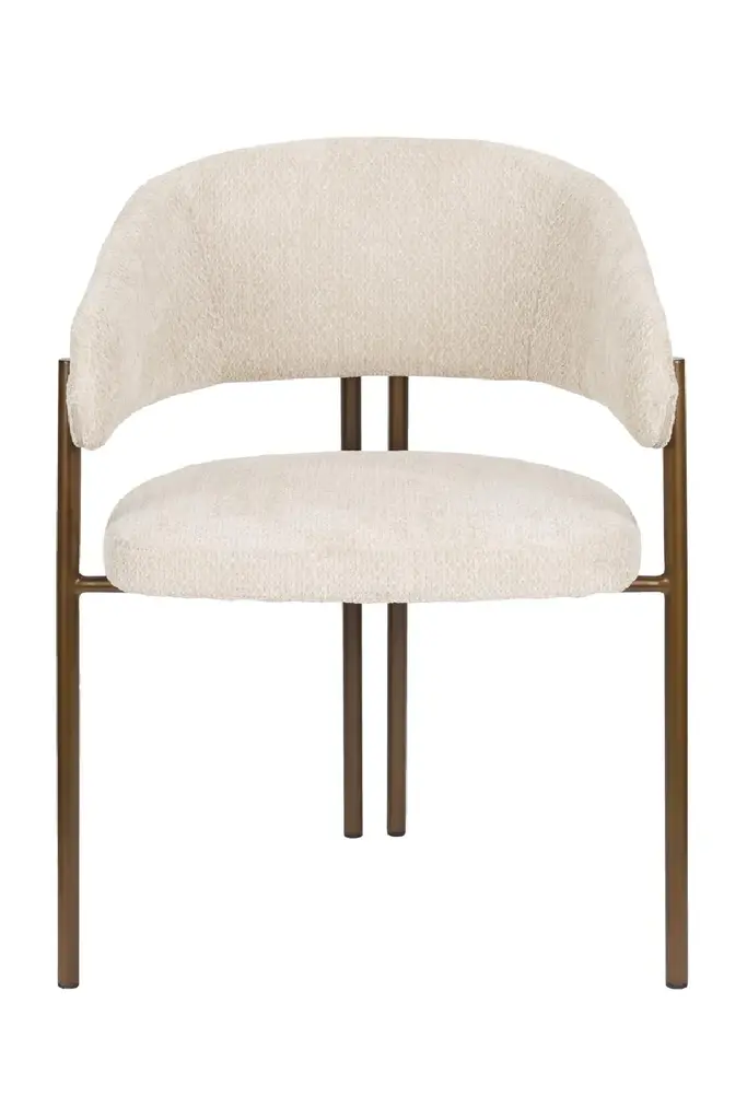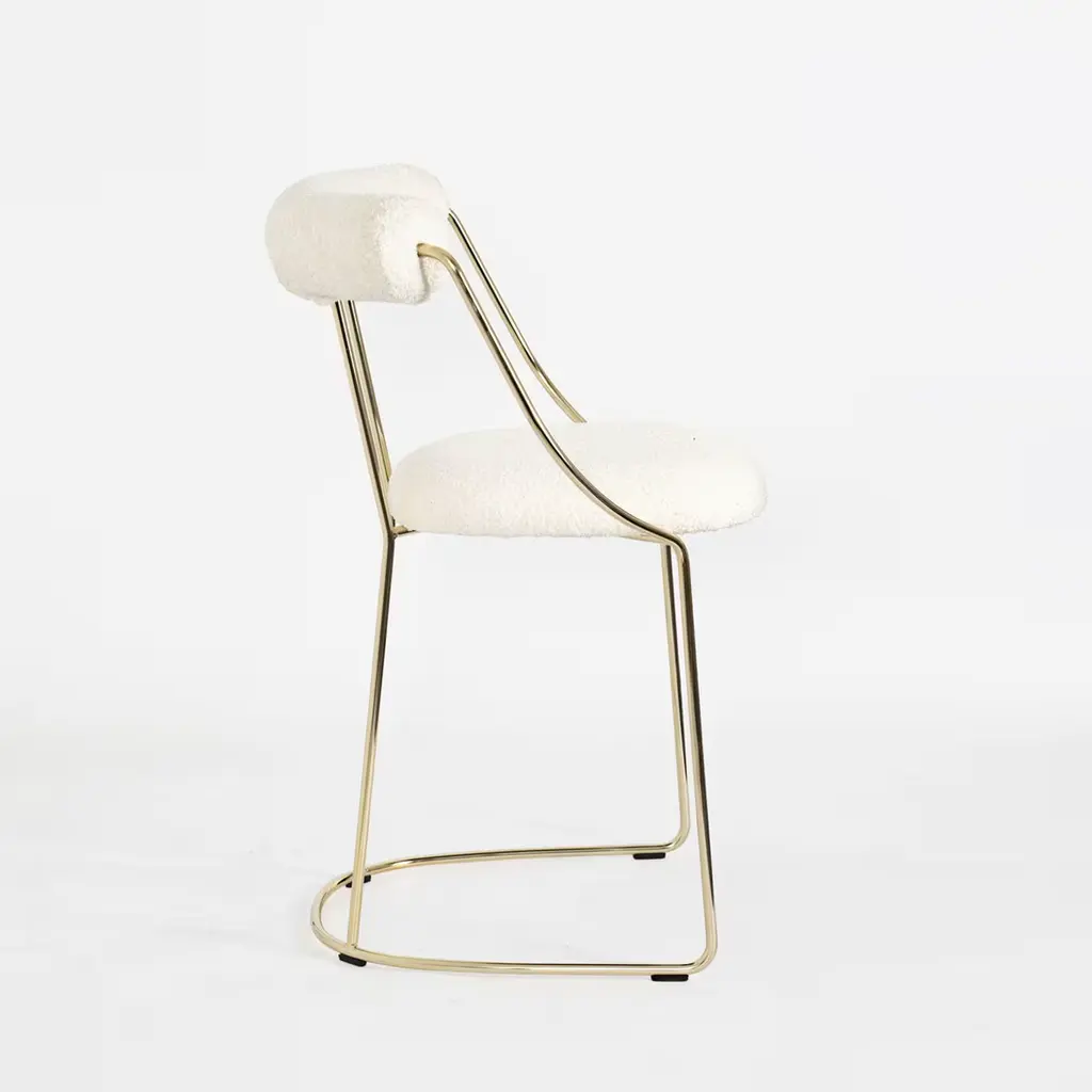 Merging ergonomic comfort and aesthetic allure in a sleek and seamless design, this chair is handmade of metal, finished in polished gold, combined with a softly padded seat and backrest upholstered in white bouclé fabric. Also available in ultra black or brushed brass, in velvet or other colors upon request, please contact the Concierge for further information.
