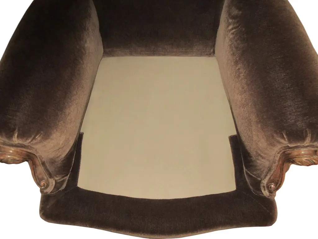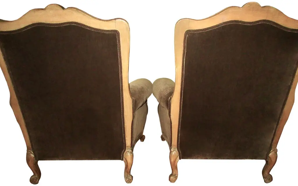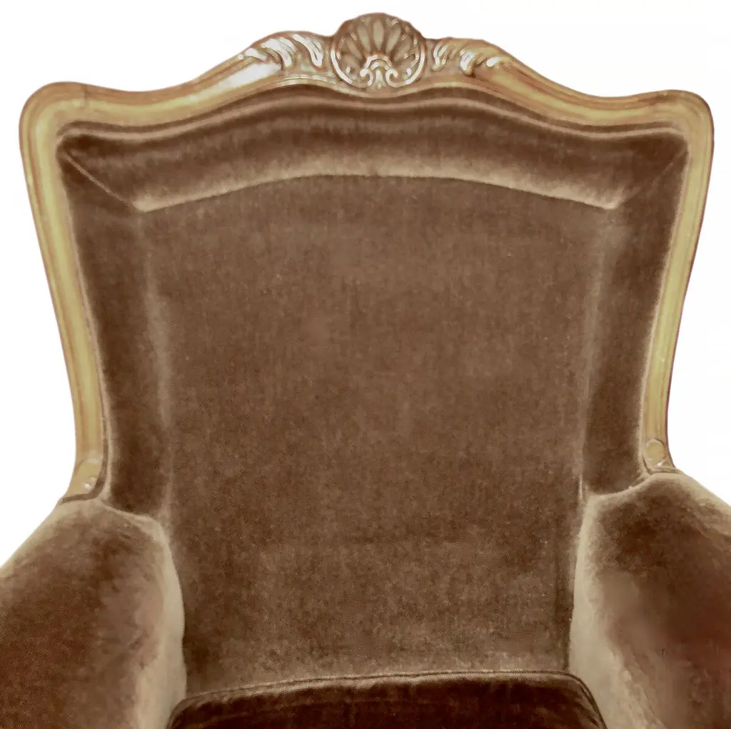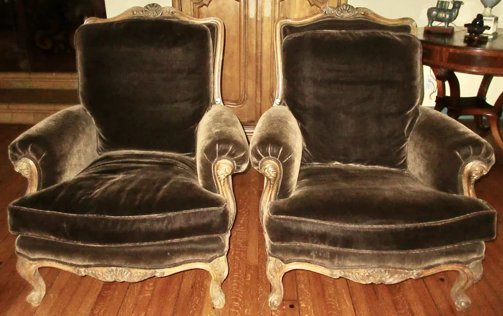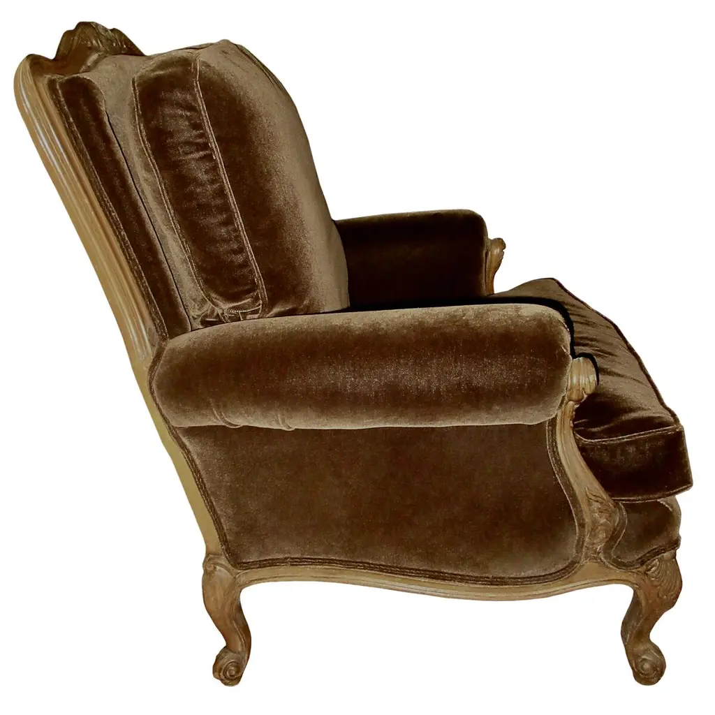 Fabulous pair of 19th century French bergeres. Sourced from Paris's wonderful St. Ouen flea market, shipped to the U.S., and reupholstered in rich dark chocolate mohair. Down and feather filled. Mohair is strong, a great fabric for people with pets. Don't spend less on another pair of chairs that your pet will destroy and force you to reupholster. Buy this pair!
