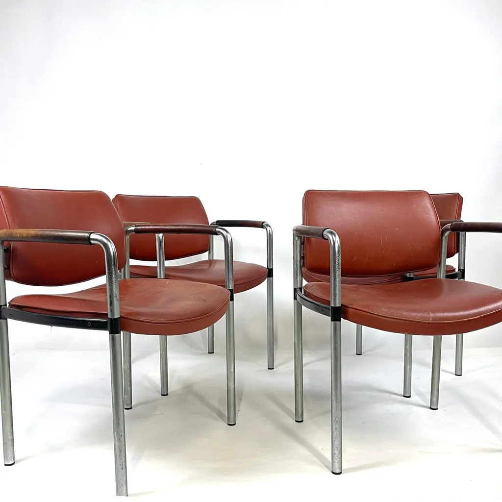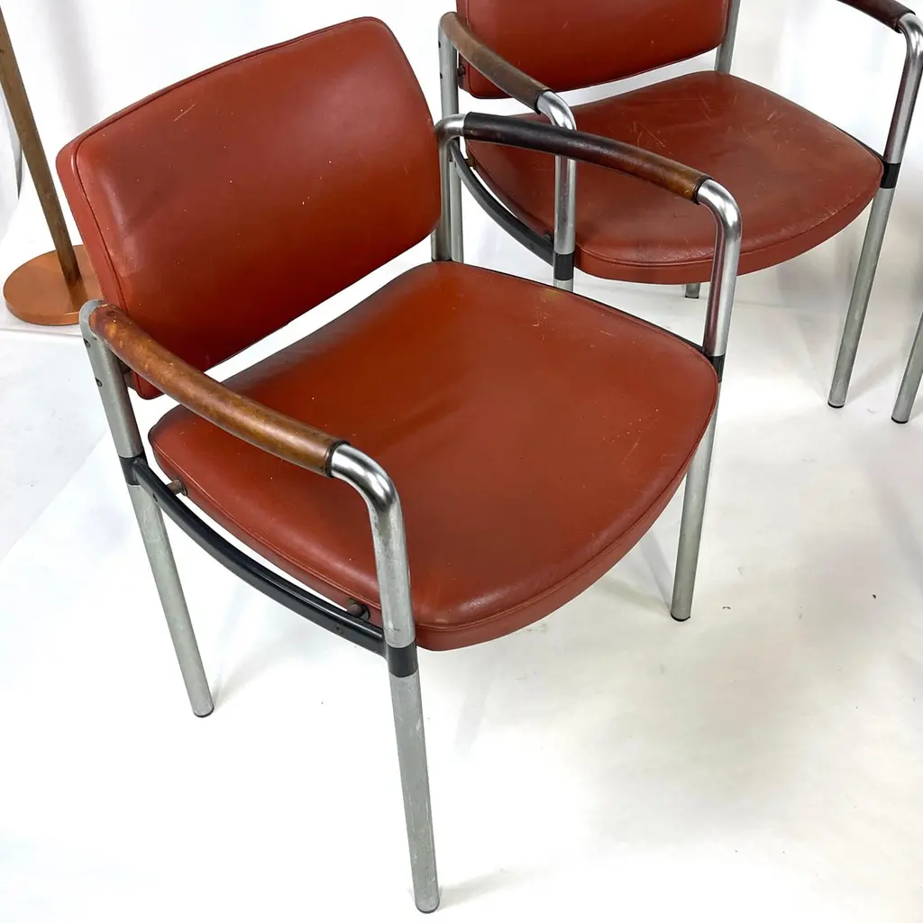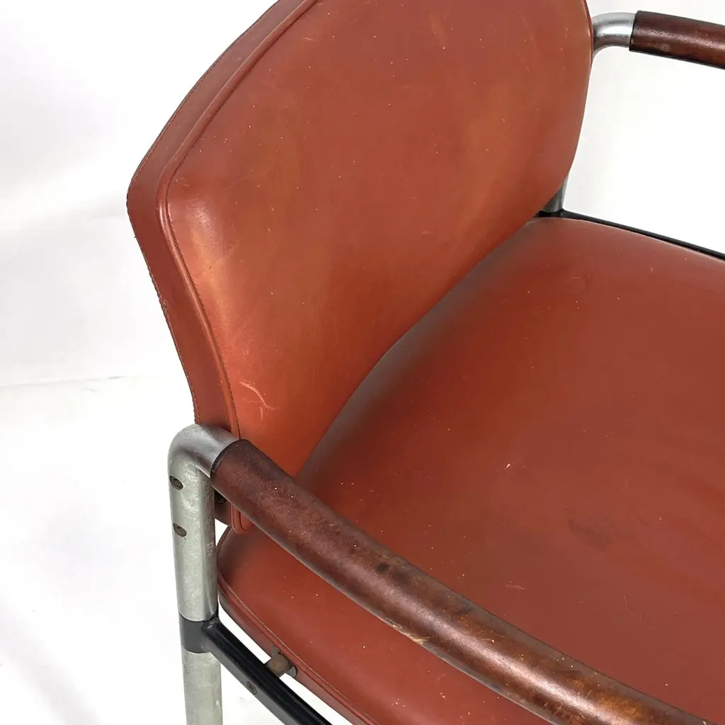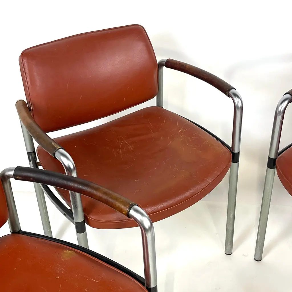Very heavy chairs. Stunning French Modernist chairs with a beautifully patinated leather arm detail. Solid steel frames with solid black metal detail on the frame. These chairs are from France- maker unknown. The quality and heft are remarkable. Exceptionally strong and comfortable chairs.4 available- priced per chairThe leather shows very nice patina commensurate with age and use. Two of the leather chairs exhibit a small tear and one shows discoloration- see last 3 photos. Some surface scratching on the leather as well. Overall still in very nice, usable condition.