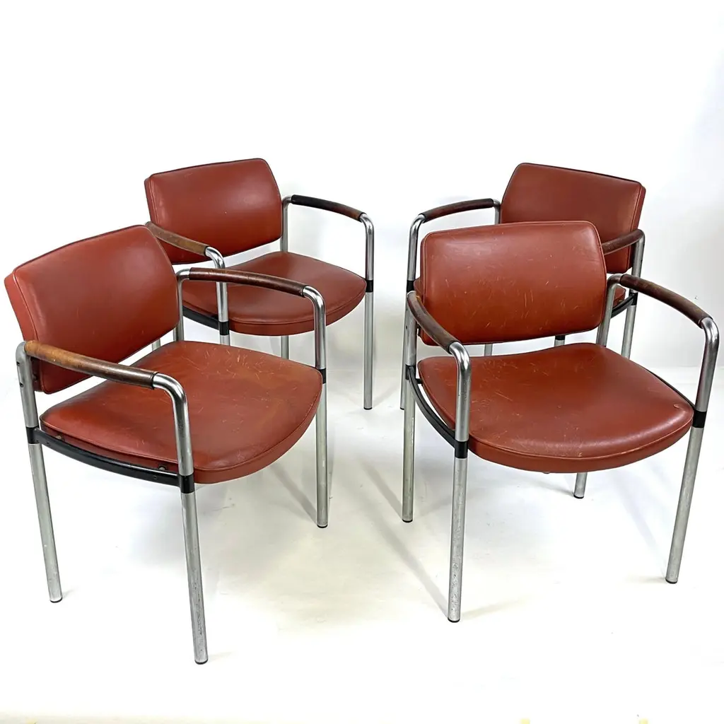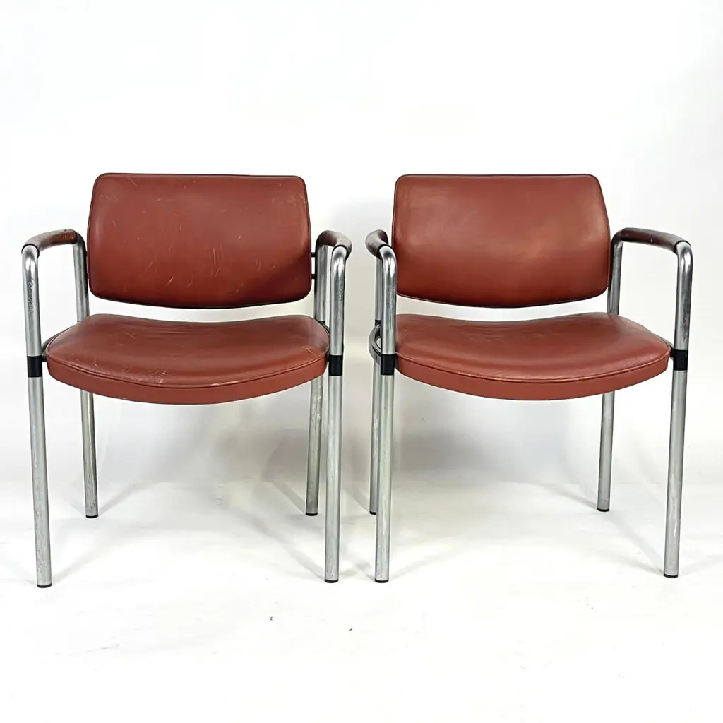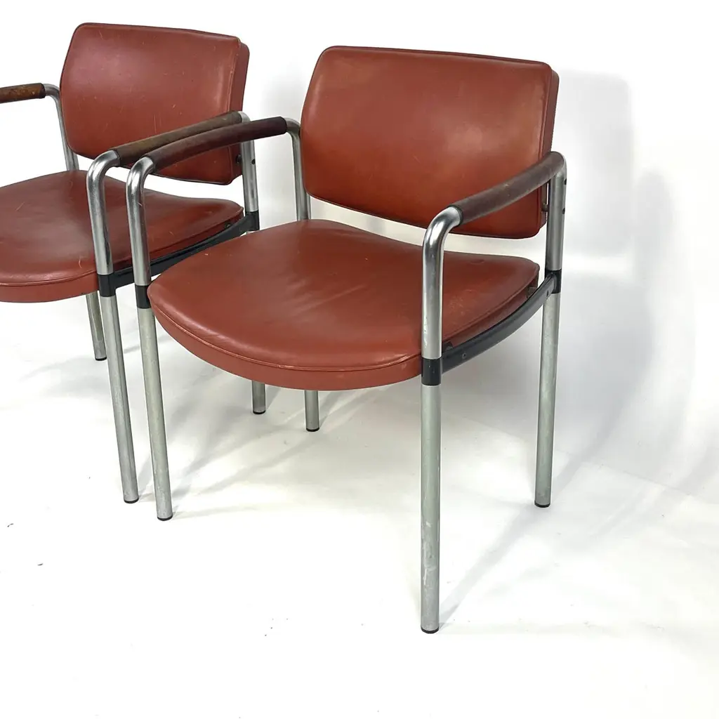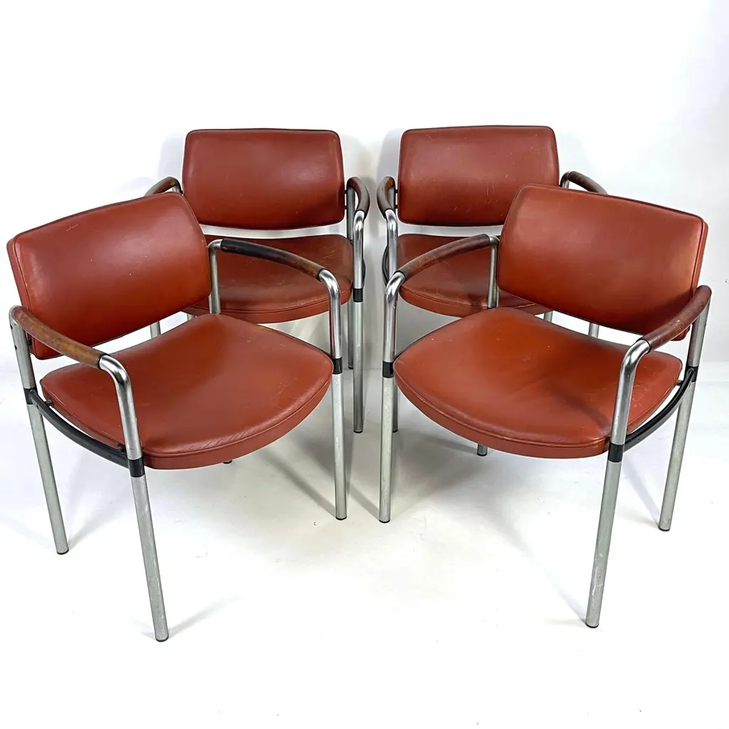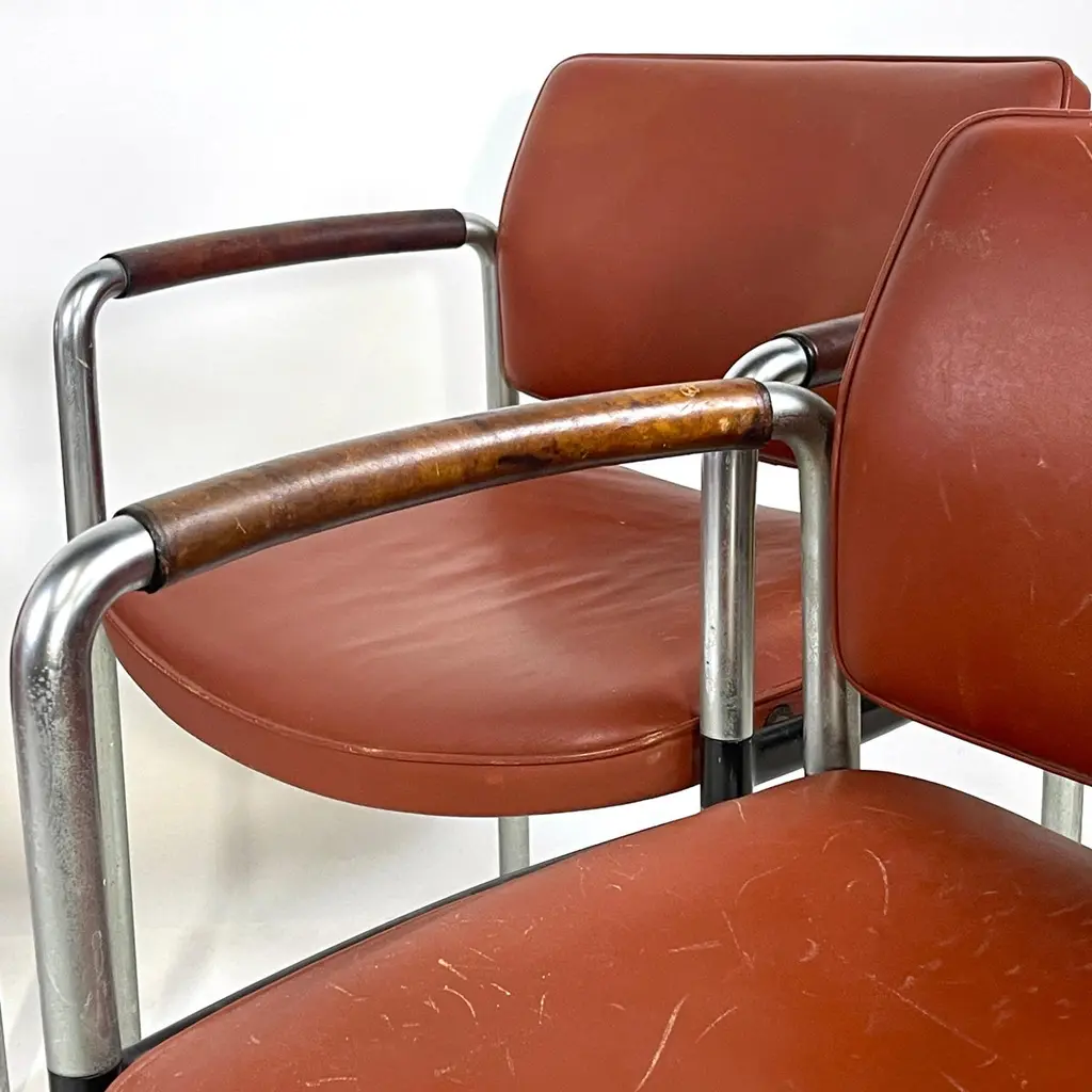 Very heavy chairs. Stunning French Modernist chairs with a beautifully patinated leather arm detail. Solid steel frames with solid black metal detail on the frame. These chairs are from France- maker unknown. The quality and heft are remarkable. Exceptionally strong and comfortable chairs.4 available- priced per chairThe leather shows very nice patina commensurate with age and use. Two of the leather chairs exhibit a small tear and one shows discoloration- see last 3 photos. Some surface scratching on the leather as well. Overall still in very nice, usable condition.
