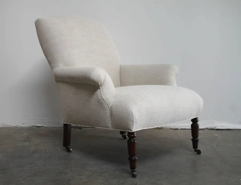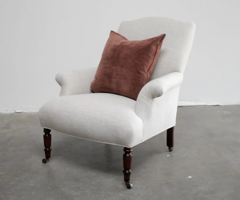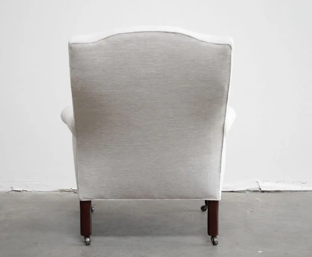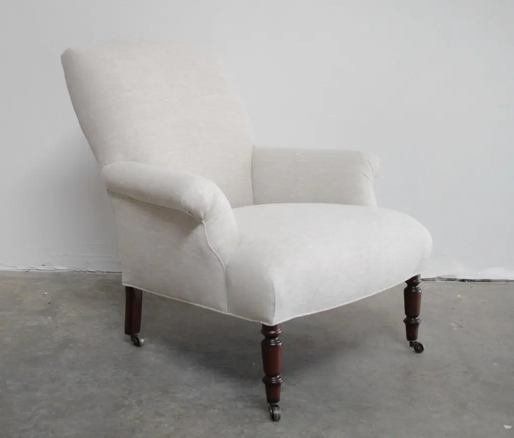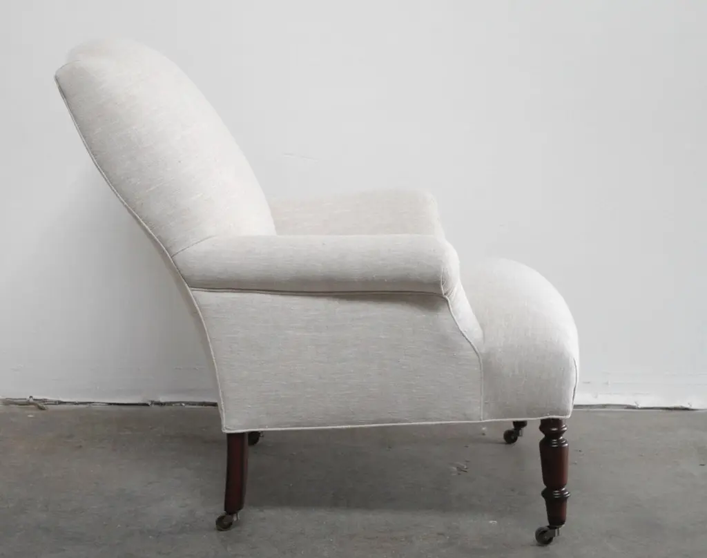 French inspired upholstered linen bergère chairsThese French inspired chair are based on an original Napoleon III style pair of chairs. Napoleon III was the nephew of the Napoleon that we are all familiar with. This style dates from the mid- to late 19th century, France. This chair has antique brass casters on all legs and is low and deep with Classic lines and proportions.We offer four colors of linen from Libeco-Lagae, a Belgian company that has been making linen since the 1850s.Size: 32" wide x 34" deep x 37" tallSeat height 17"Stain: FruitwoodPriced with Belgian linen, slip covers available.Shown in Oatmeal Belgian Linen.