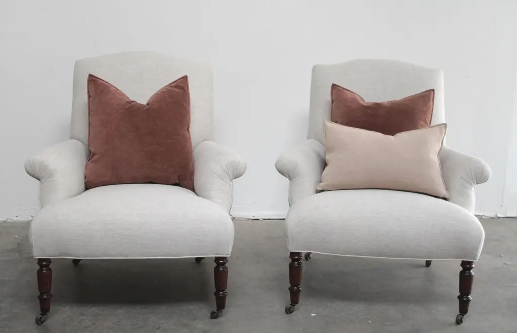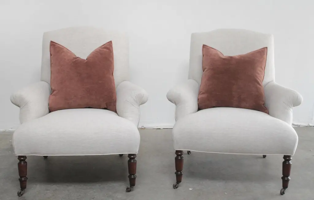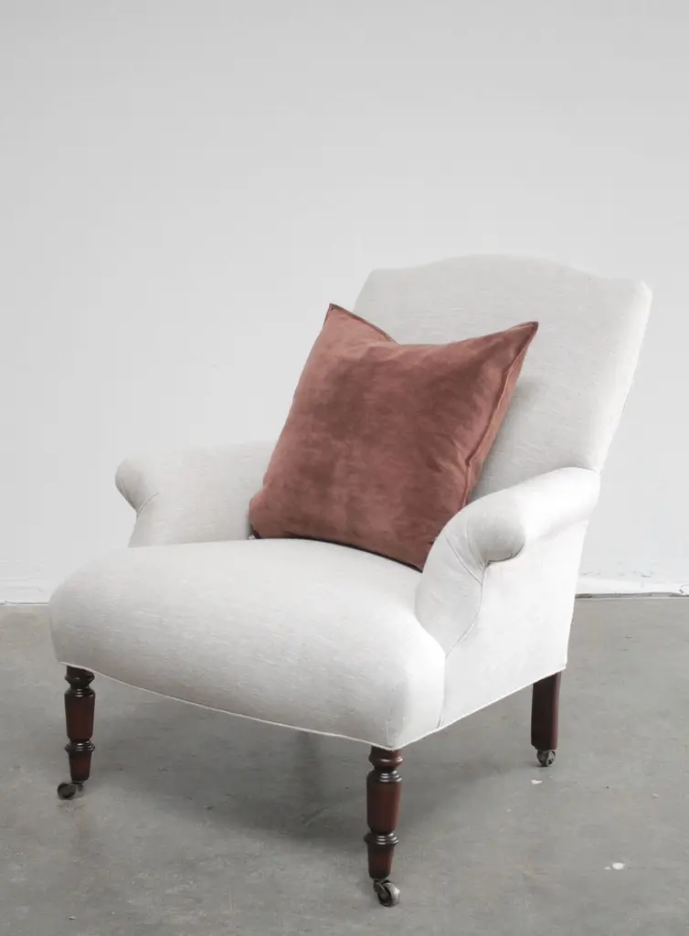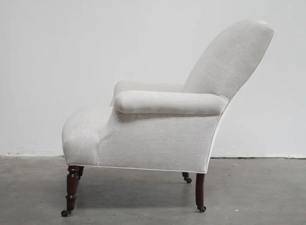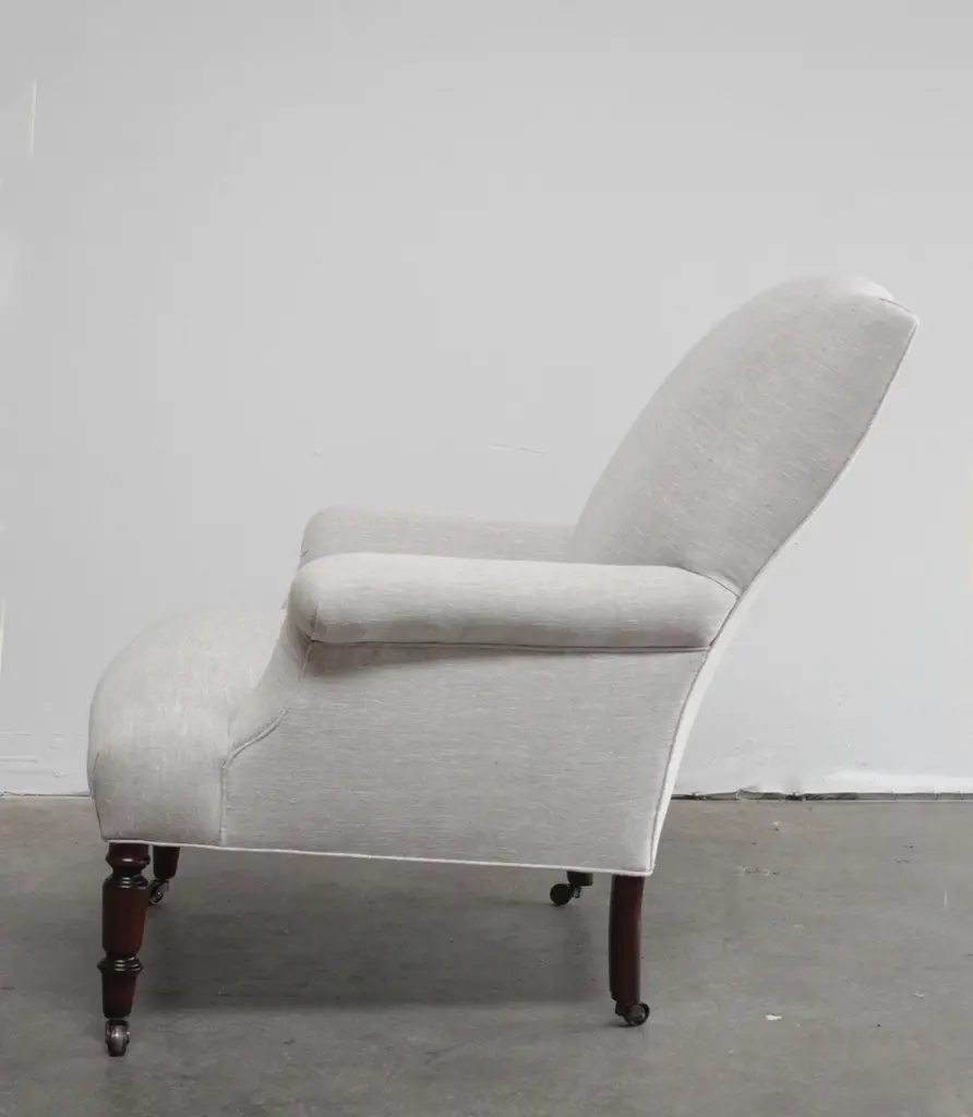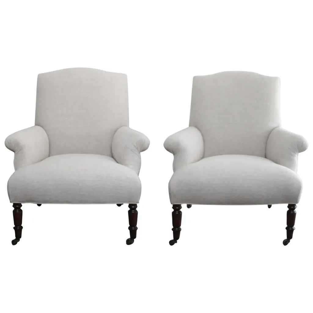 French inspired upholstered linen bergère chairsThese French inspired chair are based on an original Napoleon III style pair of chairs. Napoleon III was the nephew of the Napoleon that we are all familiar with. This style dates from the mid- to late 19th century, France. This chair has antique brass casters on all legs and is low and deep with Classic lines and proportions.We offer four colors of linen from Libeco-Lagae, a Belgian company that has been making linen since the 1850s.Size: 32" wide x 34" deep x 37" tallSeat height 17"Stain: FruitwoodPriced with Belgian linen, slip covers available.Shown in Oatmeal Belgian Linen.
