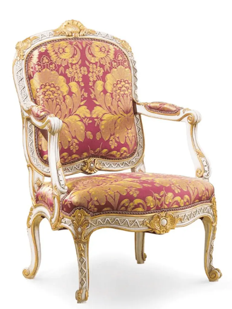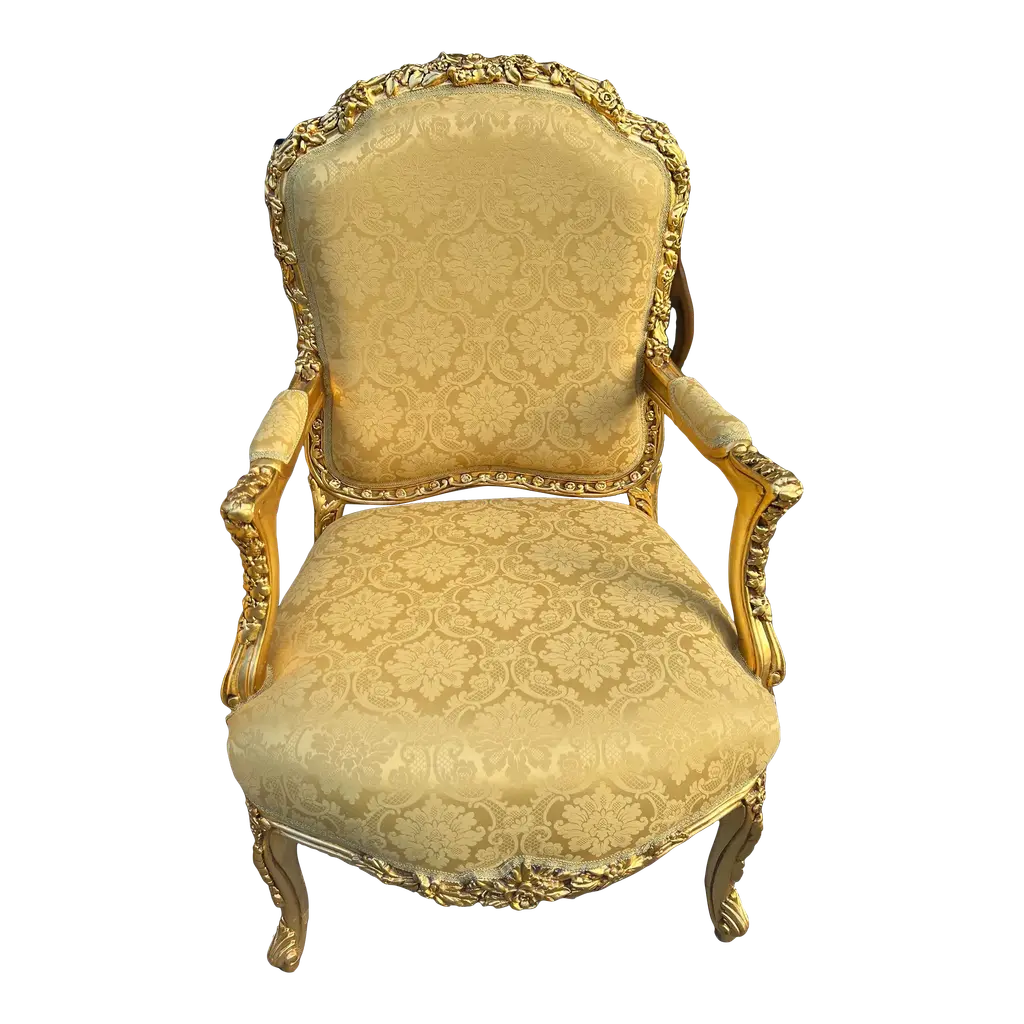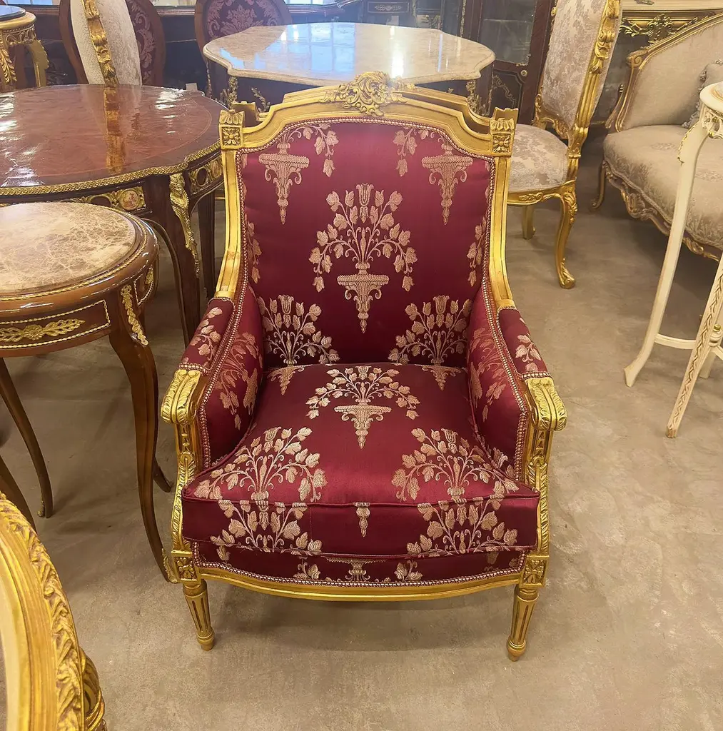 In love with this piece. We bring this beautiful, unique and authentic chair frame refinished in a gold leaf. Fully refinished and reupholstered using a high end designer fabric. This is a heavy chair. Art combined with details will make your home stand out. Elegance and comfort assured. Dimension: 40”H x 28”W x 29”D. Floor to seat 20”.