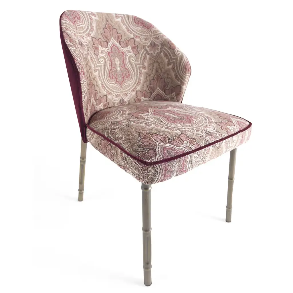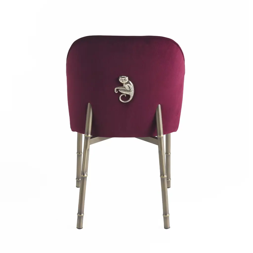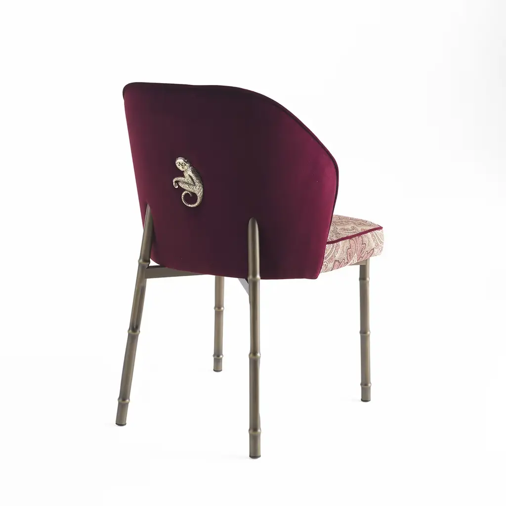 The rich Deosai cashmere of the seat, enhanced by the burgundy velvet piping that also features the back, meets the suggestions of the Asian nature, evoked by the bronzed finish legs with bamboo shape and by the precious monkey applied to the back, an exotic decorative element that characterizes Maison's collections. Structure in patinated bronze metal. Back and seat in wood and foam. Seat and inner back upholstery in fabric cat. A Deosai col. 1 Paradox. Rear back and piping in velvet cat. A Firenze col. 1 Raisin. Decorative elements in polished brass. Please ask the Concierge for available variants.