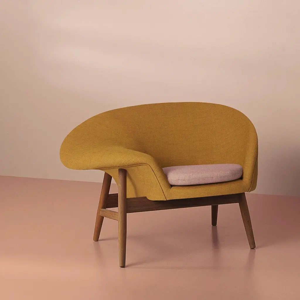 A unique asymmetrical armchair, designed by the highly acclaimed Danish architect, Hans Olsen in the 1950s. The Fried Egg armchair, in all its personality and capriciousness, is at last available for any design lovers who wish to add a bit of edginess to their homes in the shape of a unique item of designer furniture with roots in Danish Modernism. This roomy, comfortable chair was christened ‘Fried Egg', because that is what it looks like when viewed from above. The flat armrests invite you to swing your legs nonchalantly up on them, when you really feel like relaxing. As a tribute to the 1950s' adoration of colour and love of teak, one of the Fried Egg options is this elegant type of wood and upholstery in a range of stunning colours. You also have the option of playing with two-tone combinations, which are strongly reminiscent of a fried egg. Choose an exclusive furnishing fabric from Kvadrat in a carefully selected shade from the Warm Nordic universe. The frame is available in the highest quality teak.