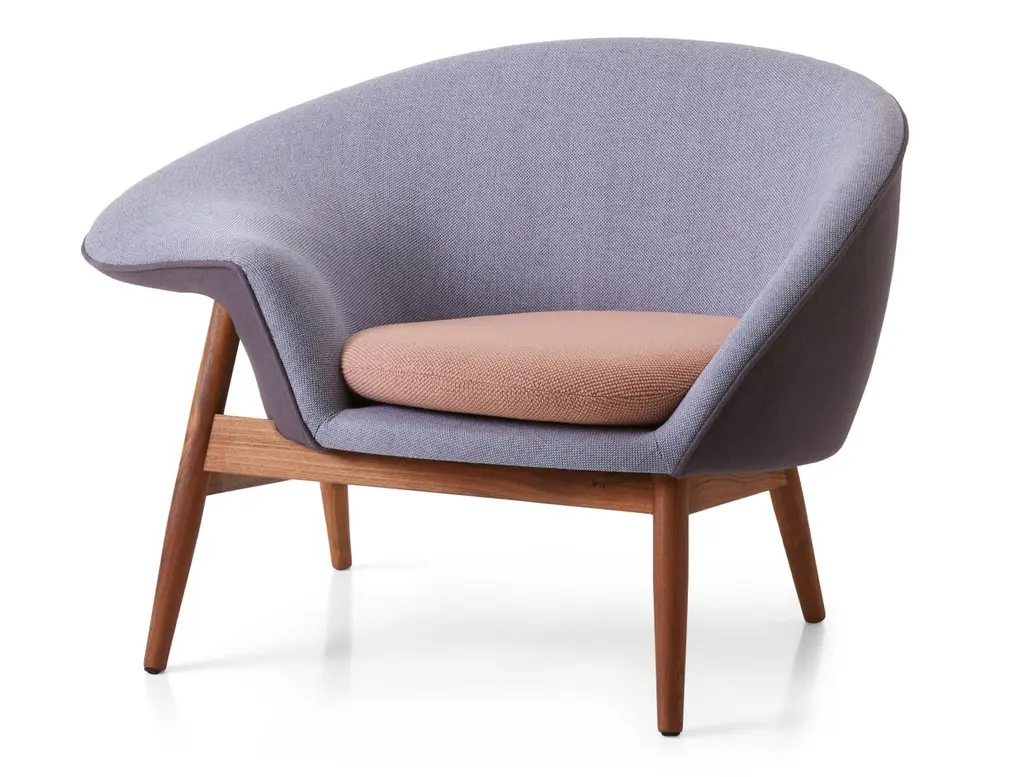 Fried Egg Left Lounge Chair Soft violet Plum Fresh Peach by Warm NordicDimensions: D99 x W68 x H 68 cmMaterial: Textile or nubuck upholstery, Solid oiled teakWeight: 25 kgAlso available in different colours and finishes. Please contact us.A unique asymmetrical lounge chair, designed by the highly acclaimed Danish architect, Hans Olsen in the 1950s. Fried Egg is also available in an exclusive anniversary edition with sustainable fabric, launched to celebrate the 100th birthday of Hans Olsen. The Fried Egg chair, in all its personality and capriciousness, is at last available for any design lovers who wish to add a bit of edginess to their homes in the shape of a unique item of designer furniture with roots in Danish Modernism. This roomy, comfortable chair was christened 'Fried Egg', because that is what it looks like when viewed from above. The flat armrests invite you to swing your legs nonchalantly up on them, when you really feel like relaxing. As a tribute to the 1950s' adoration of colour and love of teak, one of the Fried Egg options is this elegant type of wood and upholstery in a range of stunning colours. You also have the option of playing with two-tone combinations, which are strongly reminiscent of a fried egg. Choose an exclusive furnishing fabric from Kvadrat in a carefully selected shade from the Warm Nordic universe. The frame is available in the highest quality teak. The anniversary edition of Fried Egg is available in two beautiful options, both of which add an extra sensuousness to the Fried Egg chair by combining three different colours on the inside, outside, and on the cushion.Warm Nordic is an ambitious design brand anchored in Nordic design history and with a timeless, aesthetic style that inspires you to appreciate the little things in life. The company is the result of several years’ intense work on developing a new design brand with design history, quality and personality at its core. Warm Nordic boasts a colourful and charming universe of furniture, lamps and accessories full of personality. Our designs encapsulate the Nordic spirit, which in its essence is timeless, inclusive and warm.