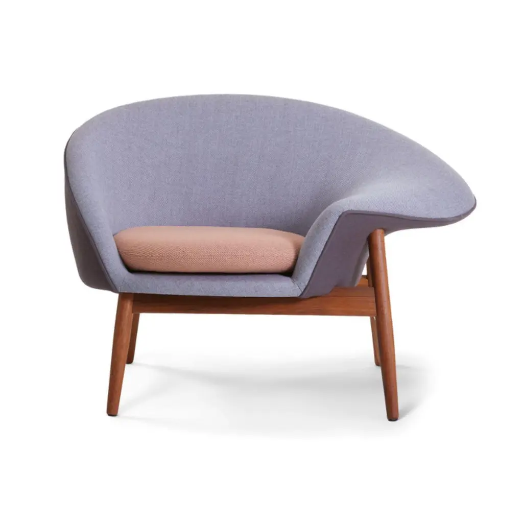 Fried Egg Right Lounge Chair Plum Soft Violet Fresh Peach by Warm NordicDimensions: D99 x W68 x H 68 cmMaterial: Textile or nubuck upholstery, Solid oiled teakWeight: 25 kgAlso available in different colours and finishes. Please contact us.A unique asymmetrical lounge chair, designed by the highly acclaimed Danish architect, Hans Olsen in the 1950s. Fried Egg is also available in an exclusive anniversary edition with sustainable fabric, launched to celebrate the 100th birthday of Hans Olsen. The Fried Egg chair, in all its personality and capriciousness, is at last available for any design lovers who wish to add a bit of edginess to their homes in the shape of a unique item of designer furniture with roots in Danish Modernism. This roomy, comfortable chair was christened 'Fried Egg', because that is what it looks like when viewed from above. The flat armrests invite you to swing your legs nonchalantly up on them, when you really feel like relaxing. As a tribute to the 1950s' adoration of colour and love of teak, one of the Fried Egg options is this elegant type of wood and upholstery in a range of stunning colours. You also have the option of playing with two-tone combinations, which are strongly reminiscent of a fried egg. Choose an exclusive furnishing fabric from Kvadrat in a carefully selected shade from the Warm Nordic universe. The frame is available in the highest quality teak. The anniversary edition of Fried Egg is available in two beautiful options, both of which add an extra sensuousness to the Fried Egg chair by combining three different colours on the inside, outside, and on the cushion.Warm Nordic is an ambitious design brand anchored in Nordic design history and with a timeless, aesthetic style that inspires you to appreciate the little things in life. The company is the result of several years’ intense work on developing a new design brand with design history, quality and personality at its core. Warm Nordic boasts a colourful and charming universe of furniture, lamps and accessories full of personality. Our designs encapsulate the Nordic spirit, which in its essence is timeless, inclusive and warm.