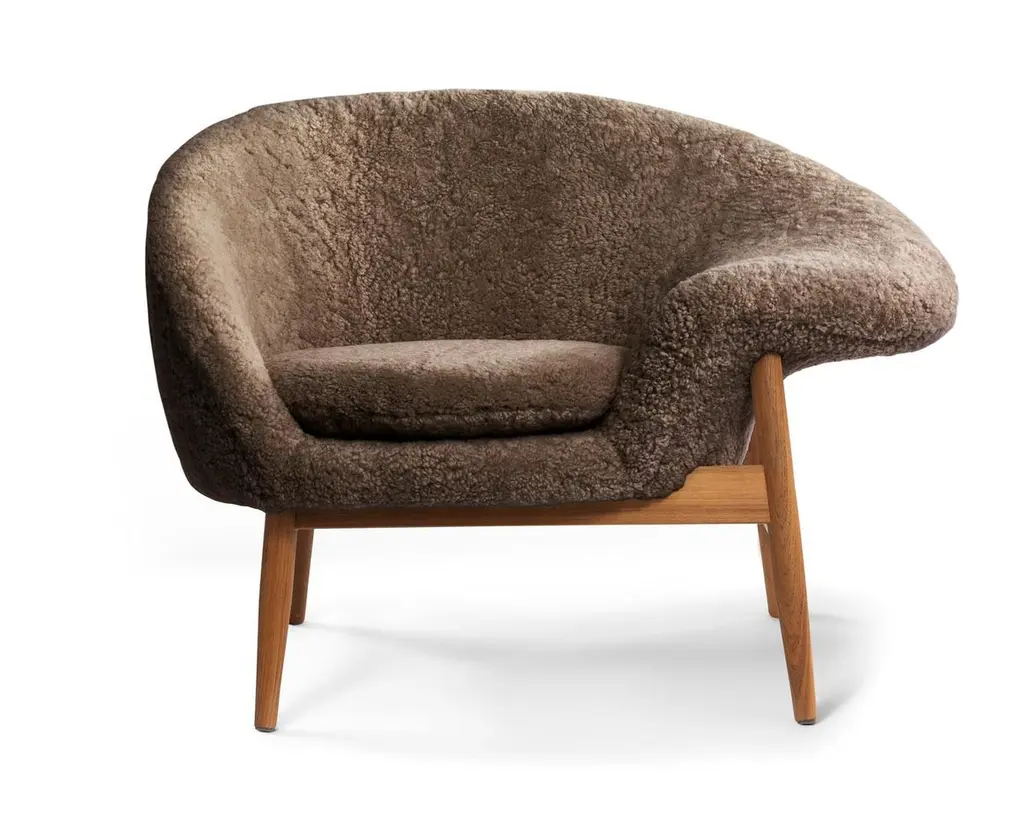Fried Egg Right Lounge Chair Sheepskin Drake by Warm NordicDimensions: D99 x W68 x H 68 cmMaterial: Sheepskin, Textile or nubuck upholstery, Solid oiled teakWeight: 25 kgAlso available in different colours and finishes. Please contact us.A unique asymmetrical lounge chair, designed by the highly acclaimed Danish architect, Hans Olsen in the 1950s. Fried Egg is also available in an exclusive anniversary edition with sustainable fabric, launched to celebrate the 100th birthday of Hans Olsen. The Fried Egg chair, in all its personality and capriciousness, is at last available for any design lovers who wish to add a bit of edginess to their homes in the shape of a unique item of designer furniture with roots in Danish Modernism. This roomy, comfortable chair was christened 'Fried Egg', because that is what it looks like when viewed from above. The flat armrests invite you to swing your legs nonchalantly up on them, when you really feel like relaxing. As a tribute to the 1950s' adoration of colour and love of teak, one of the Fried Egg options is this elegant type of wood and upholstery in a range of stunning colours. You also have the option of playing with two-tone combinations, which are strongly reminiscent of a fried egg. Choose an exclusive furnishing fabric from Kvadrat in a carefully selected shade from the Warm Nordic universe. The frame is available in the highest quality teak. The anniversary edition of Fried Egg is available in two beautiful options, both of which add an extra sensuousness to the Fried Egg chair by combining three different colours on the inside, outside, and on the cushion.Warm Nordic is an ambitious design brand anchored in Nordic design history and with a timeless, aesthetic style that inspires you to appreciate the little things in life. The company is the result of several years’ intense work on developing a new design brand with design history, quality and personality at its core. Warm Nordic boasts a colourful and charming universe of furniture, lamps and accessories full of personality. Our designs encapsulate the Nordic spirit, which in its essence is timeless, inclusive and warm.