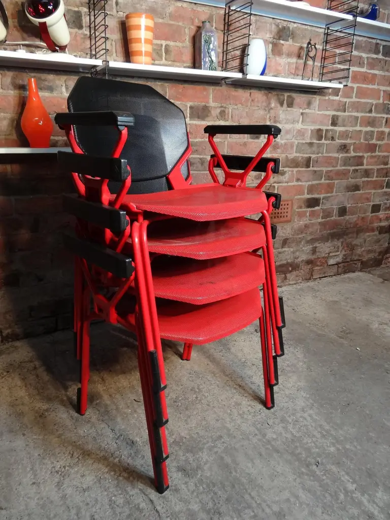 1970s Froscher Red Metal Office / Desk Chair for SitformA stunning vintage office chair designed by Froscher for Sitform in the 1970s. This original designer metal chair features a striking red finish and clean, retro lines, making it a perfect example of mid-century office design. The chair is in very good vintage condition, retaining its original charm and functionality.Delivery price is per chair; if you wish to purchase multiple chairs, please let us know the quantity and we will provide a combined delivery quote.Dimensions:Seat height: 46 cmOverall height: 82 cmDepth: 55 cmWidth: 60 cmA rare and highly collectible piece, ideal for both design enthusiasts and collectors of mid-century modern office furniture.