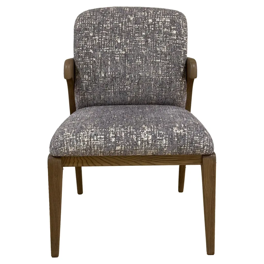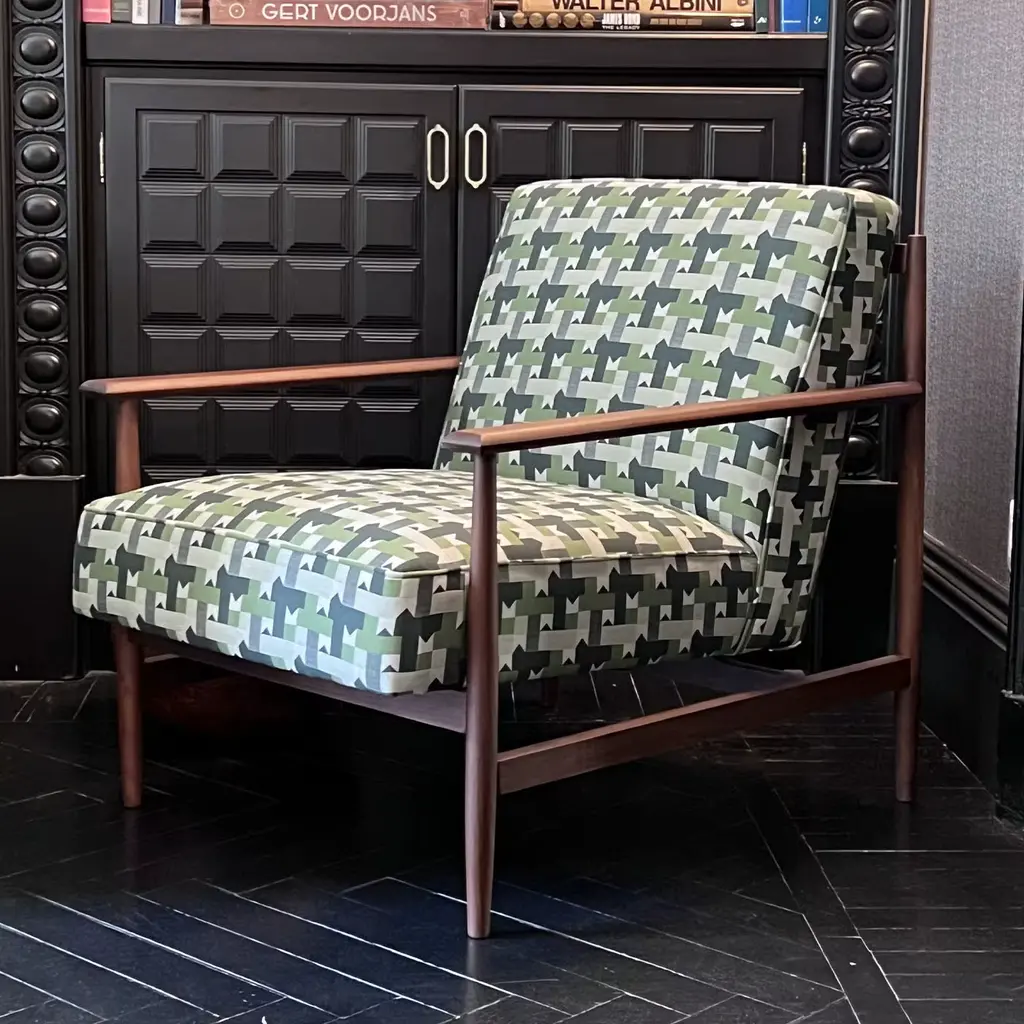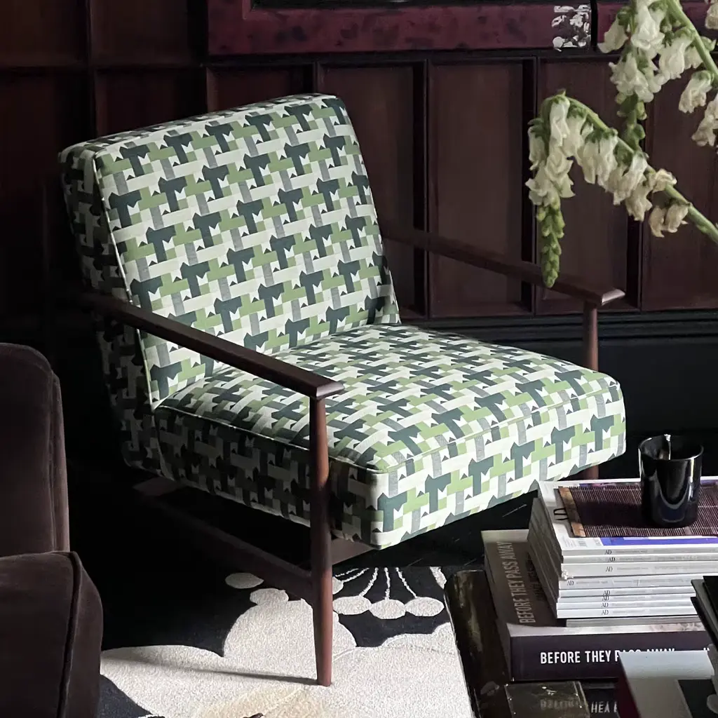 Drawing inspiration from 1950s Brazilian design, this lounge chair will make for a singular and iconic accent to a contemporary interior. Handcrafted of ash wood, displaying unique grains, it features an interlocking structure of unique flair, enriched with a softly padded seat and backrest cushion, upholstered with a patterned mixed linen and cotton fabric. Customizable in upholstery and wood type, please consult the Concierge for more details.
