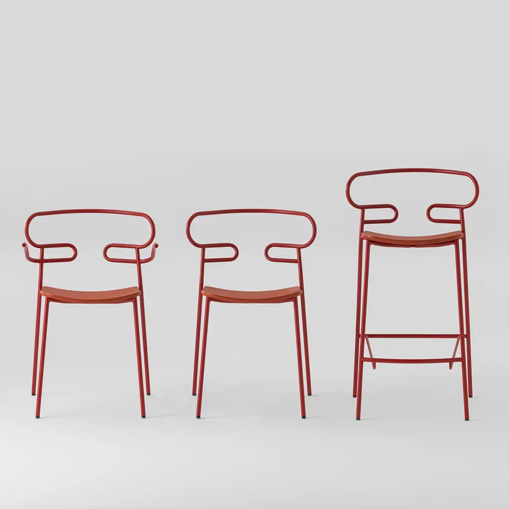 This stunning, red Genoa chair by Cesare Ehr will be an iconic and sophisticated addition to a contemporary interior. Boasting a total-red look, it is distinguished by a "one-line" backrest made of a single, curved cylindrical metal element that ends in armrests through a continuous and sinuous movement. The seat is available in polyurethane, wood, or upholstered with fabric, leather, or faux leather. Please ask the Concierge for further details.