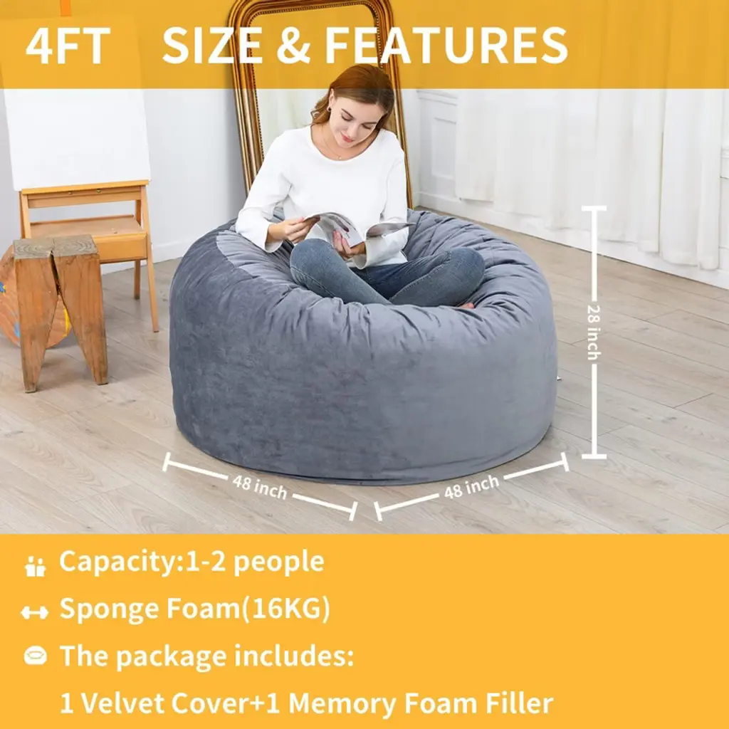Giant 4Ft Bean Bag Chair With High-rebound Memory Foam, Plush Dutch Velvet Cover, Soft Foam-filled Lazy Sofa For Kids & Adults, Gray