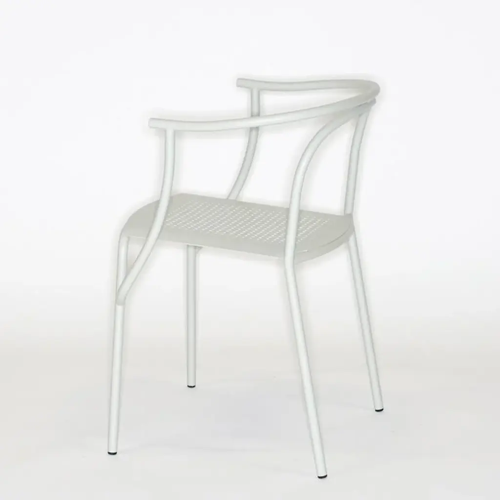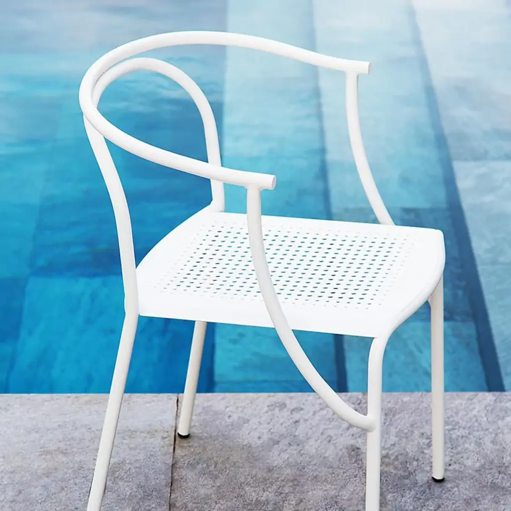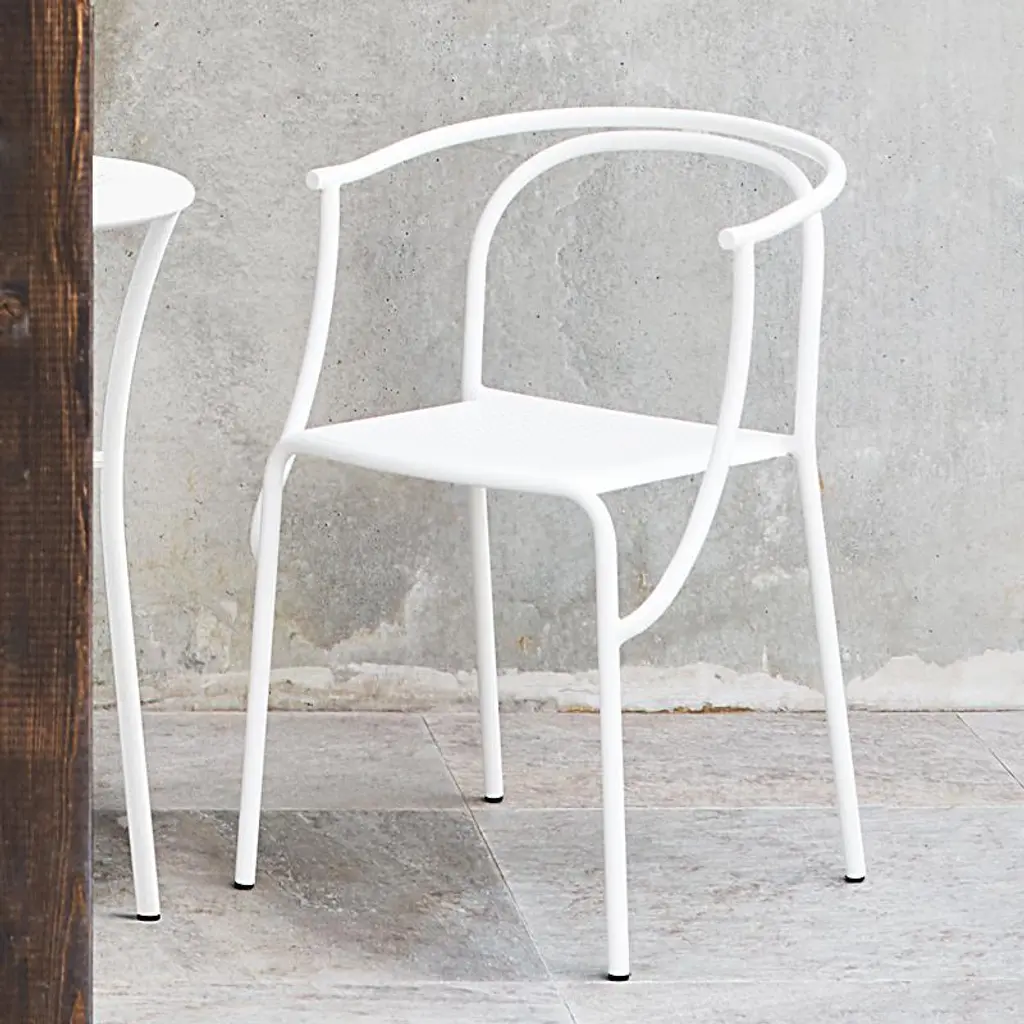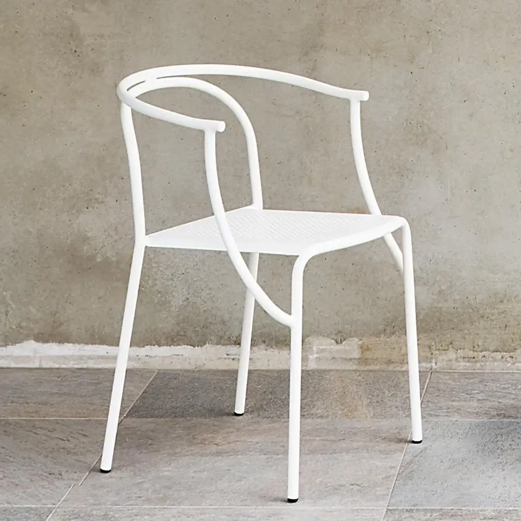 The Giardini chair is a light, elegant, and stackable option for the outdoor café or private garden. The friendly curvature is a mix of inspiration from nature and playful use of computer-guided state of the art bending machines. The steel frame and seat are both zinc-electroplated, chromed, and powder-coated.