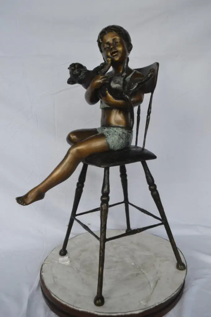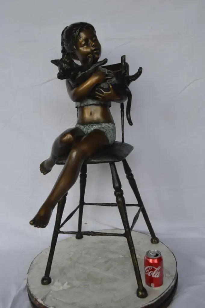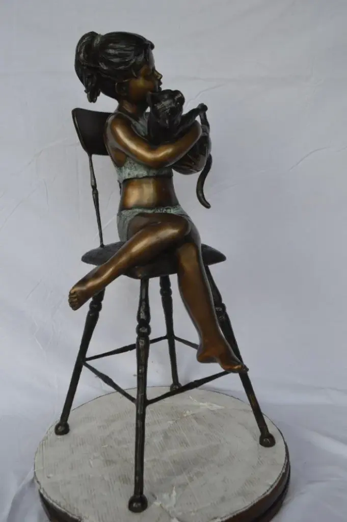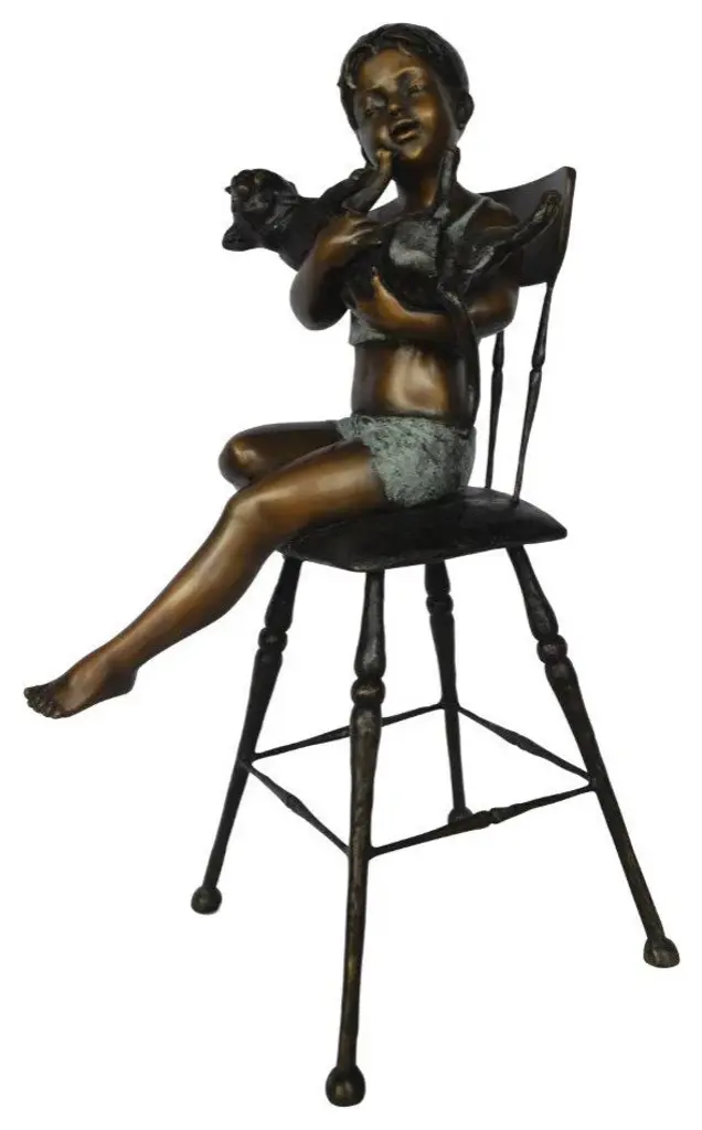 Girl With A Cat On A High Chair Bronze Statue - Size: 16"l X 16"w X 38"h.