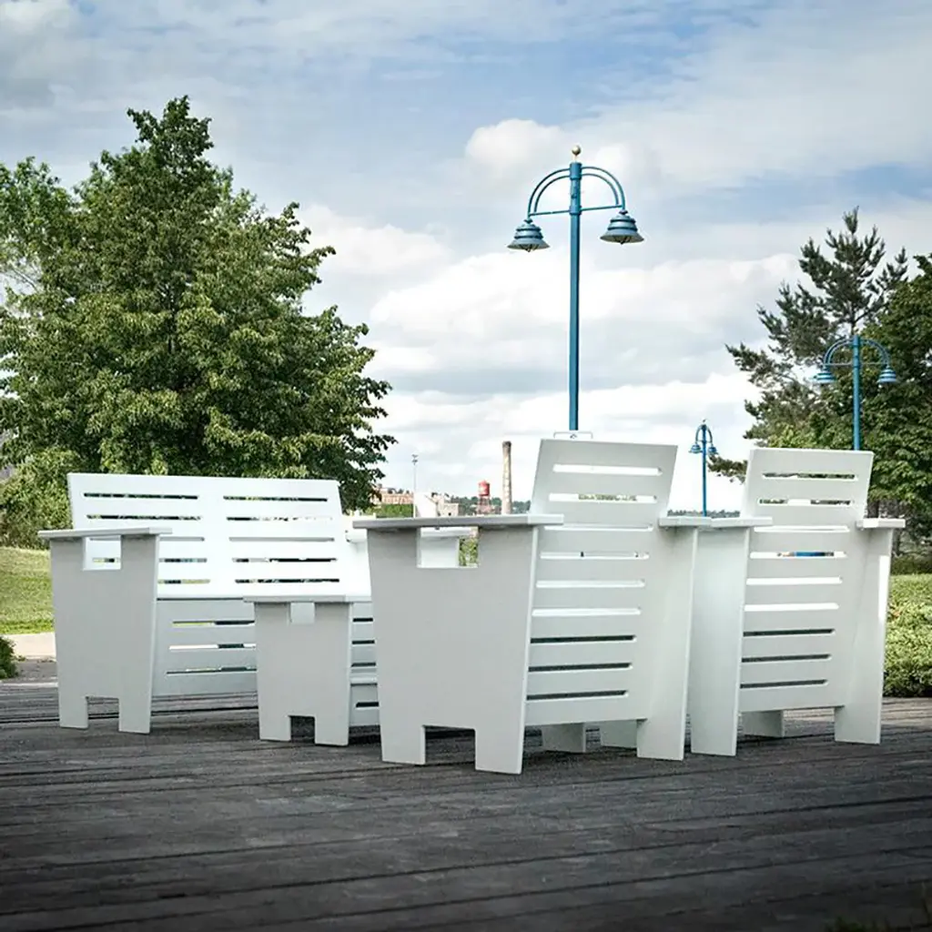 The Go Collection was their first take on something other than an Adirondack chair. Like so many full collections it started as a chair and grew from there. The thought was to make a club style chair for outdoors that was more upright and with a taller seat height to make it easier to get in and out of. It also needed to be anything but an Adirondack. The flat plastic sheet they produce all their furniture from dictated much of the design concept. The Go Collection was originally designed in 2006, but over the years they have continued to refine the appearance and function of all the pieces, as well as reduce the cost. The Seattle Public Library literally has hundreds of pieces of Go that are used every day in one of the most unique architectural spaces on Earth. They don’t underestimate the importance of that. If you are looking for something a jig more contemporary, yet a bit less lounge, then the Go Collection will suit your space well. Features UV INFORMATION: RICHLITE: LOW-IMPACT MANUFACTURING: