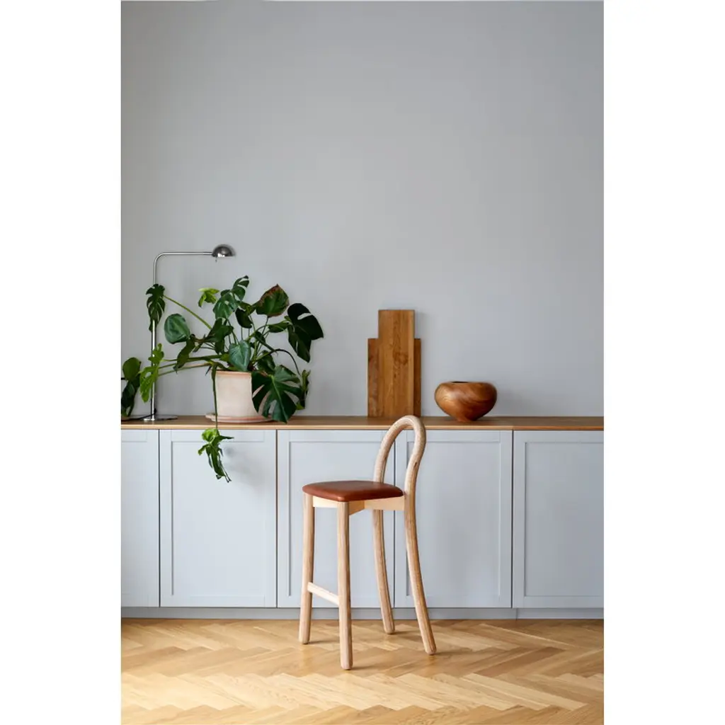 The Goma bar chair by Made by Choice boasts a playful expression created by its curvy, almost plastic-like frame. Although the look is very cartoonish and plasticky, the chair is actually crafted from plywood with a cognac leather seat. Designed by Thomas Sandell, Goma was originally created for a restaurant of the same name, located in Stockholm, Sweden. The bar chair is made in Finland from birch plywood.