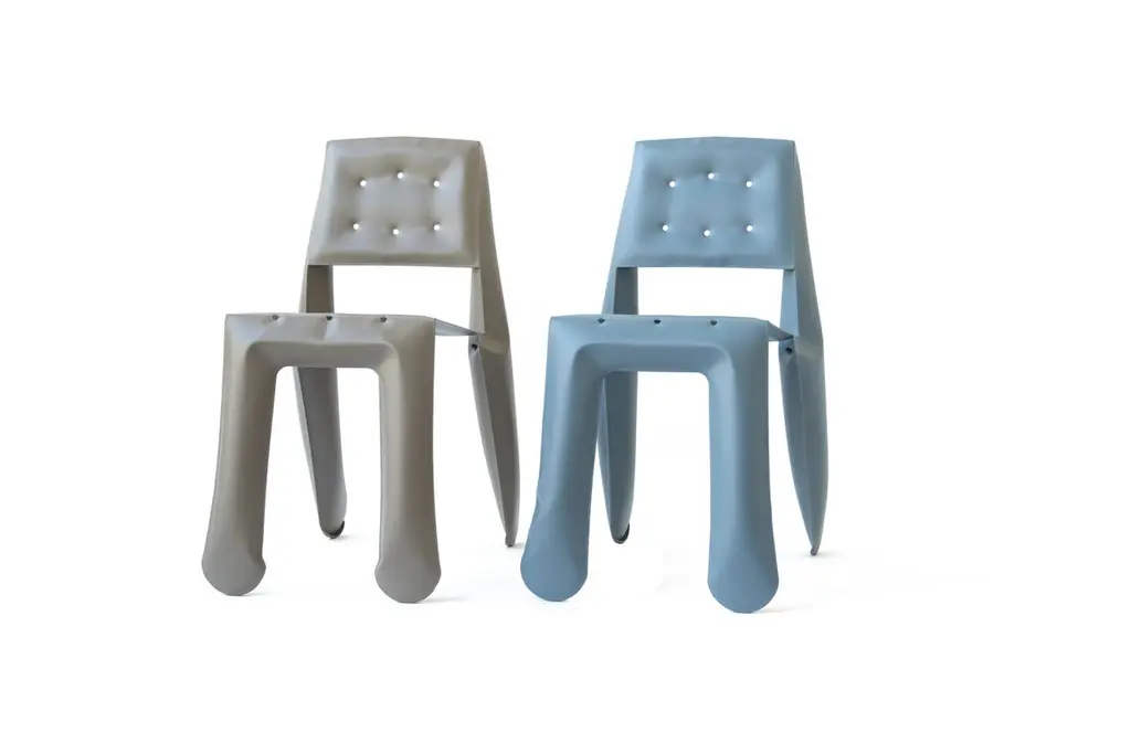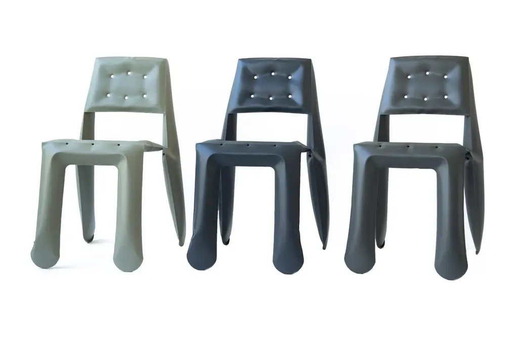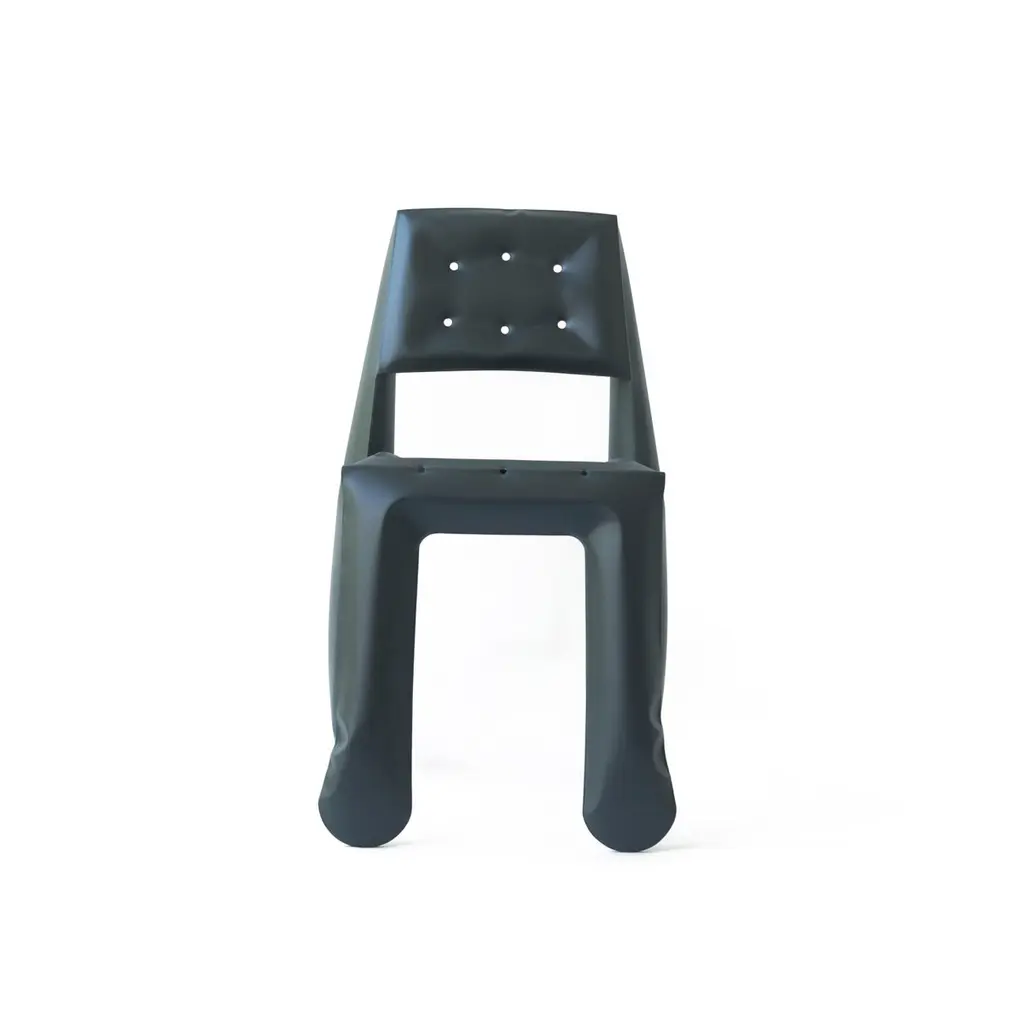 Graphite Carbon Steel Chippensteel 0.5 Sculptural Chair by ZietaDimensions: D 58 x W 46 x H 80 cm Material: Carbon steel.Finish: Powder-coated. Matt finish.Also available in colors: white matt, beige, black, blue-gray, graphite, moss-gray, and, umbra-grey. Chippensteel 0.5 is a chair that delights the eye, mixes the senses, and plays with perception. Made of steel, aluminum or copper, its form refers to upholstered armchairs designed two centuries ago in England – it is a piece of furniture that combines ultra-modern technology with a nod to the rich history of design.Chippensteel 0.5 is a perfect example of combining craftsmanship with the original method of shaping steel called FiDU, developed and perfected by Oskar Zieta. The two-dimensional form is cut from metal sheets and welded in this process, finally getting transformed into a functional chair using compressed air. In the final stage, it goes through a finishing process performed by a designer and craftsman.The form of the chair was inspired by a classic model fashionable in the third quarter of the 18th century, named after the English carpenter Thomas Chippendale. The Chippensteel form deceives the eye with its inflated steel form, suggesting softness. Thanks to the use of evenly spaced holes, the artistically inflated steel imitates the irregularly arranged upholstery fabric on the armchairs. The combination of cold metal with an upholstery-like finish makes the Zieta Studio chair a unique work of art.Like other objects from the Zieta Studio offer, Chippensteel 0.5 is a mixture of craftsmanship with knowledge of the values ??of the material. The chair, made of polished steel and copper, thanks to its mirror surface, reflects light and the surroundings, focusing attention on itself and blending into space like a chameleon. On the other hand, the powder-coated finish emphasizes the chair’s irregular structure and gives it a more modern, industrial character.Chippensteel 0.5 is one of many objects designed by Oskar Zieta in the process of controlled deformation leading to the formation of unpredictable forms. As a result, the cool metal gains a “soft” appearance and becomes tame as a full-fledged interior material. Each Chippensteel chair contains the uniqueness of the material used: steel, copper, or aluminium.About Zieta: Zietas main goal is to deliver uniqueness and customization in design and construction while keeping the production, transport, and warehousing innovatively efficient.This is how they imagine the future world: Light, durable structures of customized applications produced on demand out of one-of-a-kind parts, yet efficiently.They use a computer-controlled production process. Customized pattern, customized form, customized function, one-of-a-kind product, and outstanding precision are what they deliver.You will find all of this philosophy reflected in the products. They research, they discover new possibilities, they play with forms and they deliver a beautiful, innovative, surprising outcome to people who love the design and who care about design development.They believe their work is a valuable contribution to the world of design not only by the unique beauty of the forms but most of all by opening ultra-innovative opportunities of forming and new paths for the world of the future.