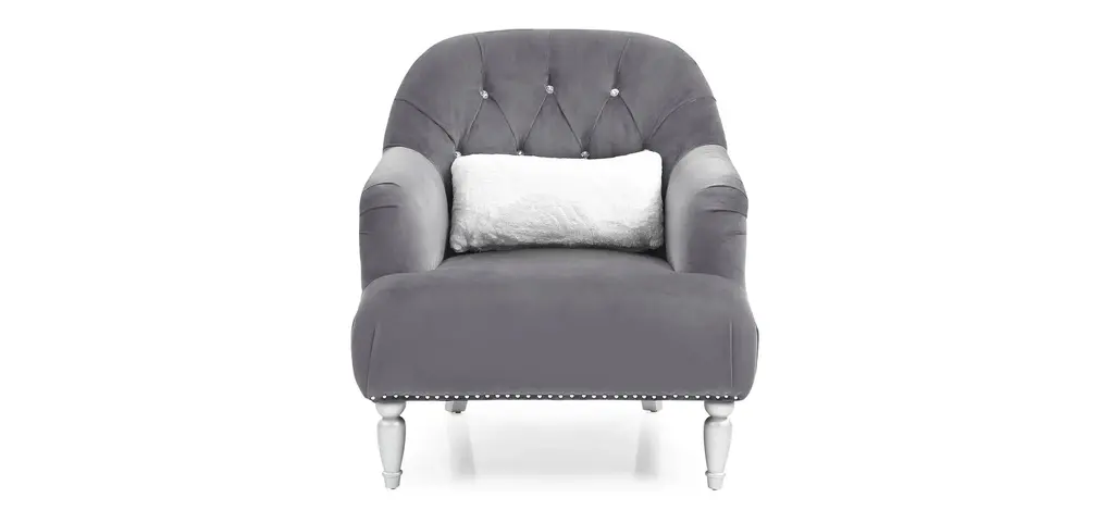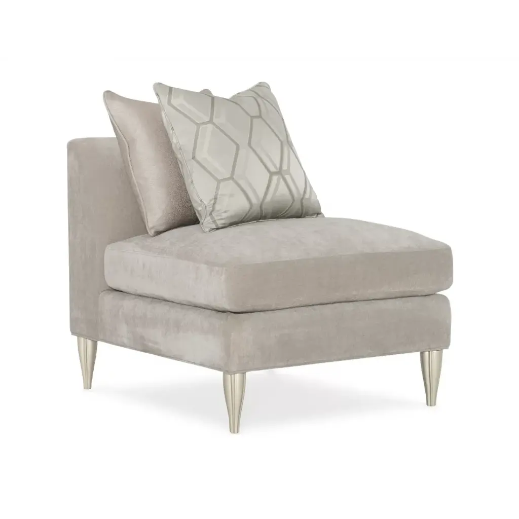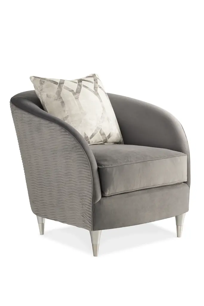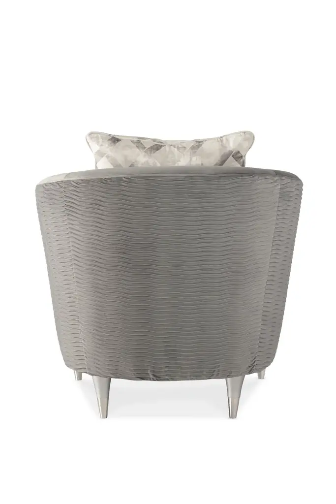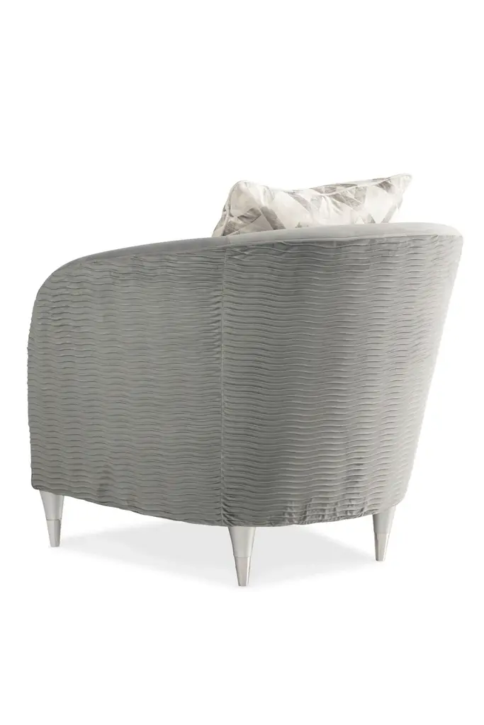 Soft curves converge with flowing lines to create an enveloping silhouette. Features a plush seat and smooth upholstered back, dramatically defined by pleated velvet that wraps the frame with a rippling effect. A metallic pillow adds an artful accent, complemented by tapered round legs with polished ferrules. Pair with our matching Farrah sofa, or create a cozy bedroom corner.