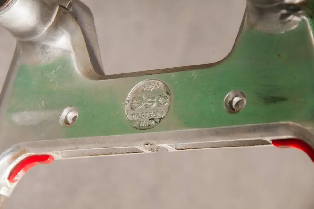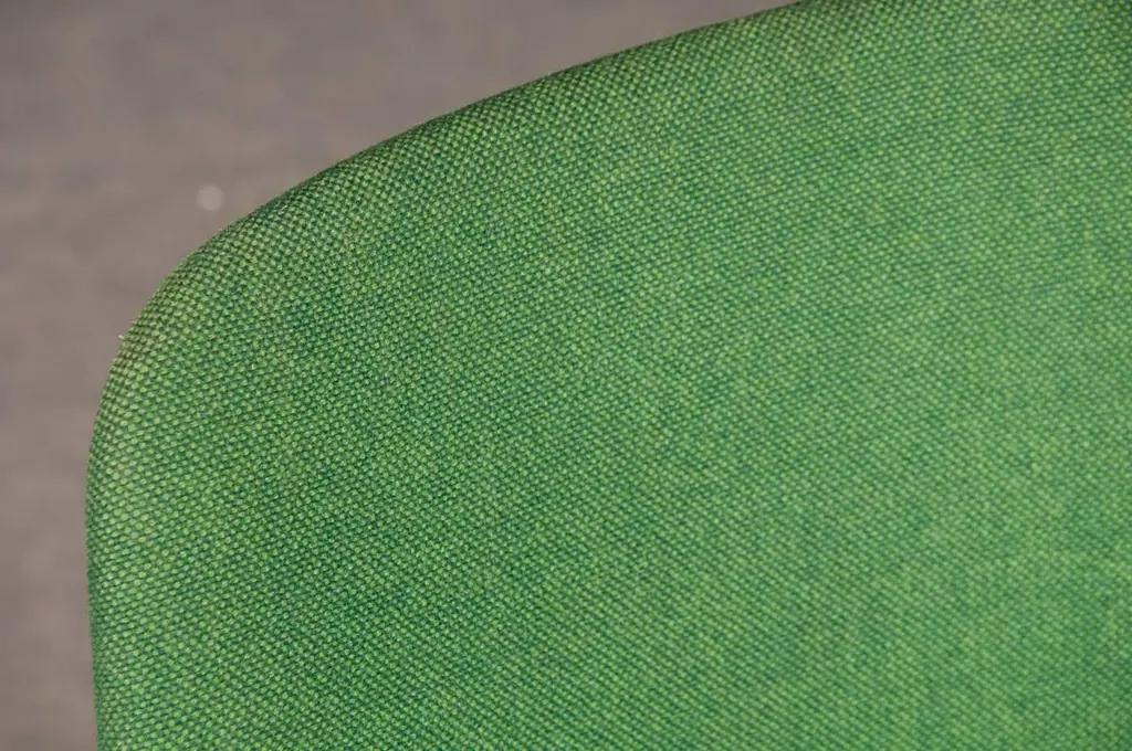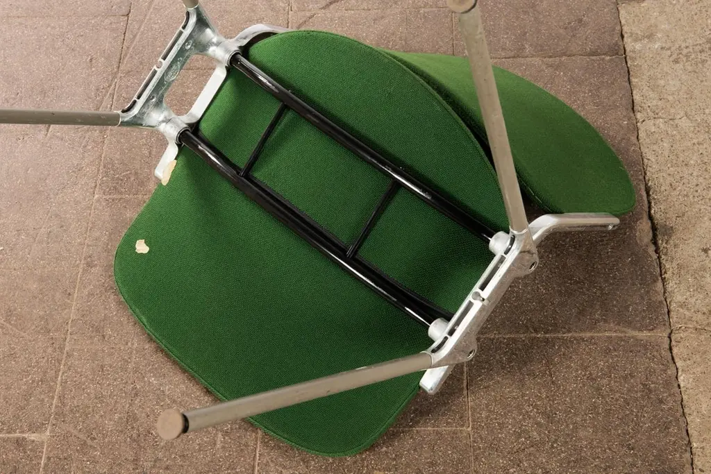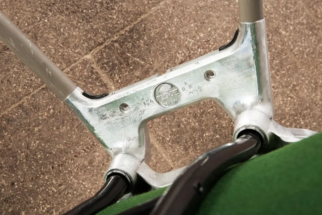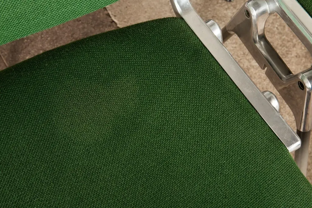 Frame made of cast aluminium frame, upholstered seat and back, covered with green fabric, still in original condition.Frame with patina and scratches.Upto 16 available.