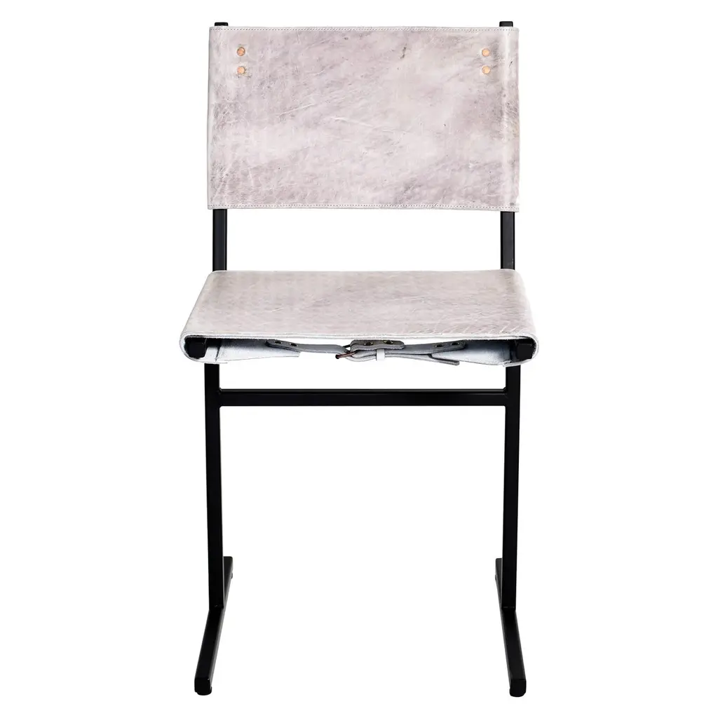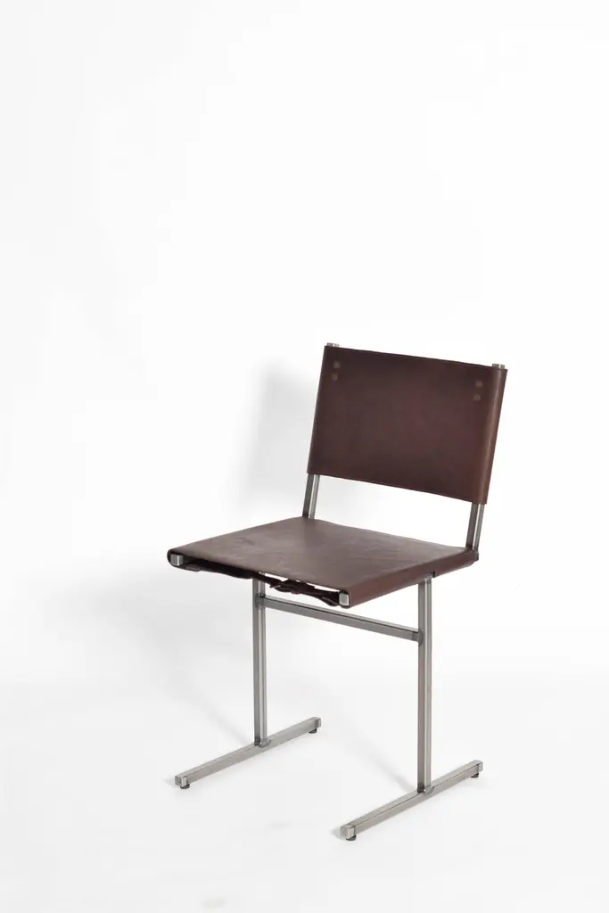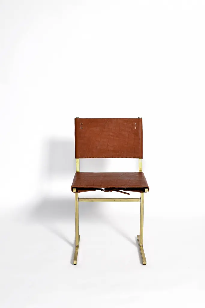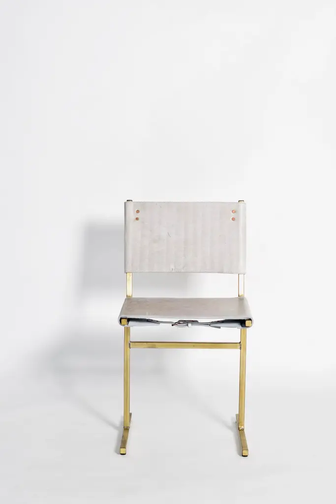 Grey and brass Memento chair, Jesse SandersonOriginal signed chair by Jesse SandersonMaterials: Leather, SteelDimensions: W 43 x D 50 x H 80 cm Seating height: 47 cmFive lines and a circle – the human body can be as simple as the drawing of a five-year-old. Inspired by the same simplicity, the Memento was designed; A chair in its purest form with two leather rectangles on a steel lining. The leather is attached with straps and buckles, for switching the leather and the steel frame as you please. The thick saddle leather is ecologically tanned to accentuate the life that wore it as its skin. The scars and insect bites from the life in Transylvania are visible in the leather. By using the Memento chair, the leather becomes even more beautiful over time.Jesse Sanderson is a self-taught artist with a distinctive signature. He is fascinated by imperfection and allows natural forms to dictate his designs. Raw materials that are affected by weathering and aging tell a story about the origin and history which he aims emphasize wherever possible. By applying traditional craftsmanship and expressing his personal view, he designs intelligent yet simple-hearted objects.