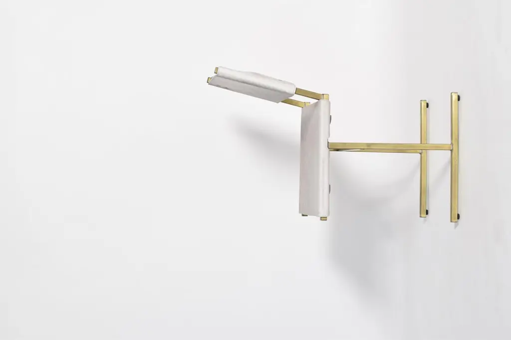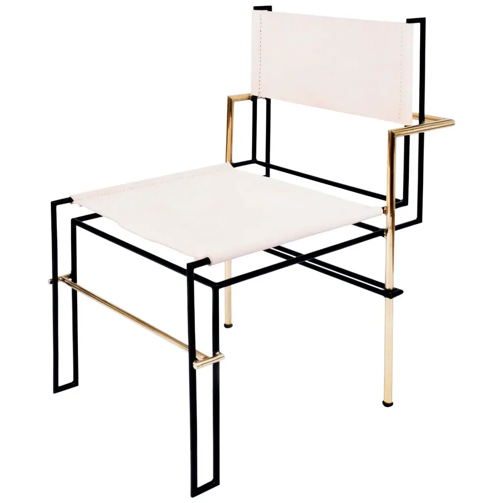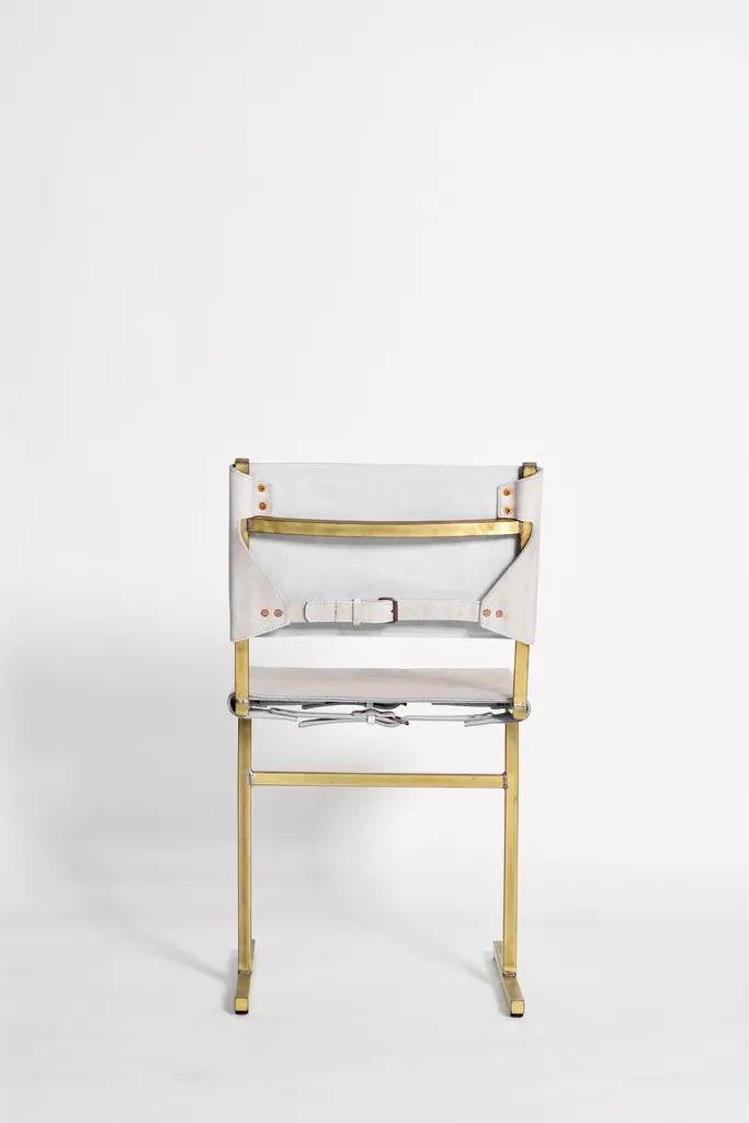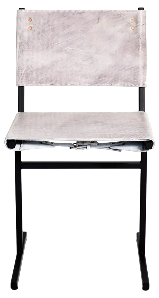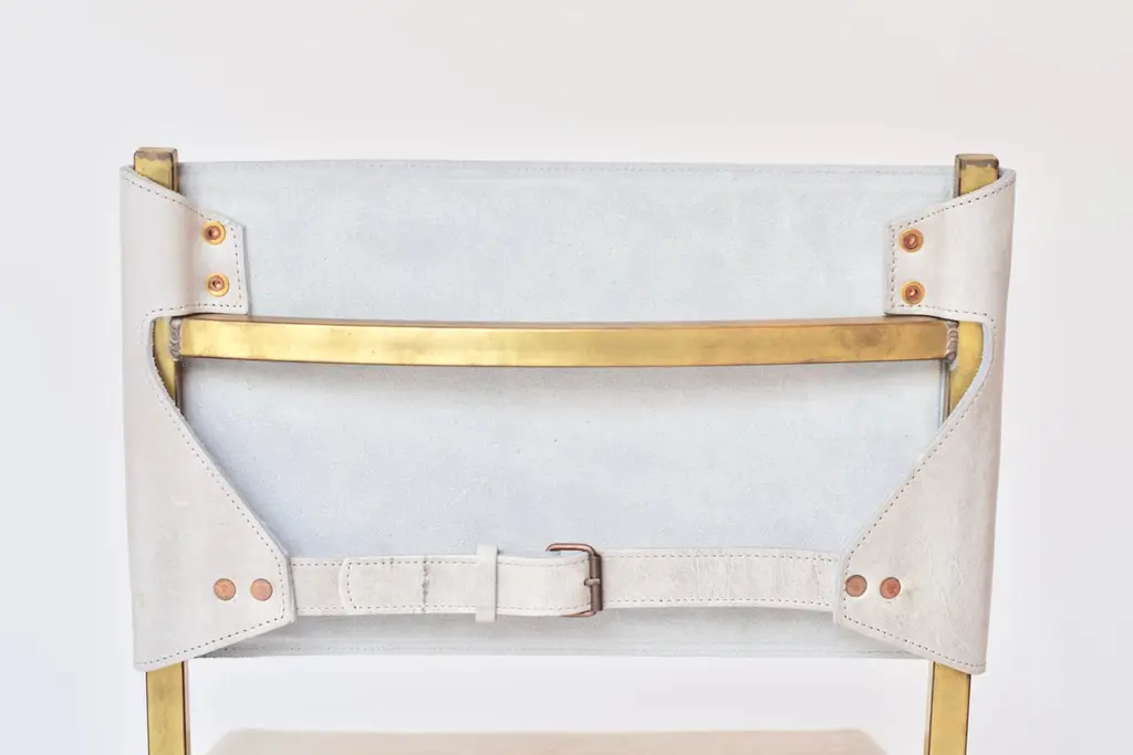 Grey and brass Memento chair, Jesse SandersonOriginal signed chair by Jesse SandersonMaterials: Leather, SteelDimensions: W 43 x D 50 x H 80 cm Seating height: 47 cmFive lines and a circle – the human body can be as simple as the drawing of a five-year-old. Inspired by the same simplicity, the Memento was designed; A chair in its purest form with two leather rectangles on a steel lining. The leather is attached with straps and buckles, for switching the leather and the steel frame as you please. The thick saddle leather is ecologically tanned to accentuate the life that wore it as its skin. The scars and insect bites from the life in Transylvania are visible in the leather. By using the Memento chair, the leather becomes even more beautiful over time.Jesse Sanderson is a self-taught artist with a distinctive signature. He is fascinated by imperfection and allows natural forms to dictate his designs. Raw materials that are affected by weathering and aging tell a story about the origin and history which he aims emphasize wherever possible. By applying traditional craftsmanship and expressing his personal view, he designs intelligent yet simple-hearted objects.