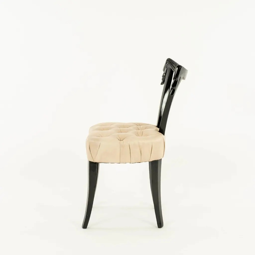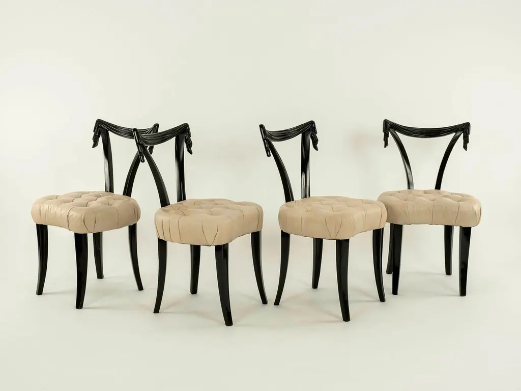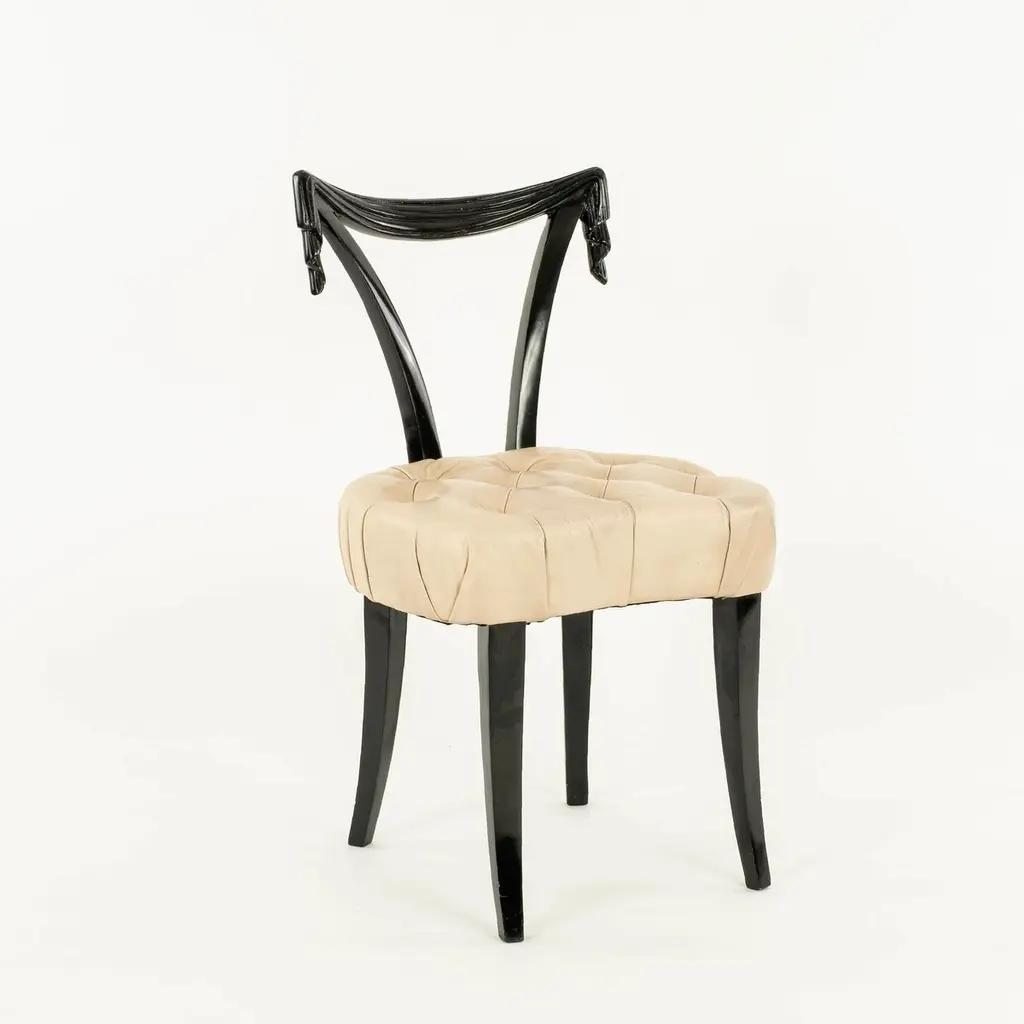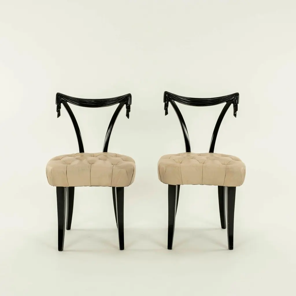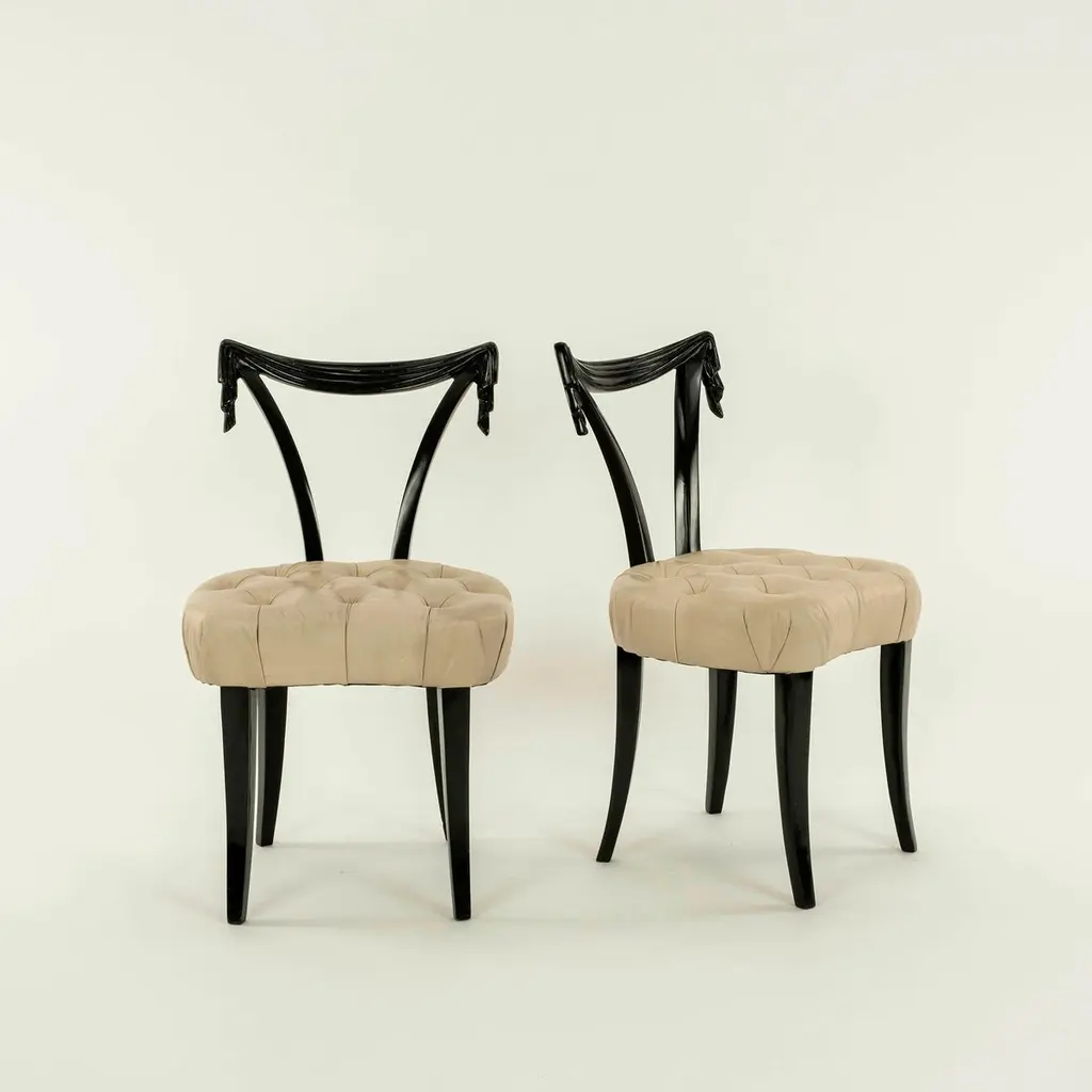 Elegant Grosfeld House ebonized occasional chairs having open backs with dramatic hand-carved draped swags with button tufted leather seats. Sold individually and also available C.O.M. for additional $200.00 by request with quick turnaround.