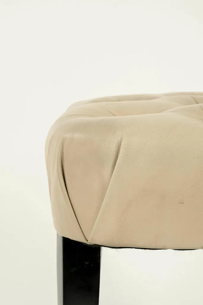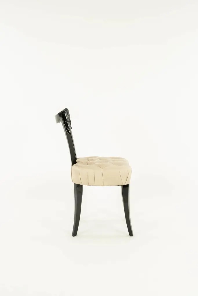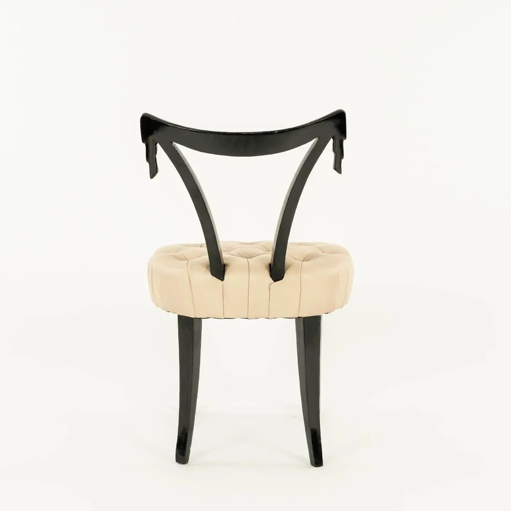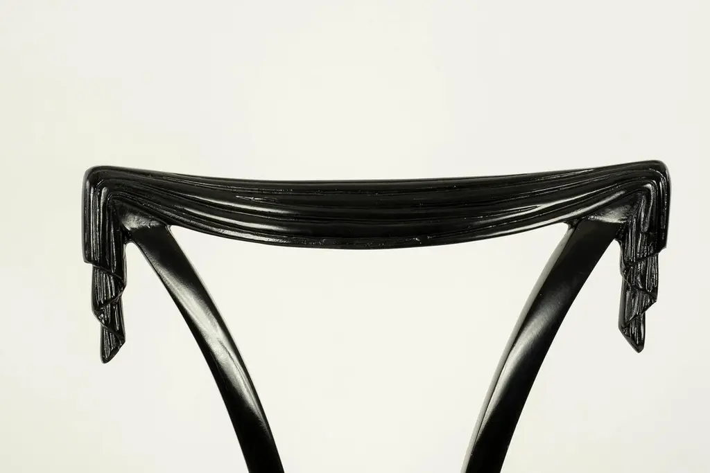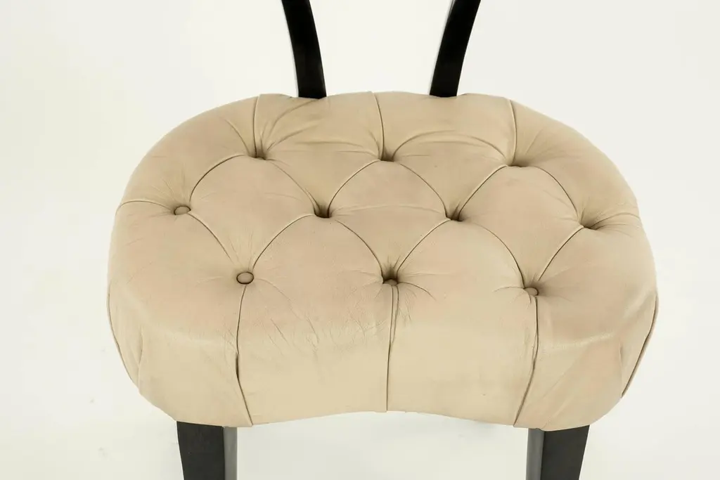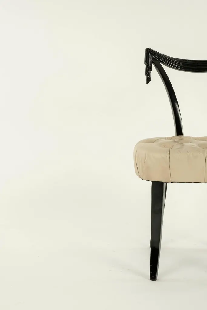 Elegant Grosfeld House ebonized occasional chairs having open backs with dramatic hand-carved draped swags with button tufted leather seats. Sold individually and also available C.O.M. for additional $200.00 by request with quick turnaround.