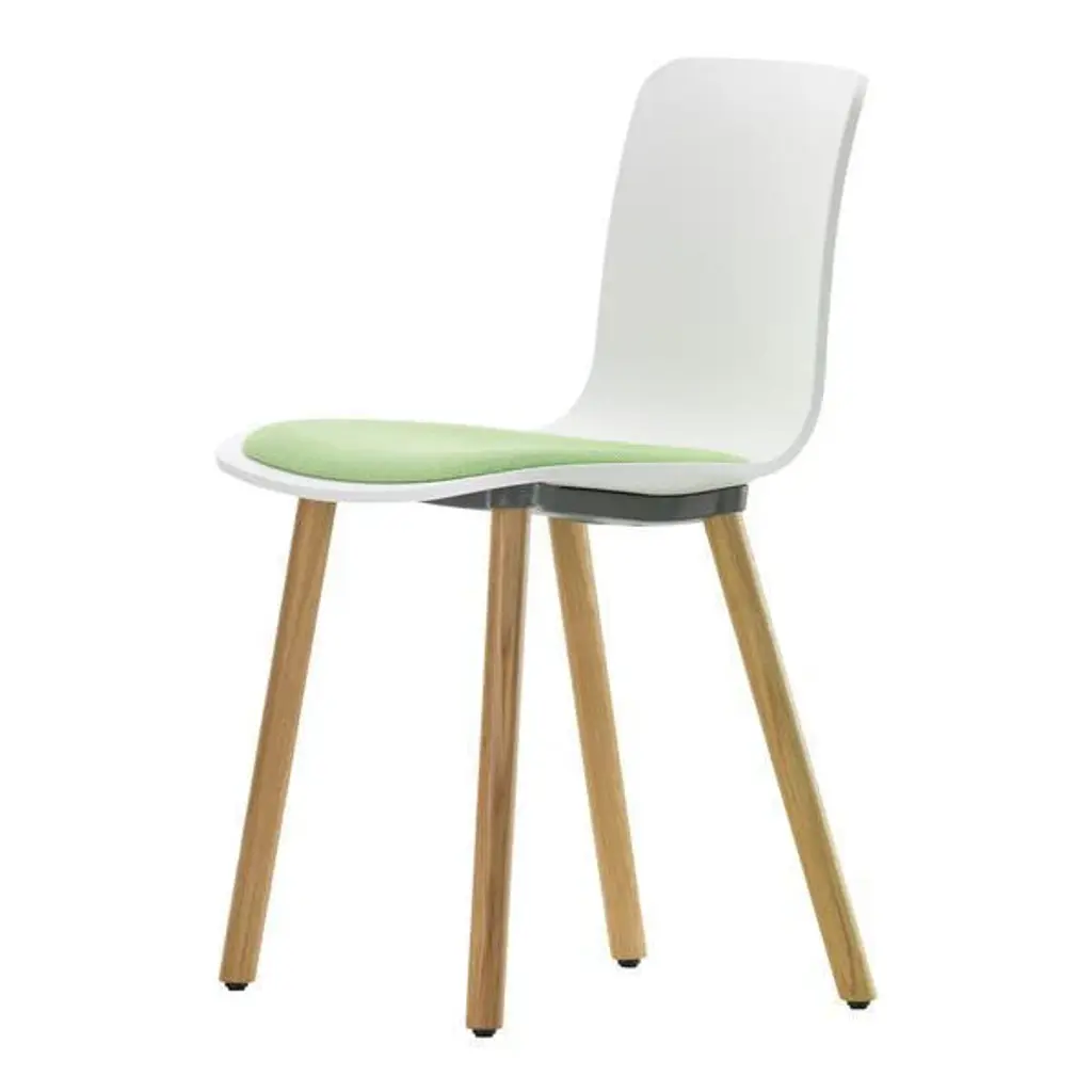 The HAL Wood chair by Jasper Morrison is part of the multifaceted HAL family. The striking combination of a plastic seat shell and four-legged wooden base lends the chair its unique character. The comfortable seat shell is available in a selection of colours, whilst the chair legs come in a choice of three high-quality woods. Please note: Color of glides are matched to the small attachment parts for the seat shell, with a choice of white or basic dark. Non stacking.