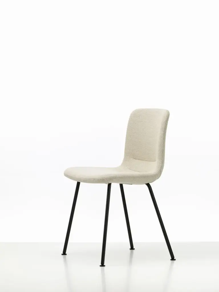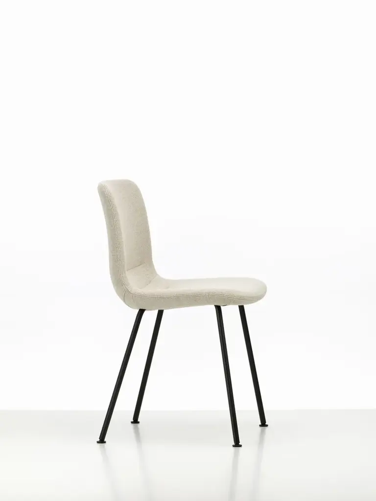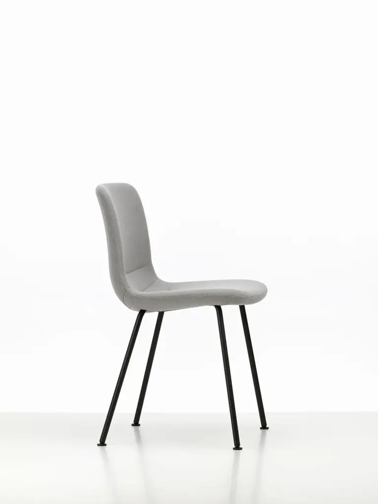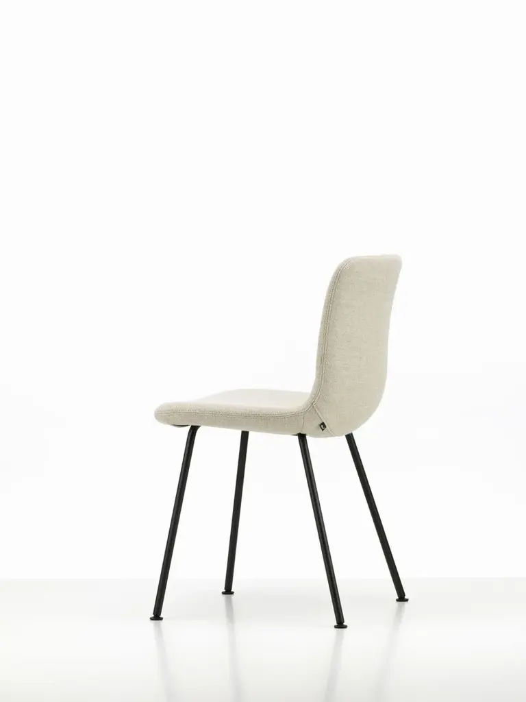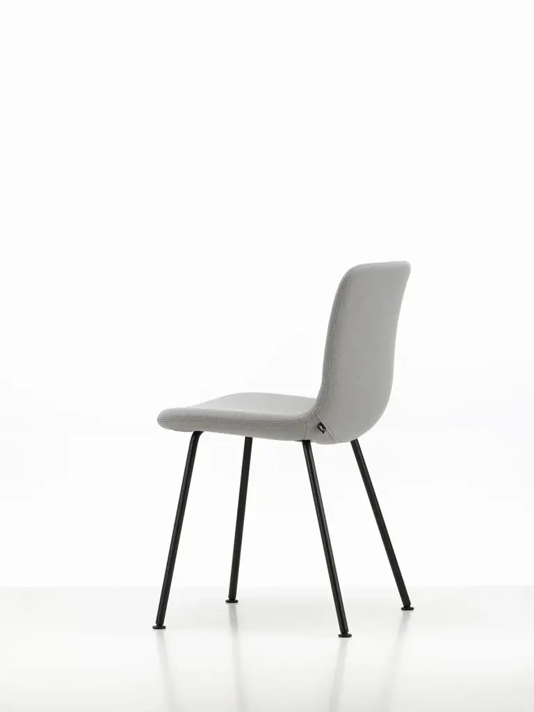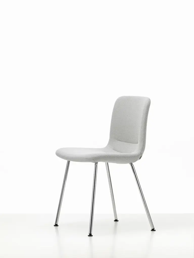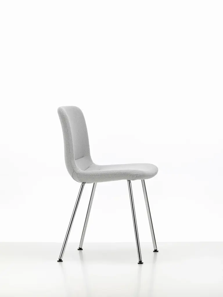 The padded upholstery of HAL Soft provides superb comfort, with rounded contours that soften the appearance of the characteristic HAL shell. Available in a chrome-plated or powder-coated finish, the tubular steel base gives HAL Soft Tube a light graceful appearance. The fabric cover can be removed and changed as needed.- Glides: colour matched to the small attachment parts for the seat shell, choice of white (except HAL Wood and HAL Ply Wood) or basic dark. All bases fitted with glides for carpet; felt glides optionally available for hard floors.- Seat shell: glass-fibre reinforced polyamide. Polyurethane foam padding, replaceable fabric cover (to be carried out by Vitra Service only).- Base: four-legged tubular steel base, chrome-plated finish or powder-coated in basic dark.