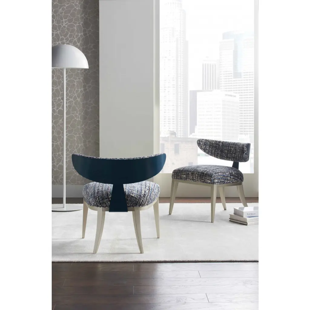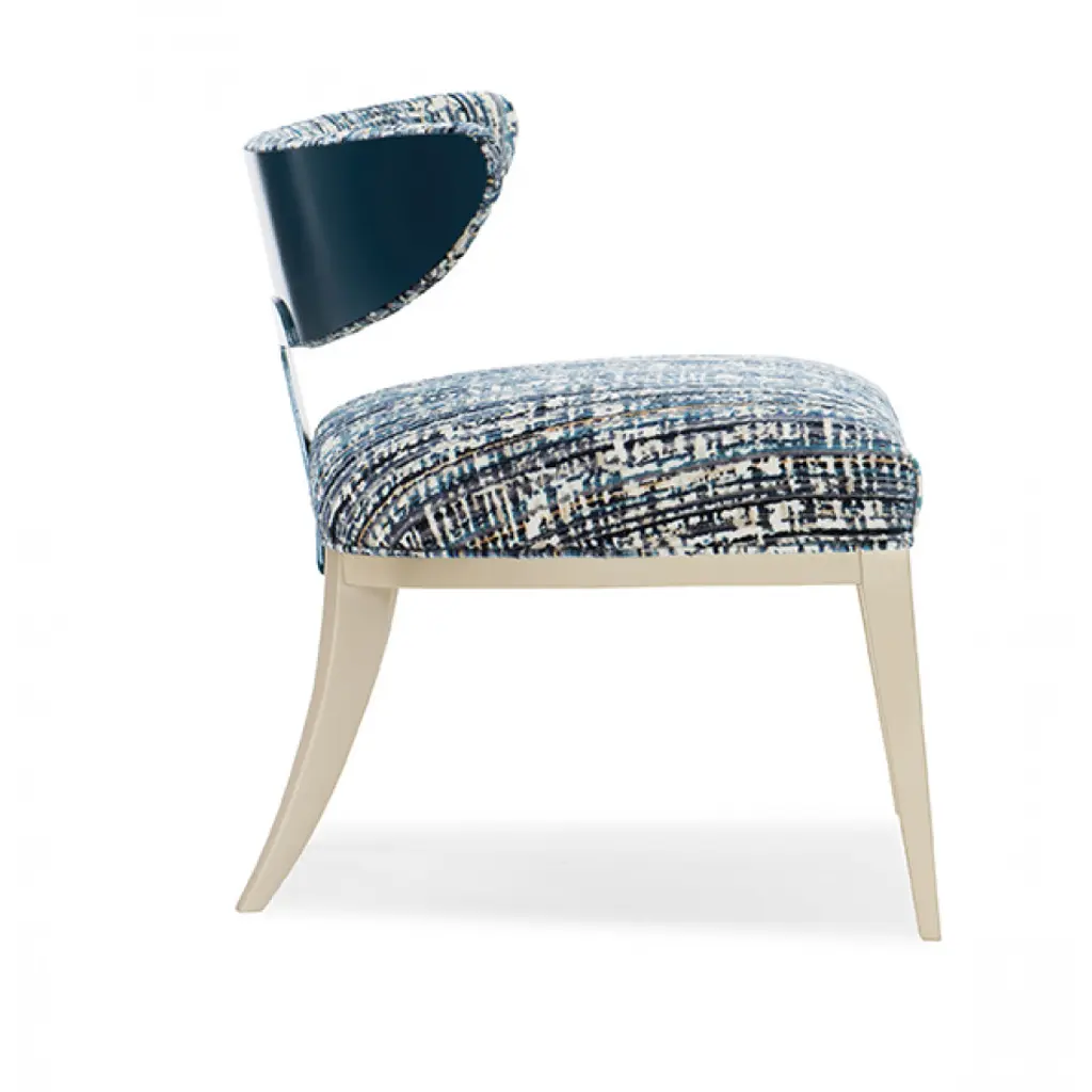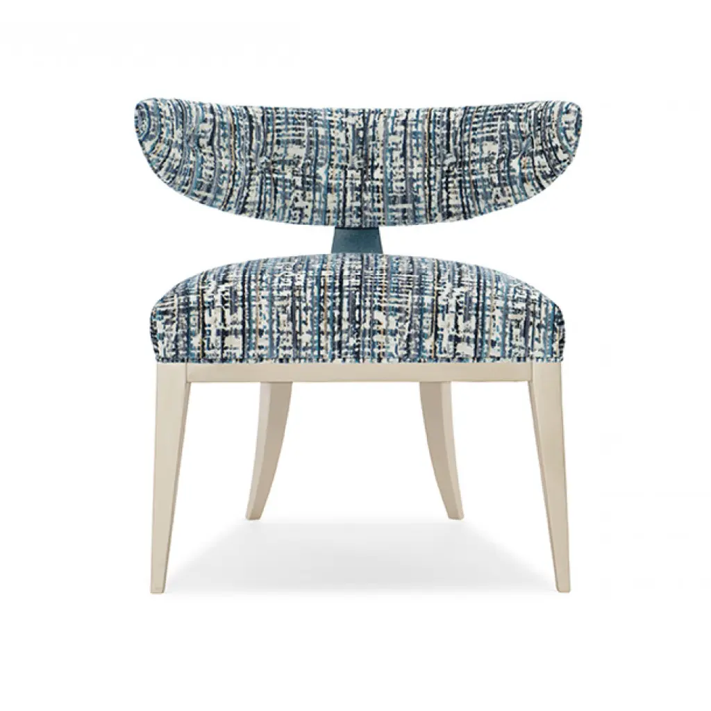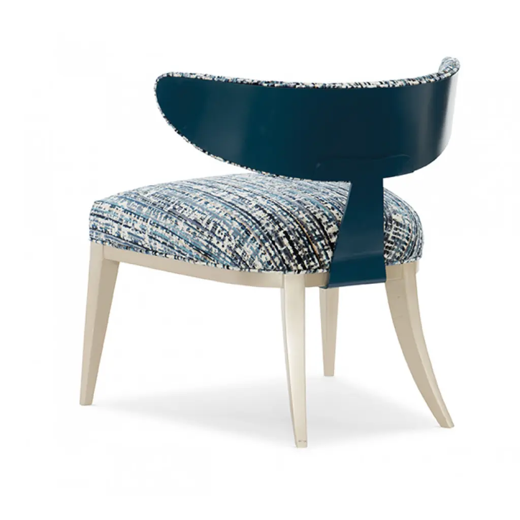 A modern beauty, this shapely chair offers brilliance in every curve. Inspired by the splendor of a geyser erupting with steam and water, it blends shades of cerulean blue and smoke grey with a Dusty Silver finish. Its metal crescent back is finished in a bold shade of cerulean blue and appears to float above its upholstered seat cushion. A richly textured graphic pattern of cerulean and smoke adds depth and dimension to the seat cushion and inside seat back, while button tufting adds a designer touch. Its lasting character feels retro-inspired yet thoroughly fresh and modernized.