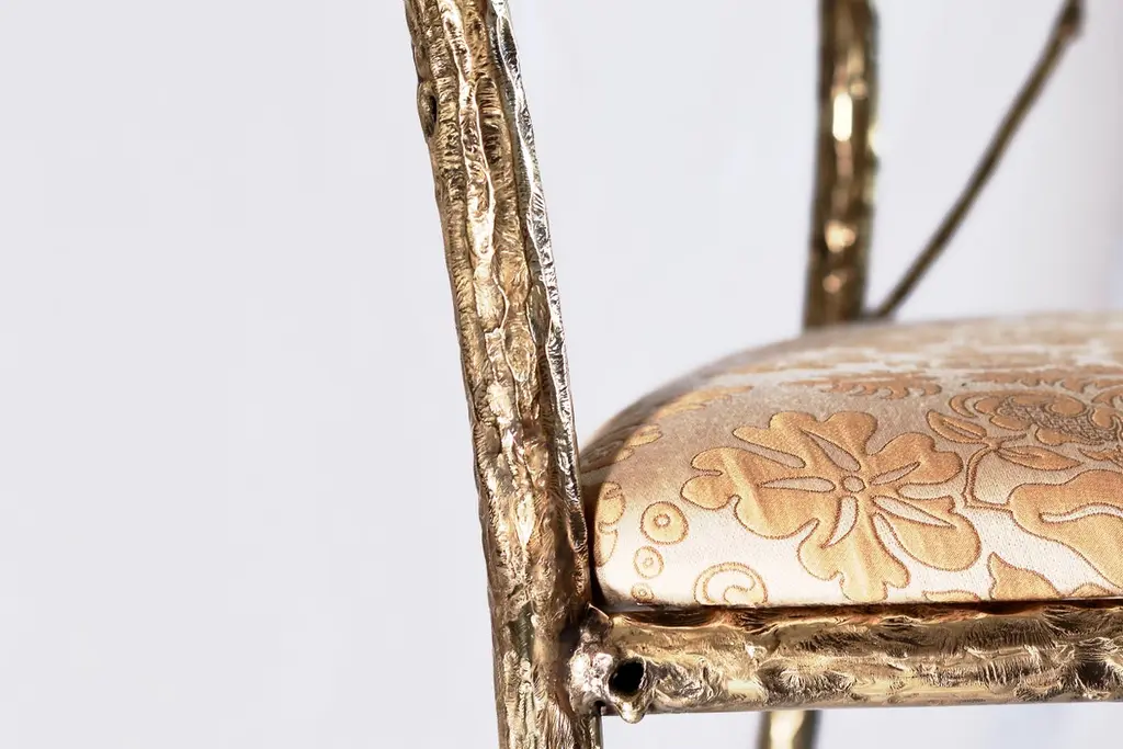 Branches chair by Samuel Costantini.Entirely handmade by the artist.Edition 12 + 1 AP.Measures: W 50 x D 50 x H 75 cm.Materials: curved brass, welded and worked on flame then polished.Like curved vine branches, the structure of the chair resembles their bark. Entirely made of curved brass, welded and worked on flame then polished.It is also possible to apply the upholstery chosen by the customer.Samuel ConstantiniThe ability to create objects lies in the tradition in our hands. In ancient times, they were our only means of realizing our thoughts. Artisan is the one with this ability to breathe life into the raw material. Since Samuel Constantin was a young boy has tried to create the objects of his imagination. He has always believed when you make an object you have created yourself it is possible to bequeath something to that object and that my thoughts can be passed on via my hands.Metal is one of those materials which more than others allows you to give shape to ideas.Connection with the elements is basic when it comes to my objects being born. The principle element is earth, from which metal originates. The natural world around us is a source of inspiration for new techniques and new objects to be shaped. The earth has, over the centuries, already sculptured the most beautiful works of art. The second element is fire which governs metal. Over time he has come to understand that fire is never my servant. You can think that you dominate it, but in reality you never have full control over it. So fire contributes to the creation of objects as if it were a co-artist.The concept of the elements, the link with the territory, the precious metals often obtained from recycled materials, techniques from the past and the search for new ones give the creation all the subtleties it requires. This is the essence of Samuel Constantini's creations.After years of bringing to life the ideas of others, it is now time also to realize our own, giving hands and minds the freedom to experiment and create. There is no production line: every creation is made by hand and exclusively to order, and this enhances the individuality of the pieces, which are all numbered to make each one unique.