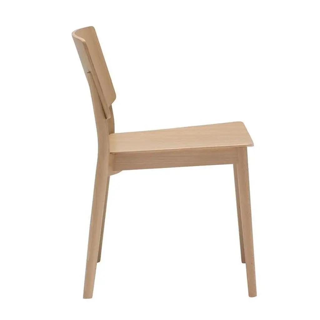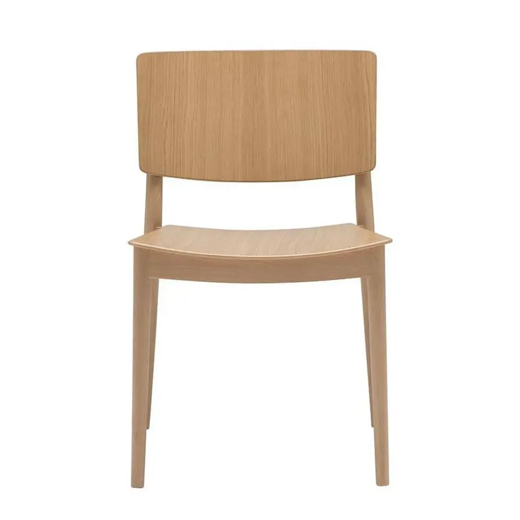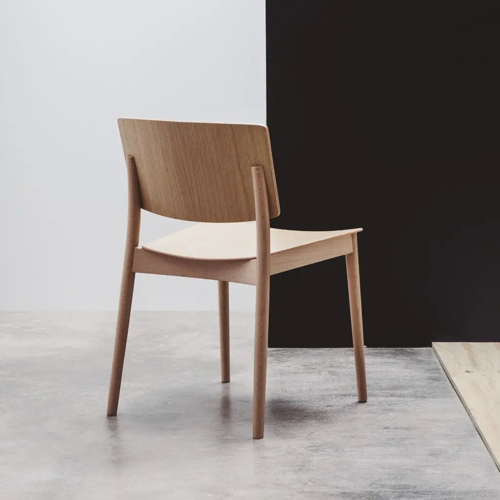 Stackable chair with oak board seat and backrest and solid beech wood frame. Happy is a sturdy chair with a light and serene presence. Its rounded forms give versatility to integrate it into workspace, residential and public projects. The Happy Collection consists of stacking chairs and armchairs constructed from solid beech and oak panels with optional upholstered seat and back.
