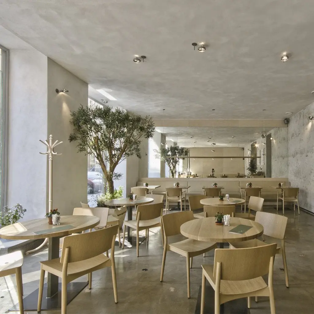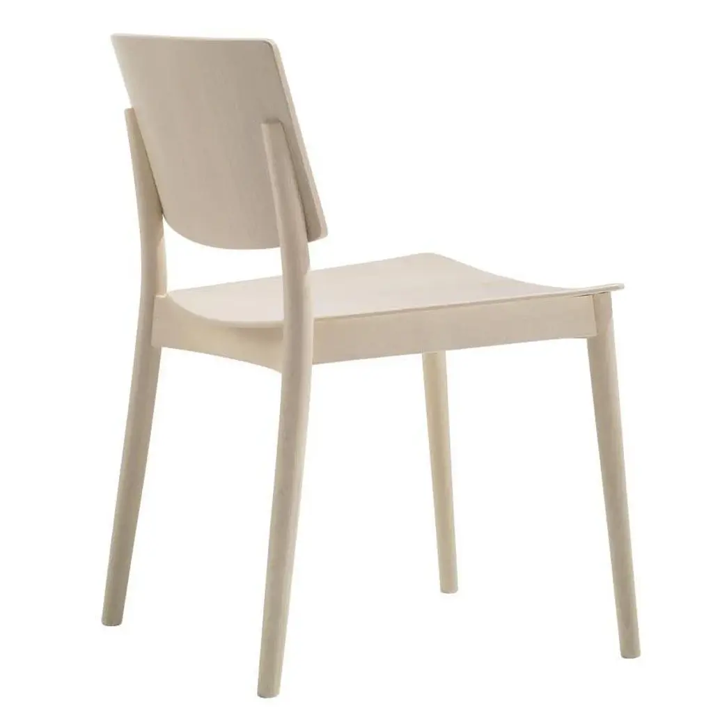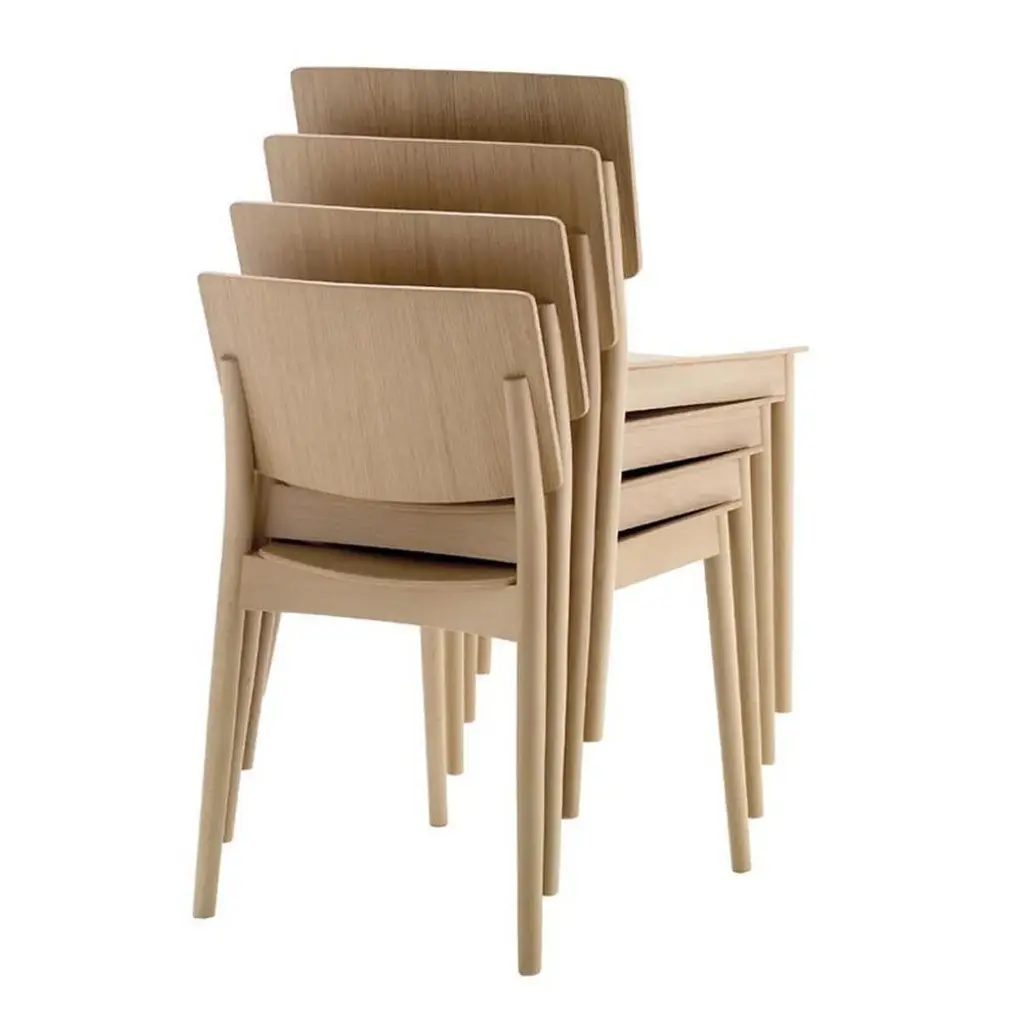 Stackable chair with oak board seat and backrest and solid beech wood frame. Happy is a sturdy chair with a light and serene presence. Its rounded forms give versatility to integrate it into workspace, residential and public projects. The Happy Collection consists of stacking chairs and armchairs constructed from solid beech and oak panels with optional upholstered seat and back.