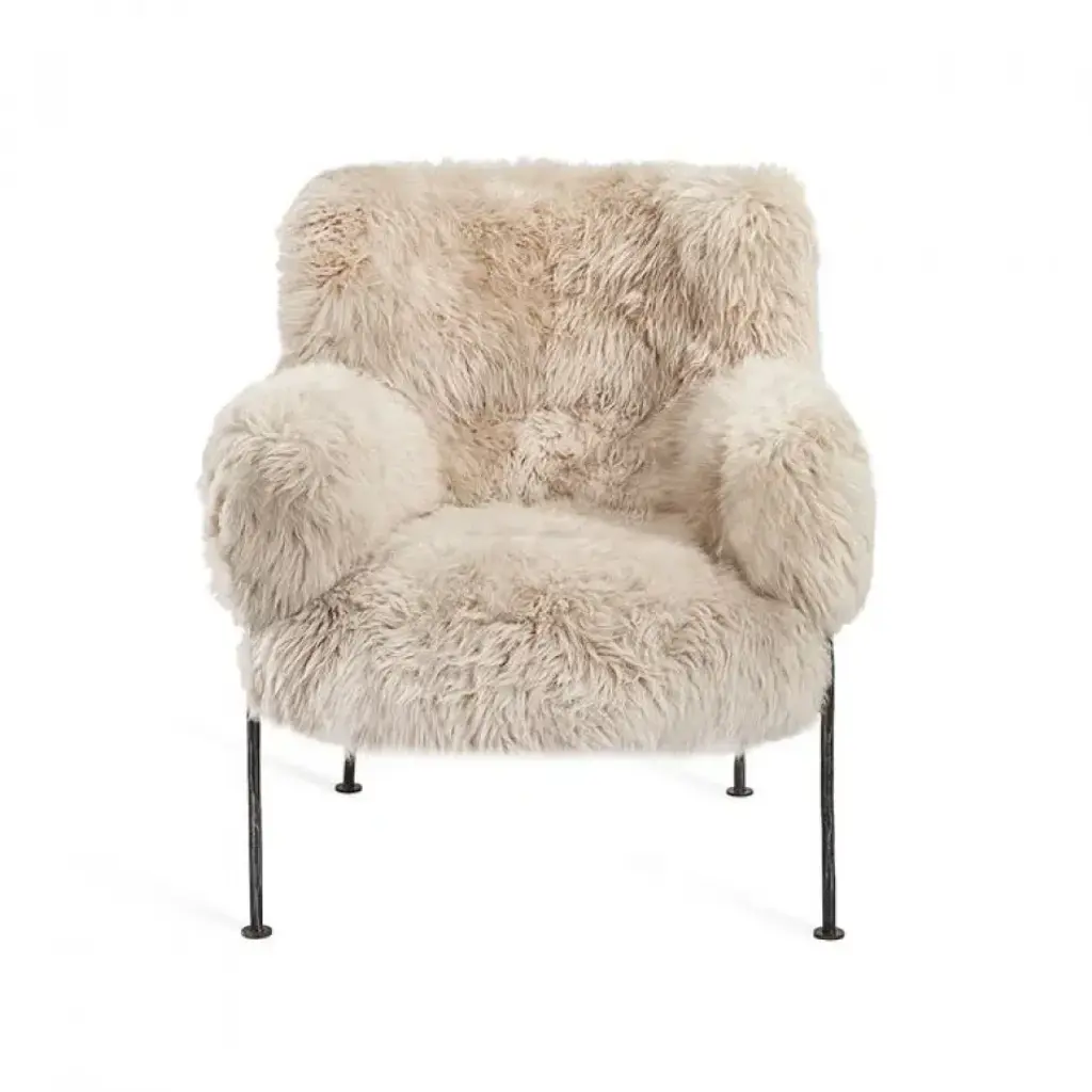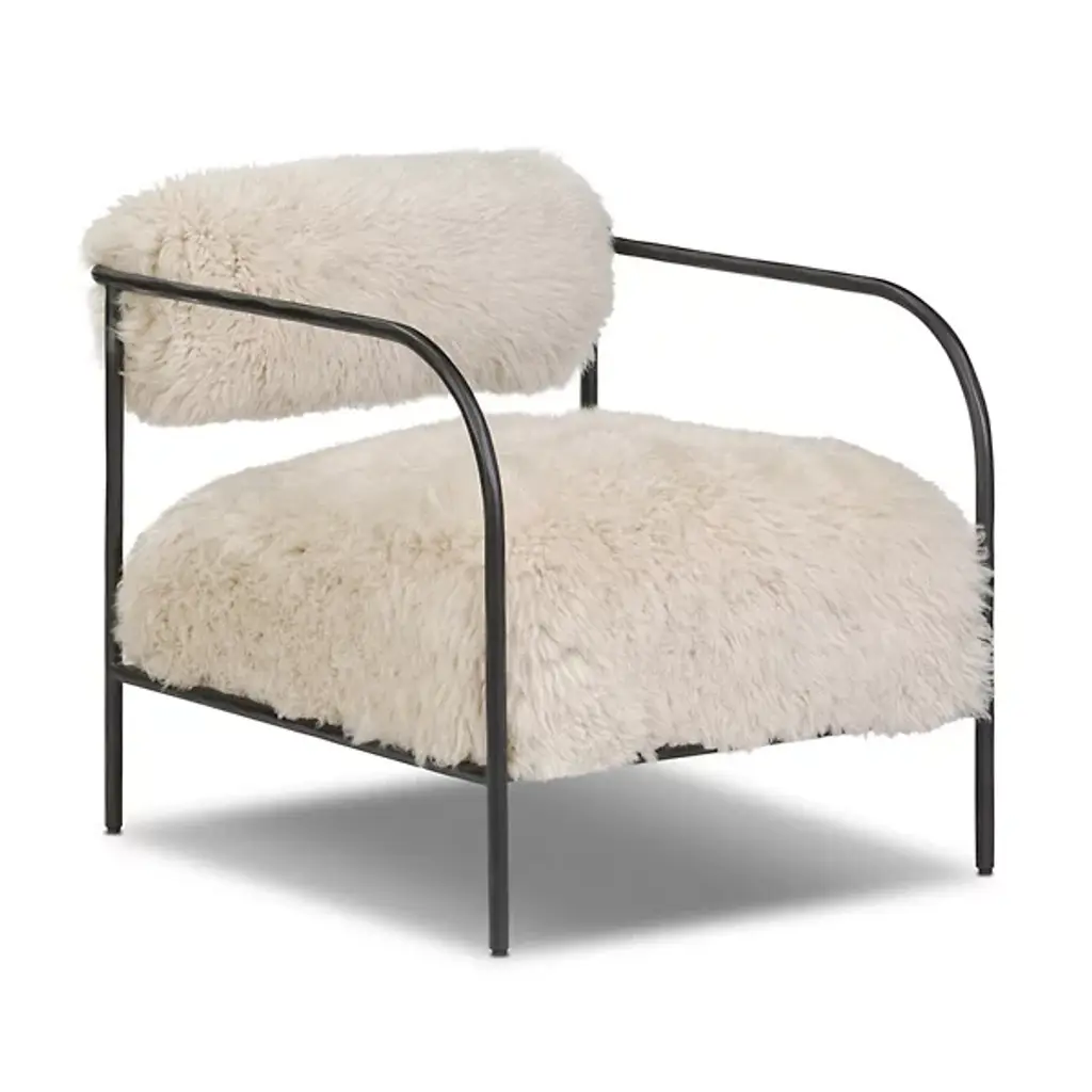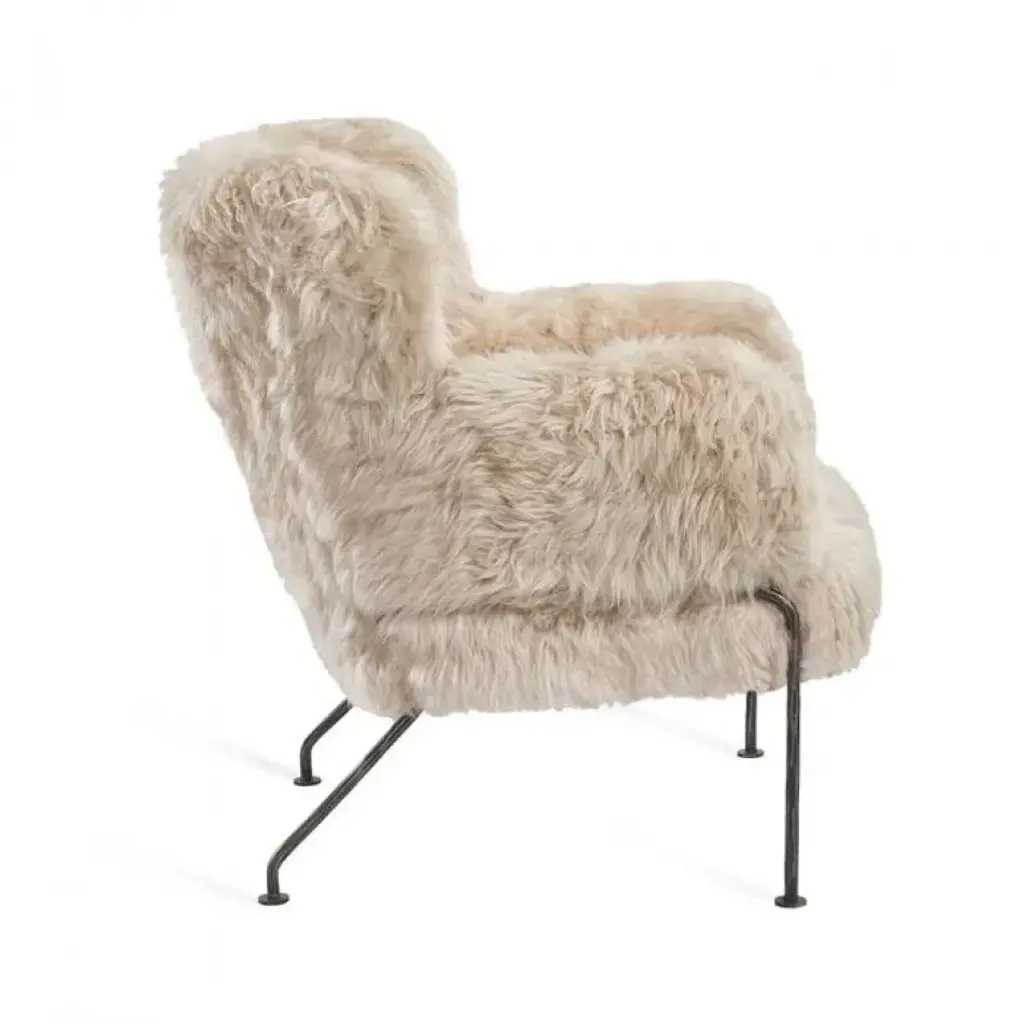 The industrial vibe of black iron contrasts with the luxurious softness of morel taupe Tibetan lambskin in the form of the inviting Harpo Chair. This item is genuine sheepskin. Subtle variations in coloration are to be expected and add to the uniqueness and charm of each piece.