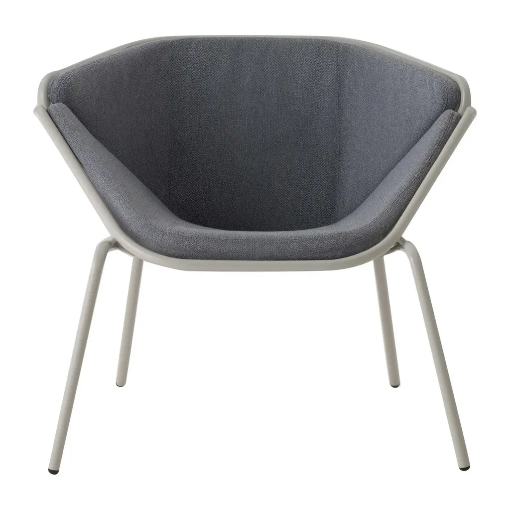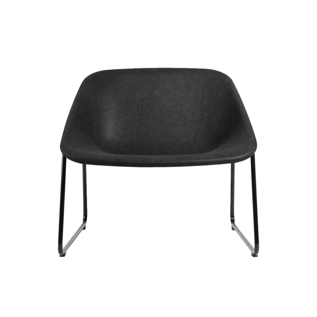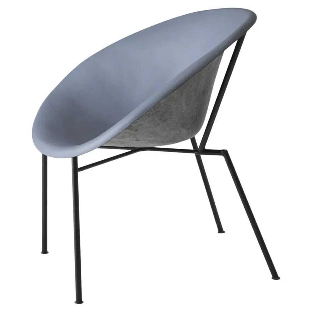 This elegant blue upholstered armchair is completed by a steel sled base painted in matte black.