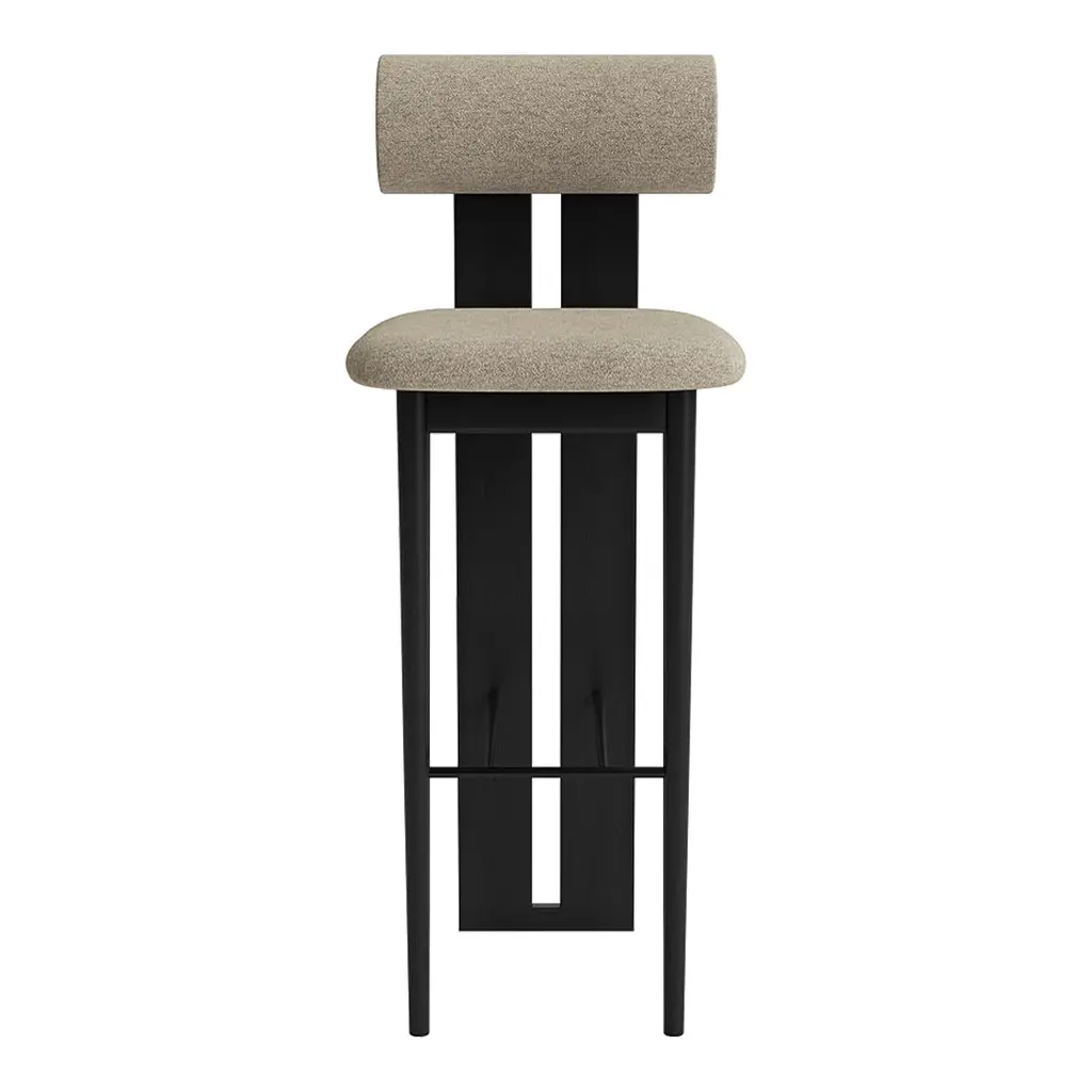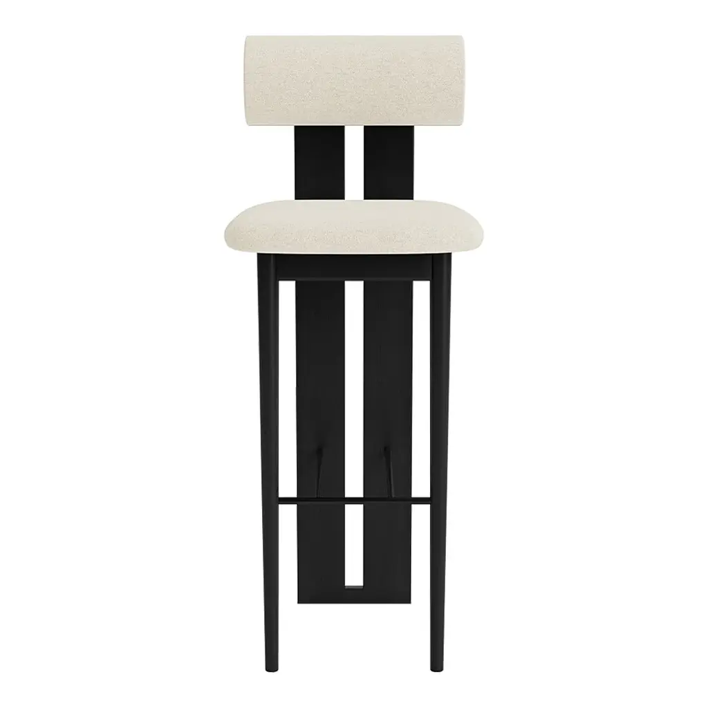 Soft, playful shapes characterize this family of upholstered pieces. Resting on two sturdy wooden legs and seamlessly connecting the seat and back, the Hippo Bar Chair is a bar version of the iconic Hippo Chair. The distinctive wooden profile acts as an almost architectural element that starkly contrasts with the rounded, soft back and seat. The iron footrest provides extra comfort. The Hippo series is influenced by the Hippopotamus mammal drawing upon its barrel-shaped torsos. The characteristic wooden leg profile comes in four different oak finishes; natural, light smoked, dark smoked and black and the seat and back come in a variety of upholstery options. Legs are available in four different FSC certified oak finishes Available in a wide variety of fabrics and leathers Different upholsteries can have different appearances and some fabrics may wrinkle slightly around the curved seat