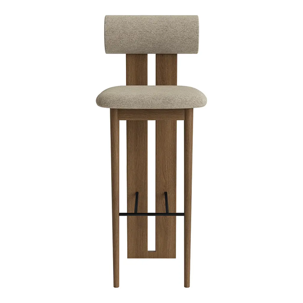 Soft, playful shapes characterize this family of upholstered pieces. Resting on two sturdy wooden legs and seamlessly connecting the seat and back, the Hippo Bar Chair is a bar version of the iconic Hippo Chair. The distinctive wooden profile acts as an almost architectural element that starkly contrasts with the rounded, soft back and seat. The iron footrest provides extra comfort. The Hippo series is influenced by the Hippopotamus mammal drawing upon its barrel-shaped torsos. The characteristic wooden leg profile comes in four different oak finishes; natural, light smoked, dark smoked and black and the seat and back come in a variety of upholstery options. Legs are available in four different FSC certified oak finishes Available in a wide variety of fabrics and leathers Different upholsteries can have different appearances and some fabrics may wrinkle slightly around the curved seat