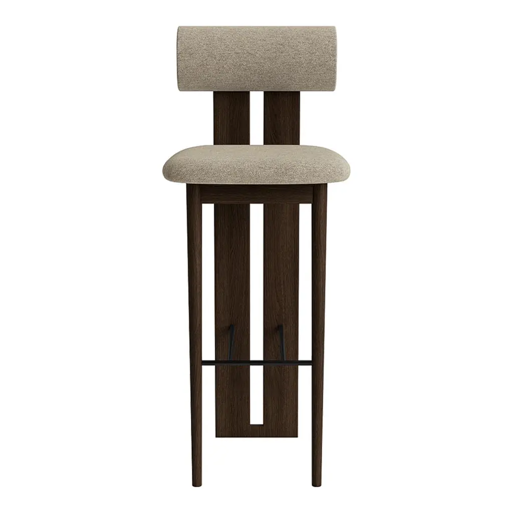 Soft, playful shapes characterize this family of upholstered pieces. Resting on two sturdy wooden legs and seamlessly connecting the seat and back, the Hippo Bar Chair is a bar version of the iconic Hippo Chair. The distinctive wooden profile acts as an almost architectural element that starkly contrasts with the rounded, soft back and seat. The iron footrest provides extra comfort. The Hippo series is influenced by the Hippopotamus mammal drawing upon its barrel-shaped torsos. The characteristic wooden leg profile comes in four different oak finishes; natural, light smoked, dark smoked and black and the seat and back come in a variety of upholstery options. Legs are available in four different FSC certified oak finishes Available in a wide variety of fabrics and leathers Different upholsteries can have different appearances and some fabrics may wrinkle slightly around the curved seat