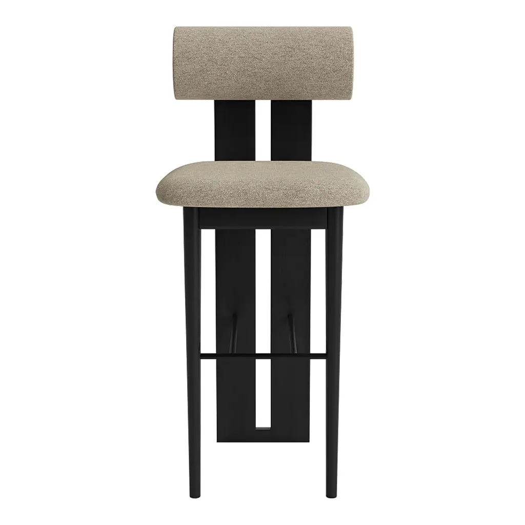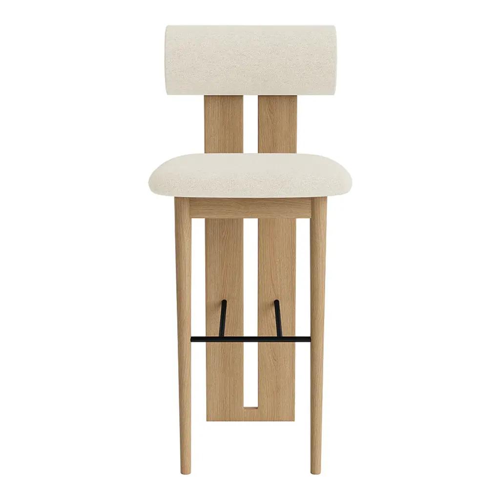 Soft, playful shapes characterize this family of upholstered pieces. Resting on two sturdy wooden legs and seamlessly connecting the seat and back, the Hippo Counter Chair is a counter version of the iconic Hippo Chair. The distinctive wooden profile acts as an almost architectural element that starkly contrasts with the rounded, soft back and seat. The iron footrest provides extra comfort. The Hippo series is influenced by the Hippopotamus mammal drawing upon its barrel-shaped torsos. The characteristic wooden leg profile comes in four different oak finishes; natural, light smoked, dark smoked and black and the seat and back come in a variety of upholstery options. Legs are available in four different FSC certified oak finishes Available in a wide variety of fabrics and leathers Different upholsteries can have different appearances and some fabrics may wrinkle slightly around the curved seat