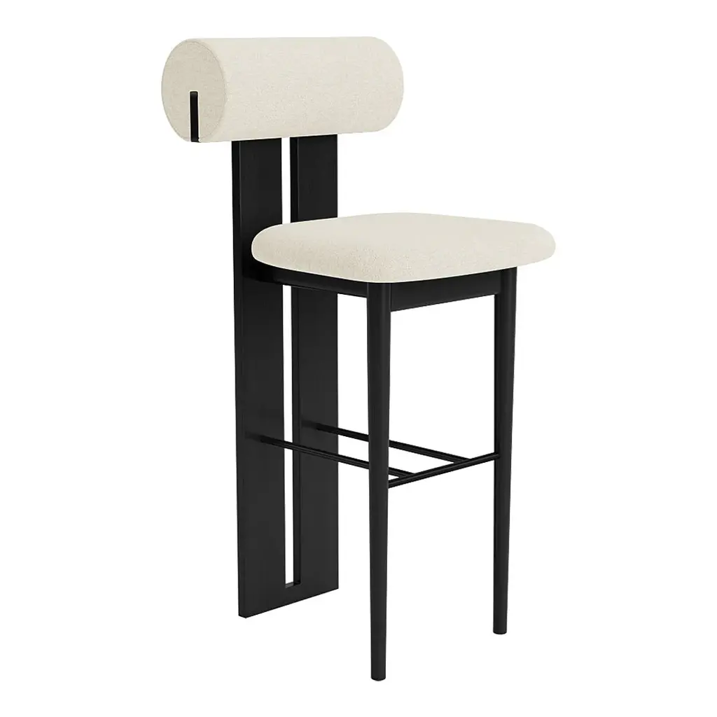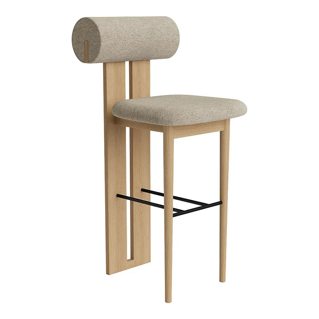 Soft, playful shapes characterize this family of upholstered pieces. Resting on two sturdy wooden legs and seamlessly connecting the seat and back, the Hippo Counter Chair is a counter version of the iconic Hippo Chair. The distinctive wooden profile acts as an almost architectural element that starkly contrasts with the rounded, soft back and seat. The iron footrest provides extra comfort. The Hippo series is influenced by the Hippopotamus mammal drawing upon its barrel-shaped torsos. The characteristic wooden leg profile comes in four different oak finishes; natural, light smoked, dark smoked and black and the seat and back come in a variety of upholstery options. Legs are available in four different FSC certified oak finishes Available in a wide variety of fabrics and leathers Different upholsteries can have different appearances and some fabrics may wrinkle slightly around the curved seat