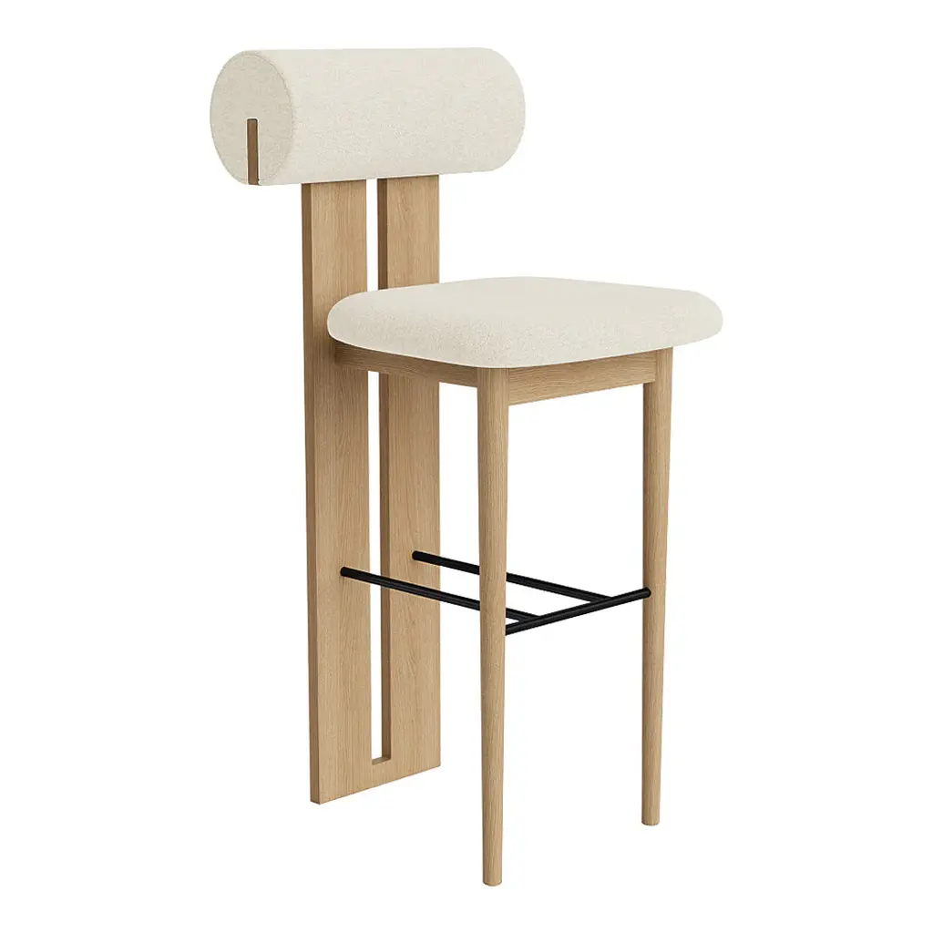 Soft, playful shapes characterize this family of upholstered pieces. Resting on two sturdy wooden legs and seamlessly connecting the seat and back, the Hippo Counter Chair is a counter version of the iconic Hippo Chair. The distinctive wooden profile acts as an almost architectural element that starkly contrasts with the rounded, soft back and seat. The iron footrest provides extra comfort. The Hippo series is influenced by the Hippopotamus mammal drawing upon its barrel-shaped torsos. The characteristic wooden leg profile comes in four different oak finishes; natural, light smoked, dark smoked and black and the seat and back come in a variety of upholstery options. Legs are available in four different FSC certified oak finishes Available in a wide variety of fabrics and leathers Different upholsteries can have different appearances and some fabrics may wrinkle slightly around the curved seat