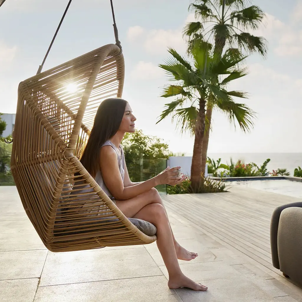 Hive chair is a sculptural silhouette, which can easily be the focal point in any outdoor space, either alone or in a group. It is designed by the Danish duo Foersom + Hiort-Lorenzen MDD. Hive is inspired by the beehive shape offering an embracing structure and design for you to have a haven for focus, reflection and relaxation. Hive is made from the weather-resistant Cane-line Weave ® in an artistic and transparent wicker pattern. You can choose to hang the chair up with a strong rope or place it on a solid base, which comes in teak and aluminium. The Hive chair comes with comfy cushions, and an adjustable neck cushion to provide maximum comfort. The cushions include QuickDry + Airflow system, ensuring you have dry cushions approximately 1 hour after a downpour.
